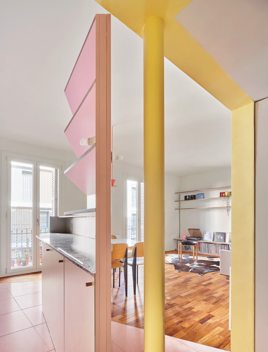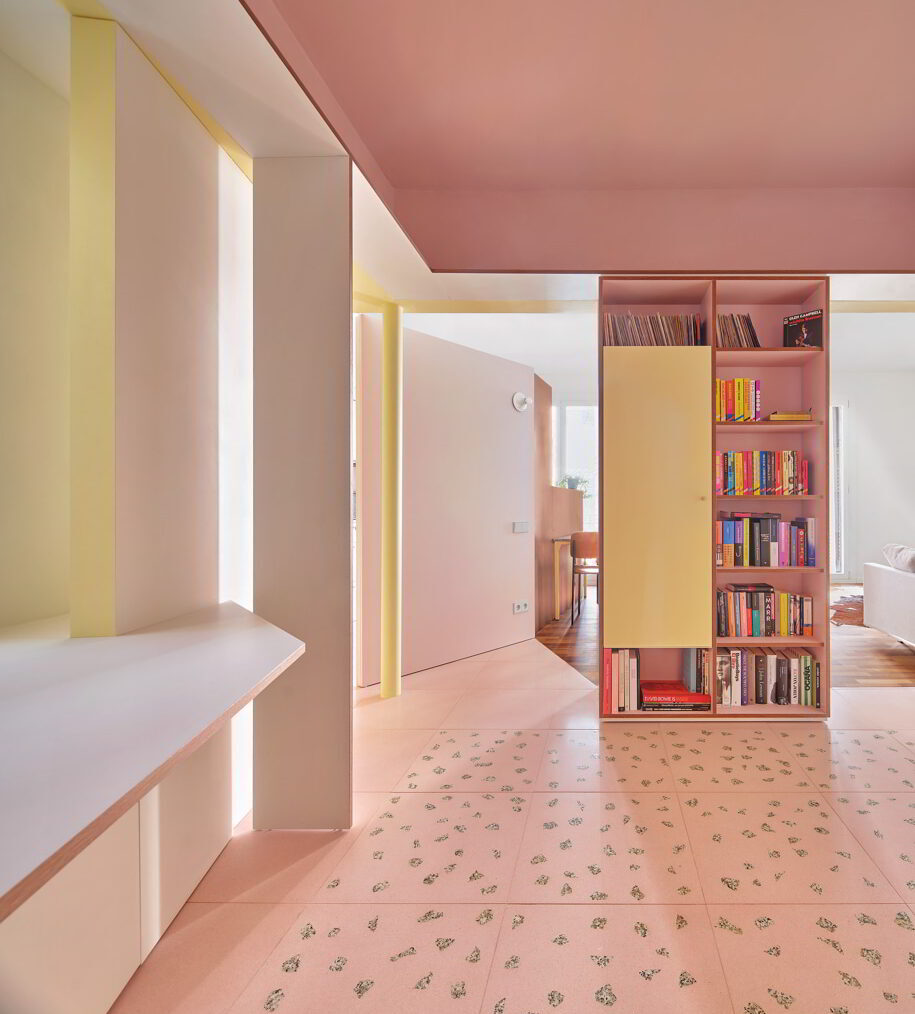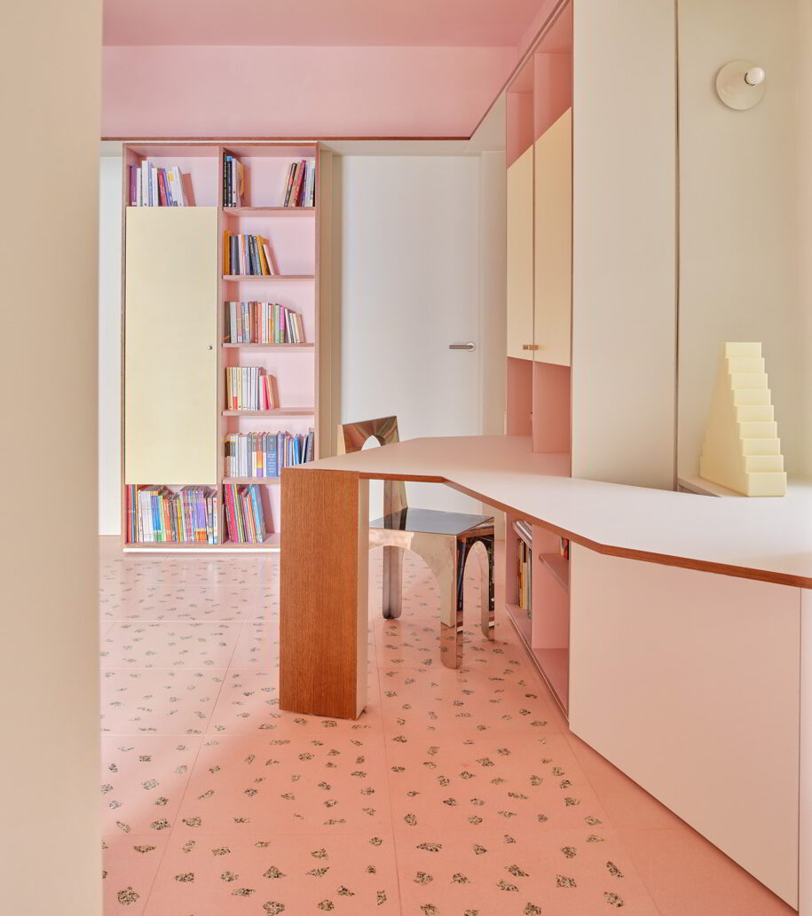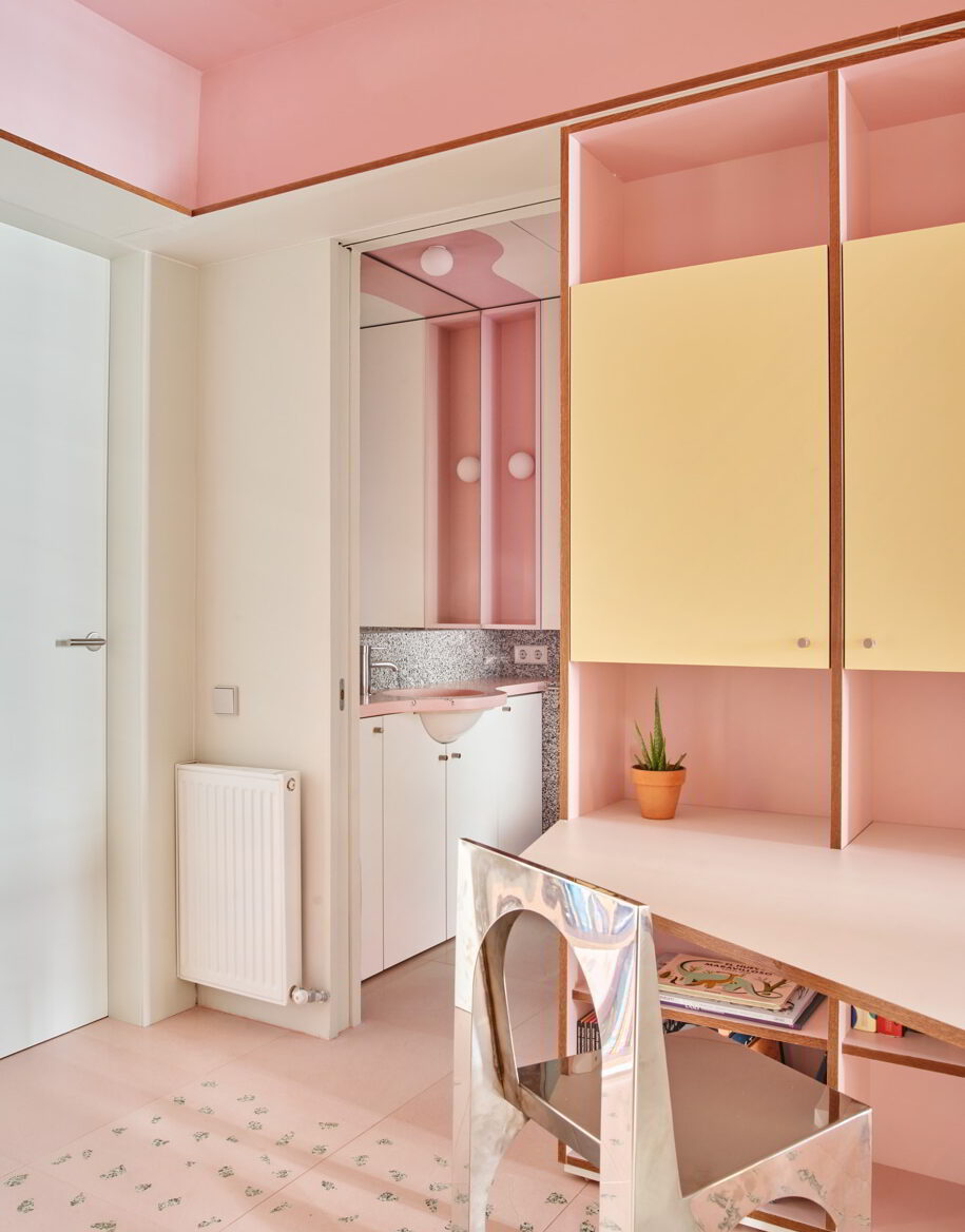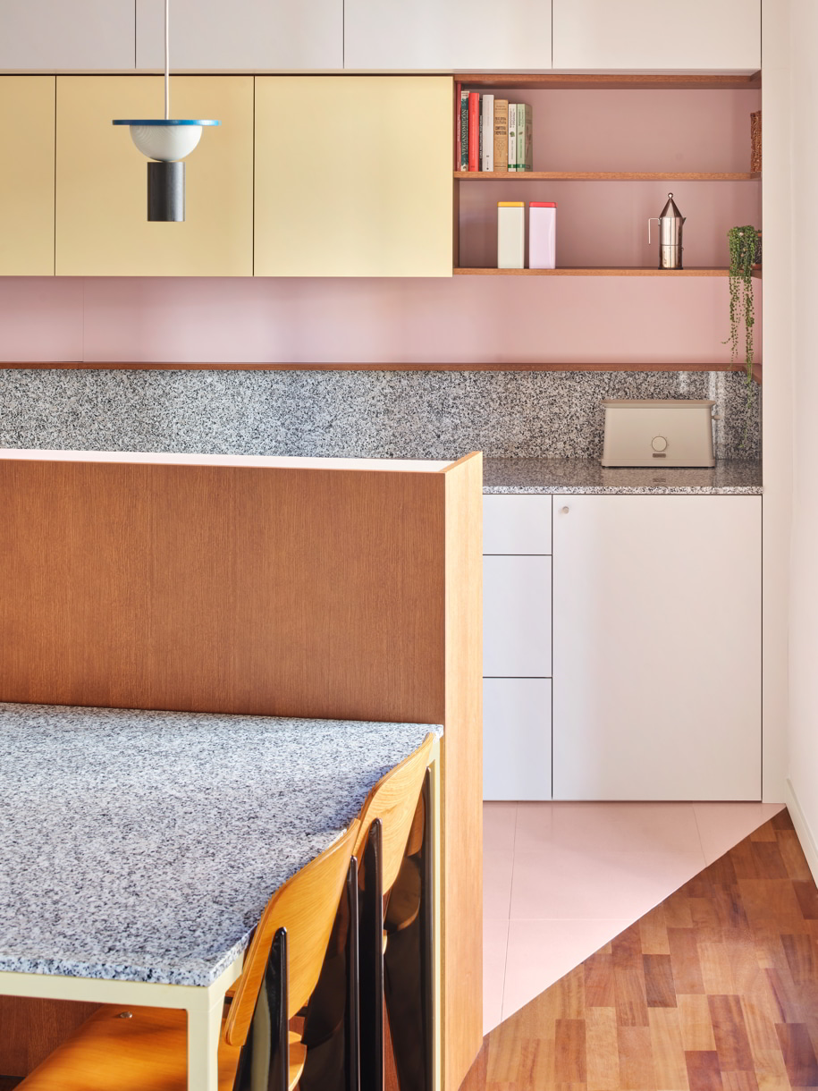 This break is also caused by the material and chromatic choice of the interior set and its application in a pop collage style, which is related to the owners’ personality and lifestyle. In this sense, a variety of materials are introduced, such as national granite, terrazzo, iroko wood parquet, melamine, mirrors, wood veneers and paint, often intertwining, as in the case of the stone “carpet” of the central space, made with pieces of pink terrazzo with large chips of national granite.