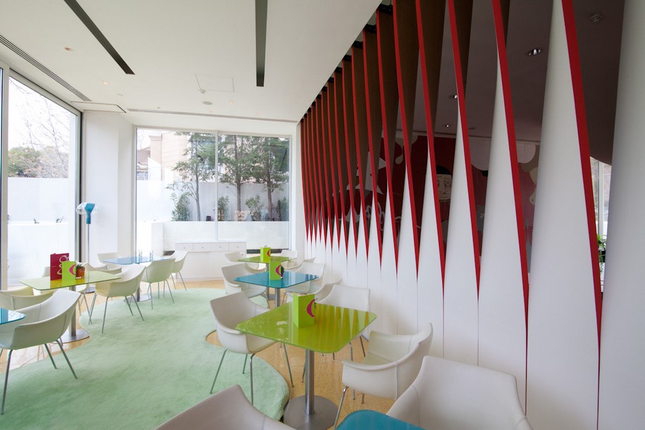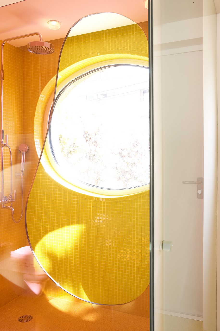 As if forming a wave of joie de vivre, Karim’s trademark wavelength sofas resemble, in their black and white version, pouting lips. Candy-coloured armchairs sit prettily on the custom-made carpets, the glossy plastic tables adding extra pizzazz. Throughout, Karim’s trademark curvy shapes take hold, unifying the hotel’s interiors, and energizing its public spaces.