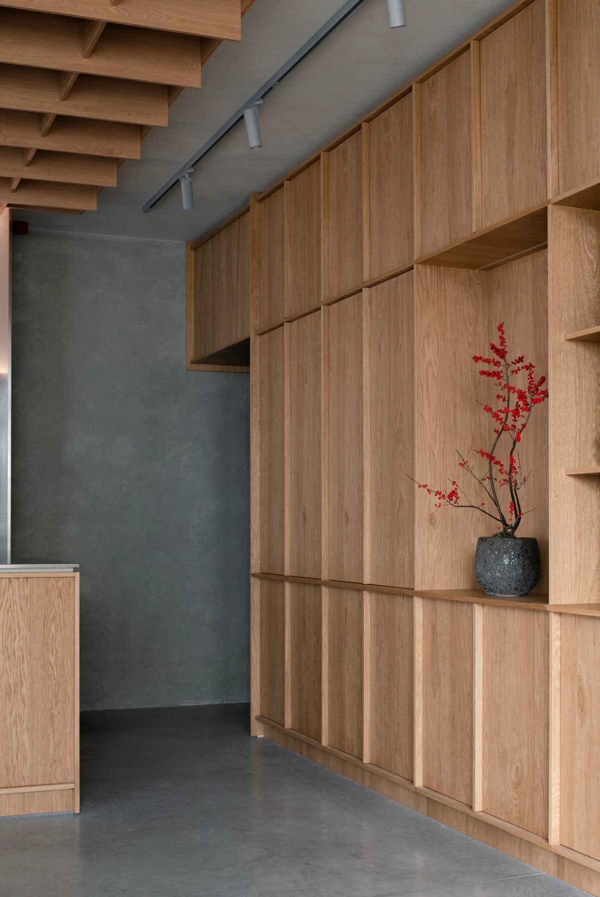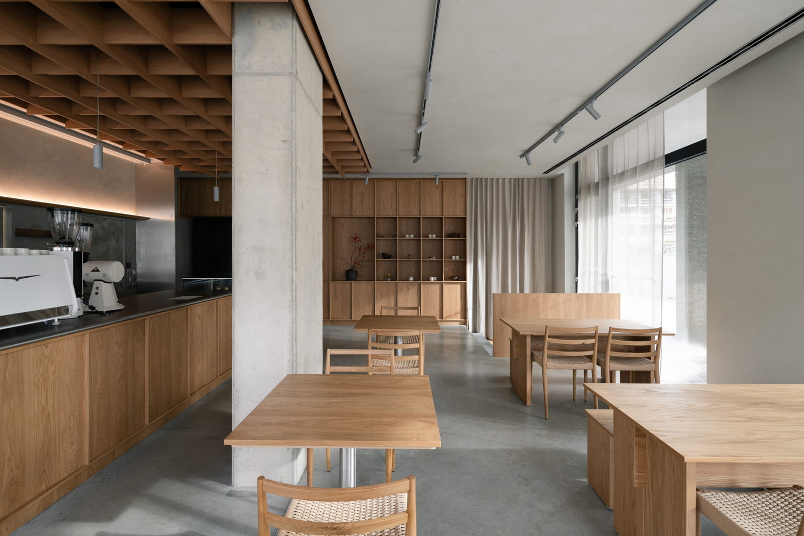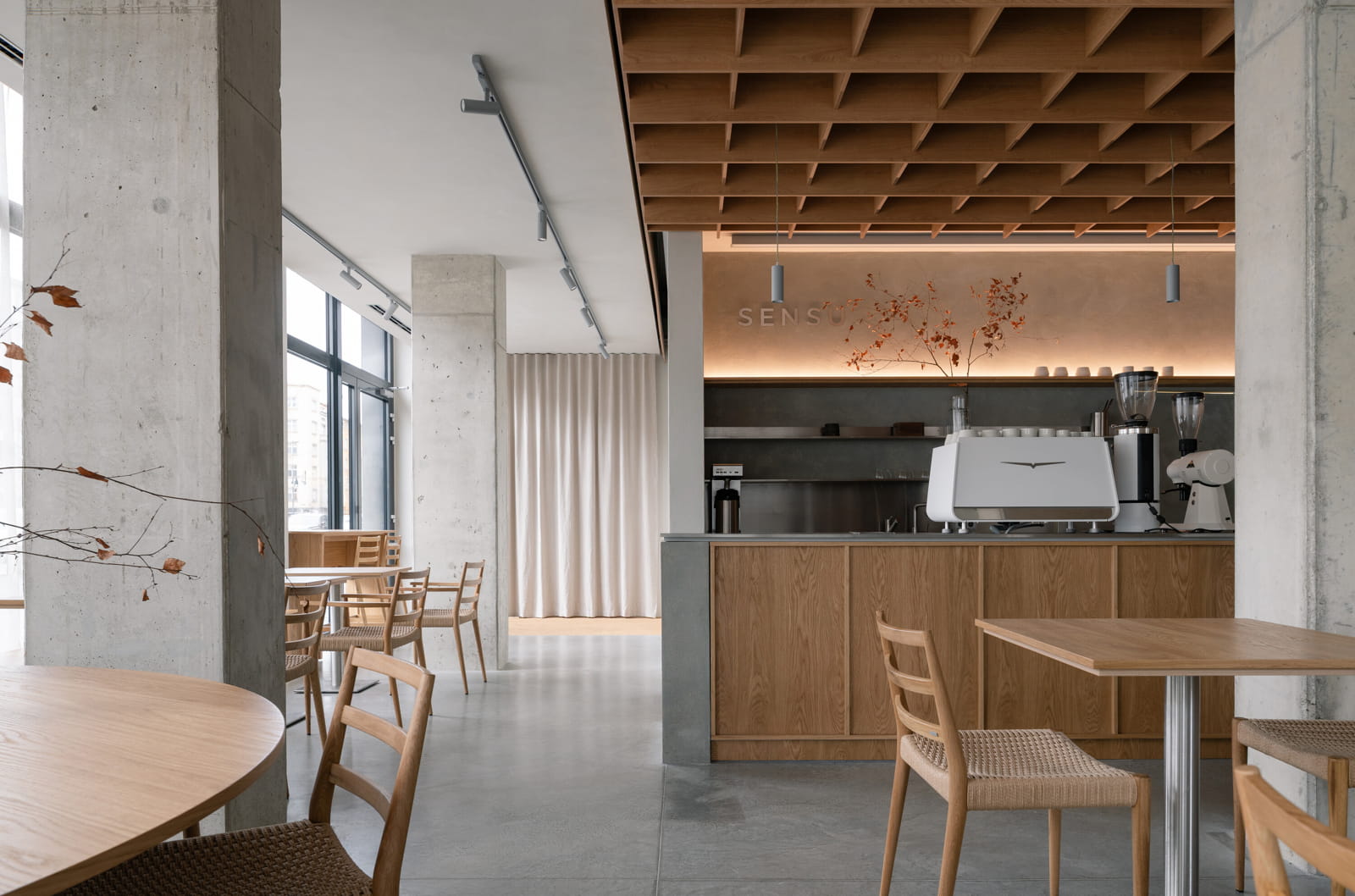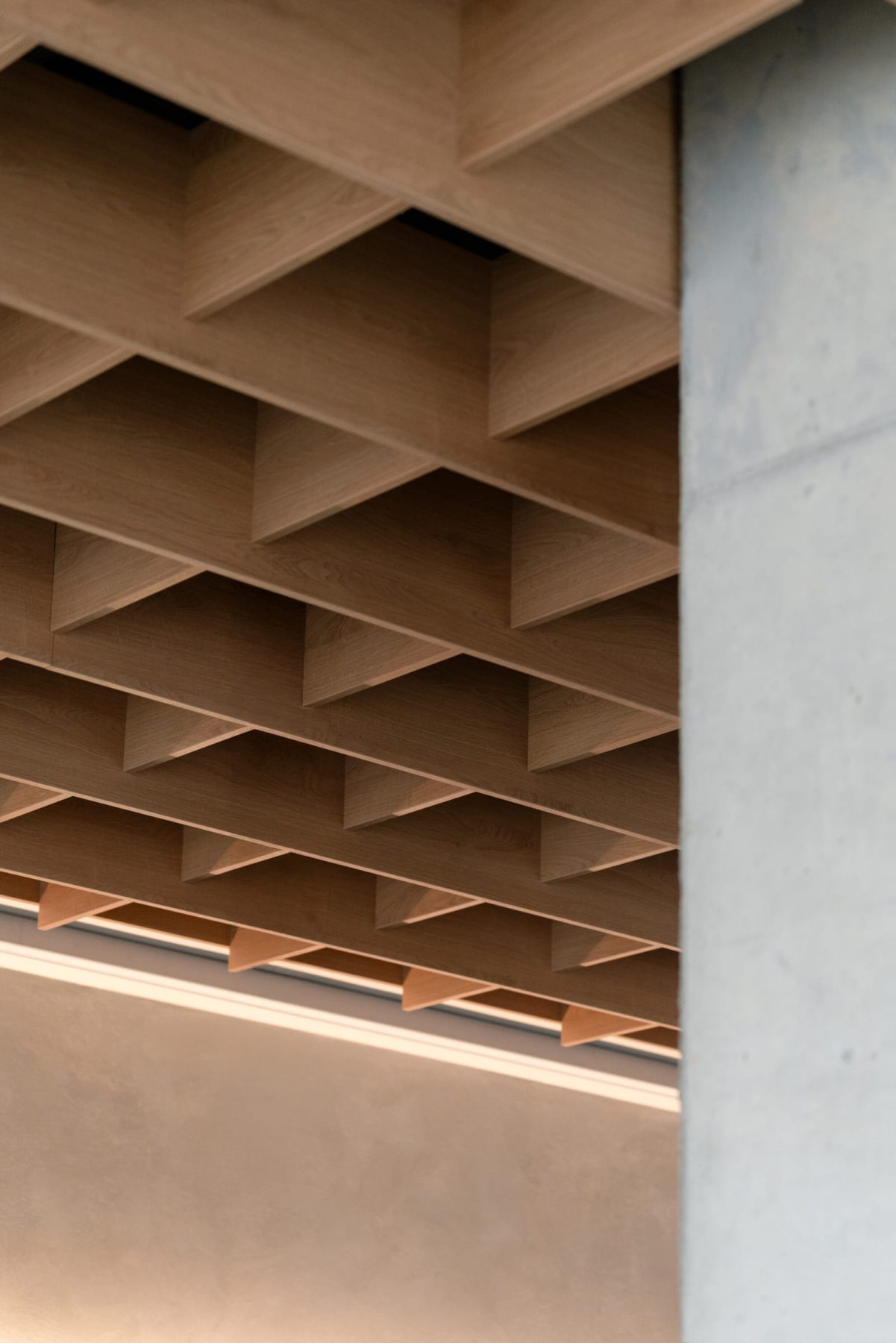 All energy and resources are spent efficiently and practically. The raster ceiling over the bar solves the acoustics above the coffee machine, allowing the air conditioning to function properly, and its deep shadows add weight to the bar.