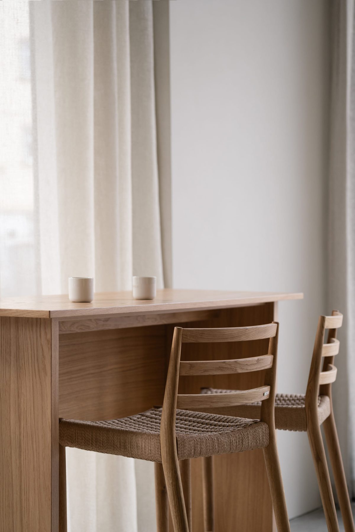 The natural and earthy tones of the furniture make the colourful matcha and sweets stand out.