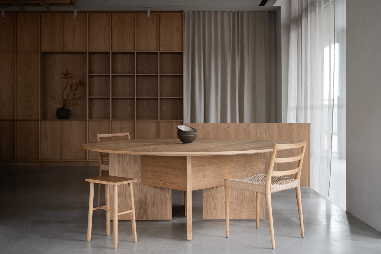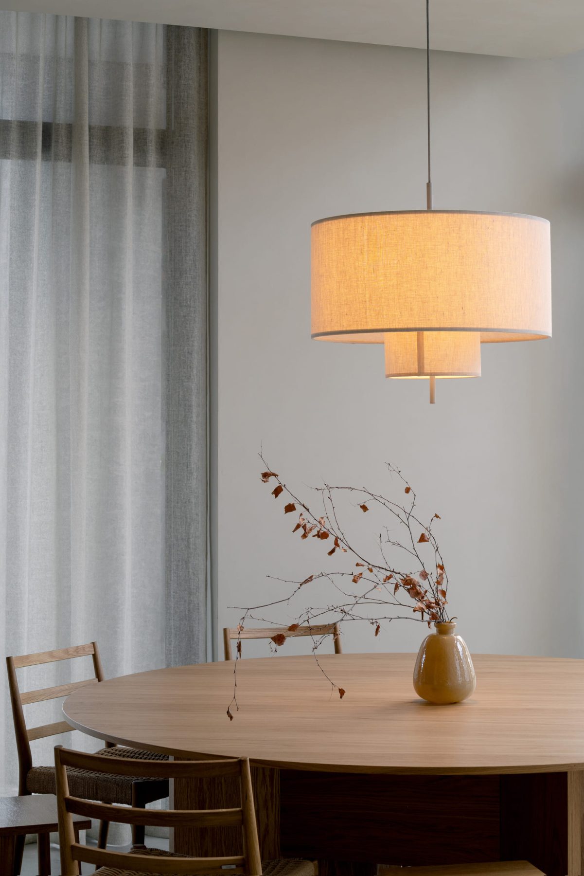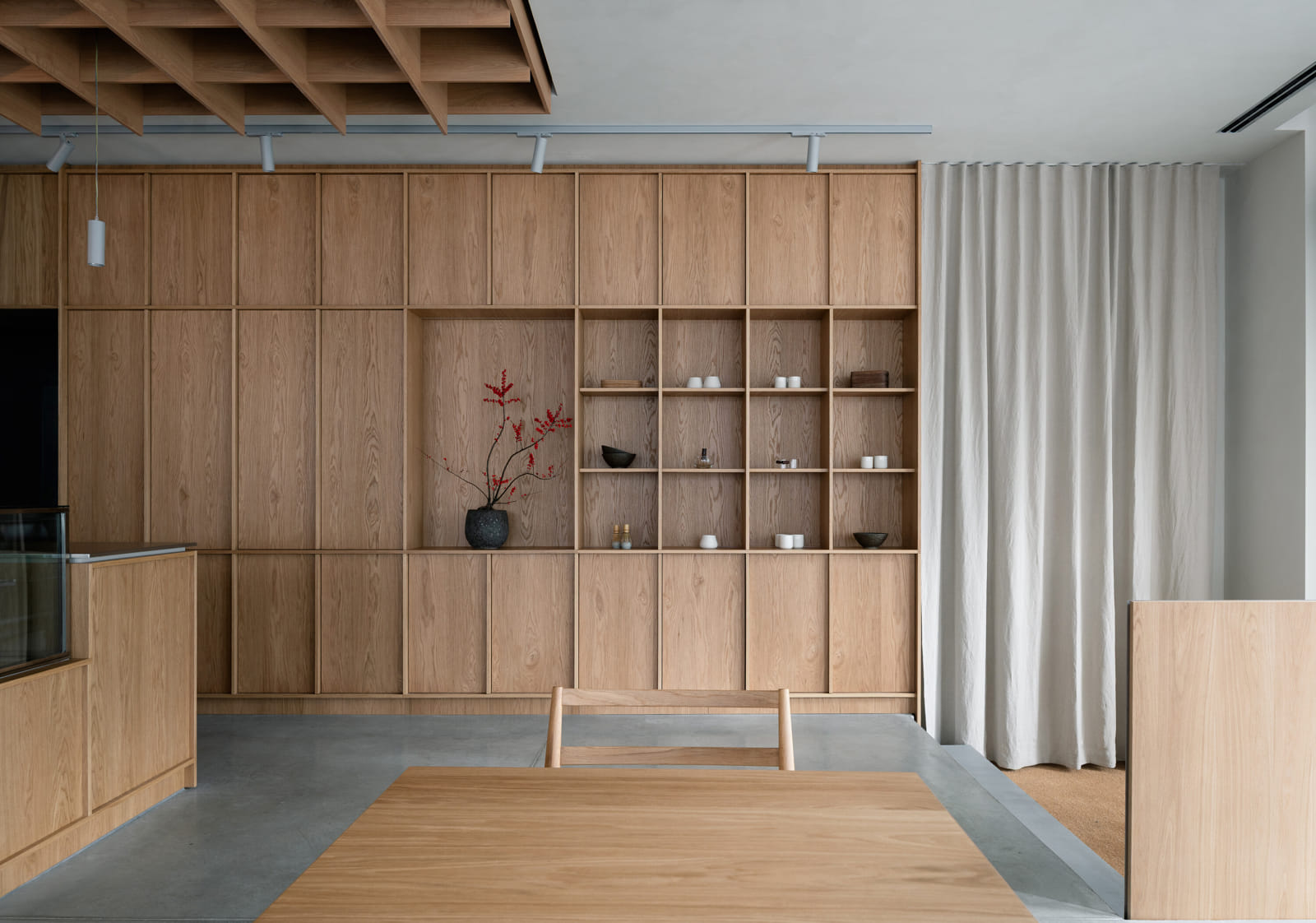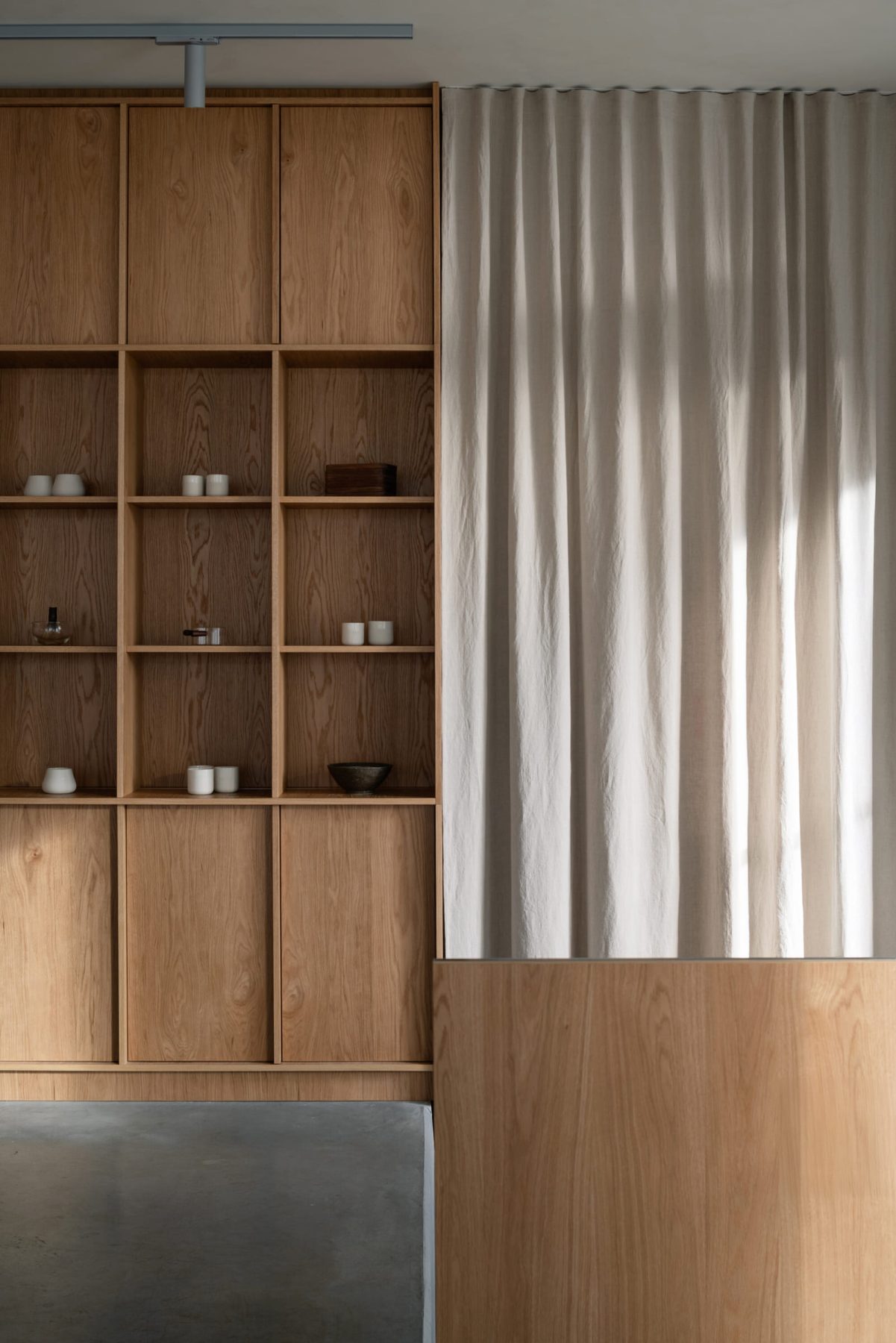 The interior is based on a temperate palette of materials. Wood, linen, concrete and glass.