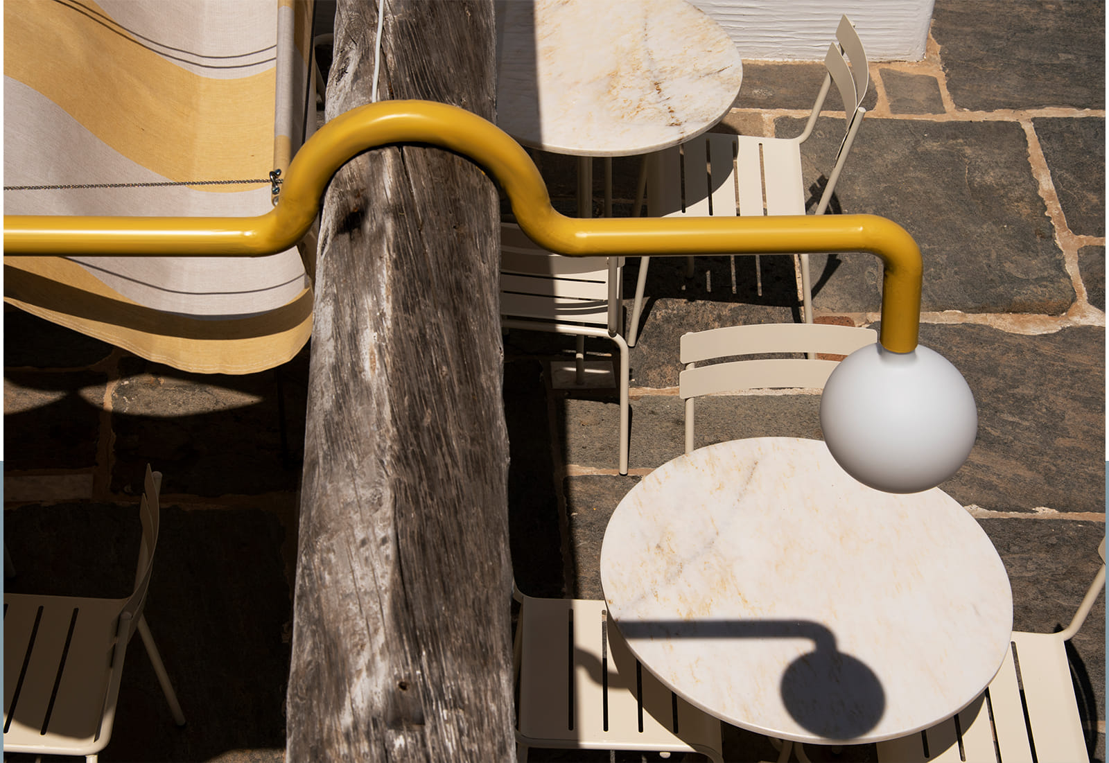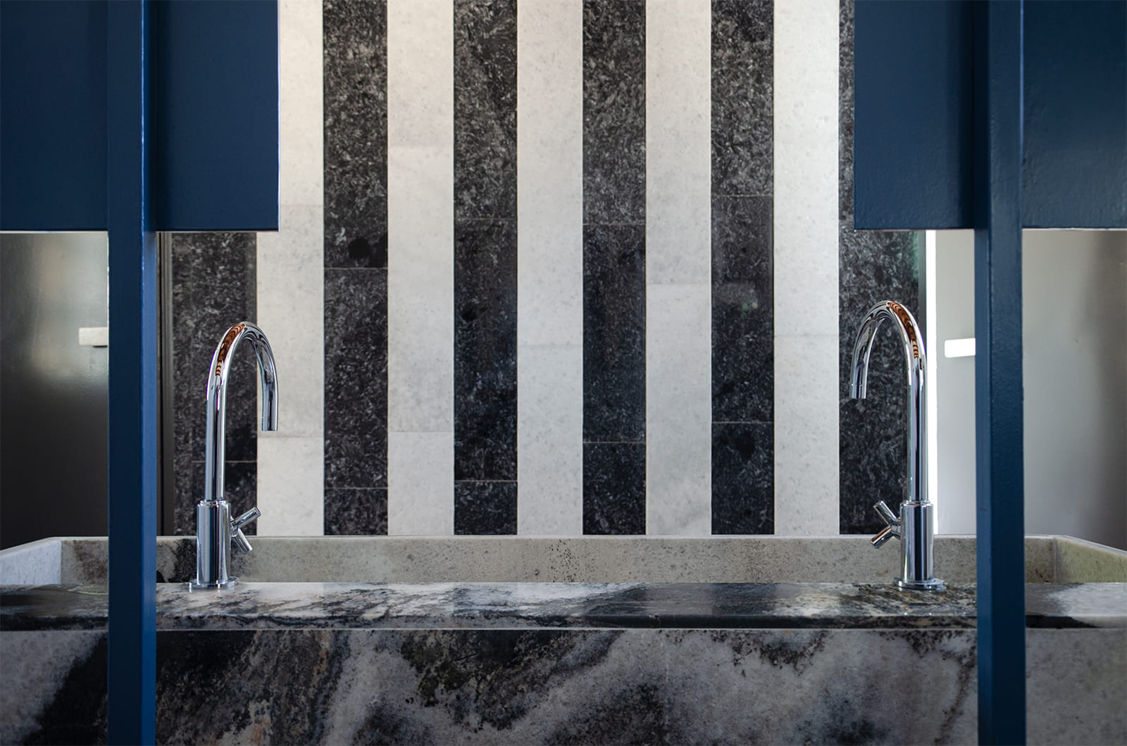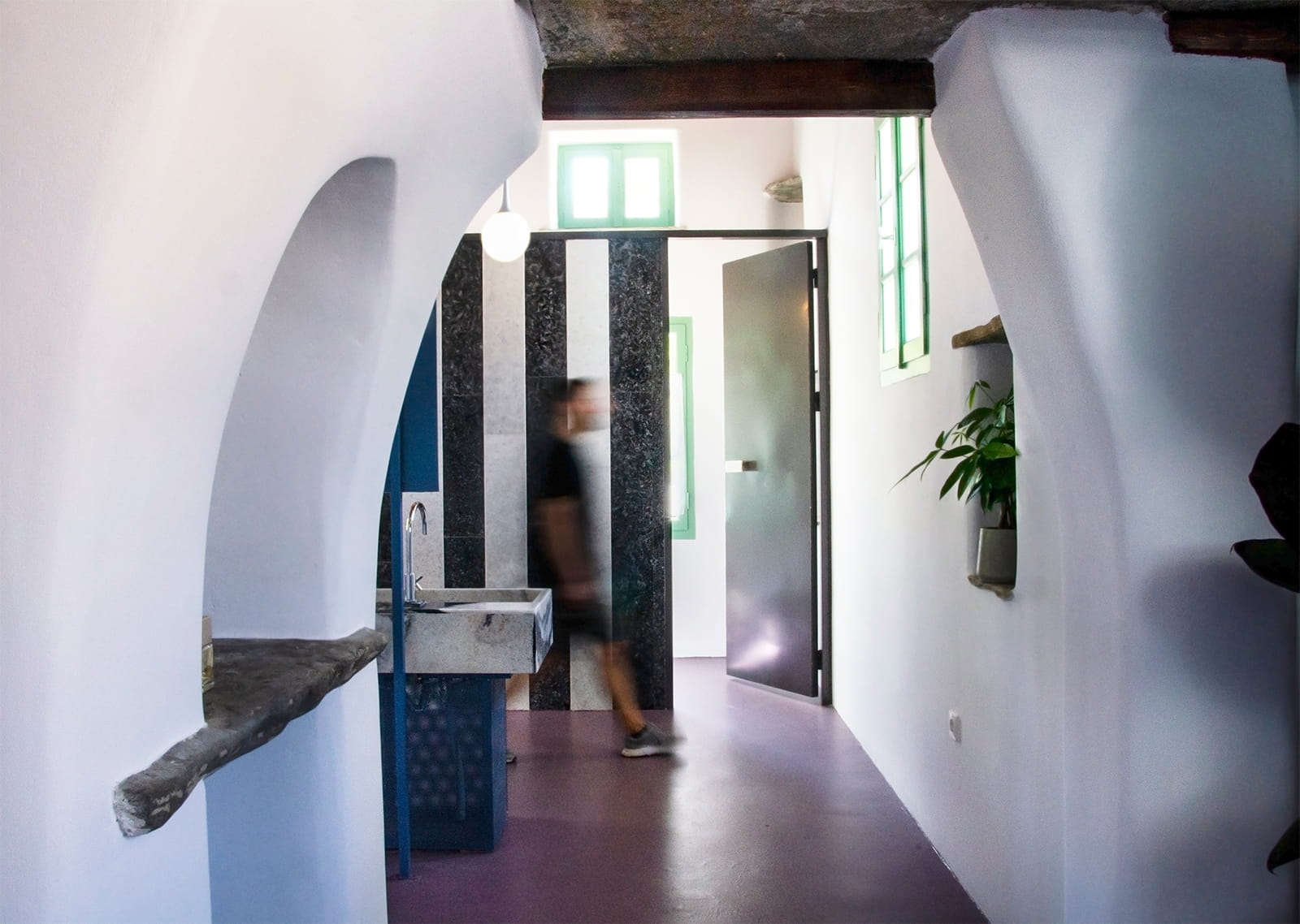 Tinos is well known for its queries, its marbles and its exceptional sculptors. This material tradition was part of the design. Different types of marbles and stones from Tinos or from nearby places are used for a washbasin, benches, tables, shelves. Marbles are turning into living patterns and collaborate with each other.