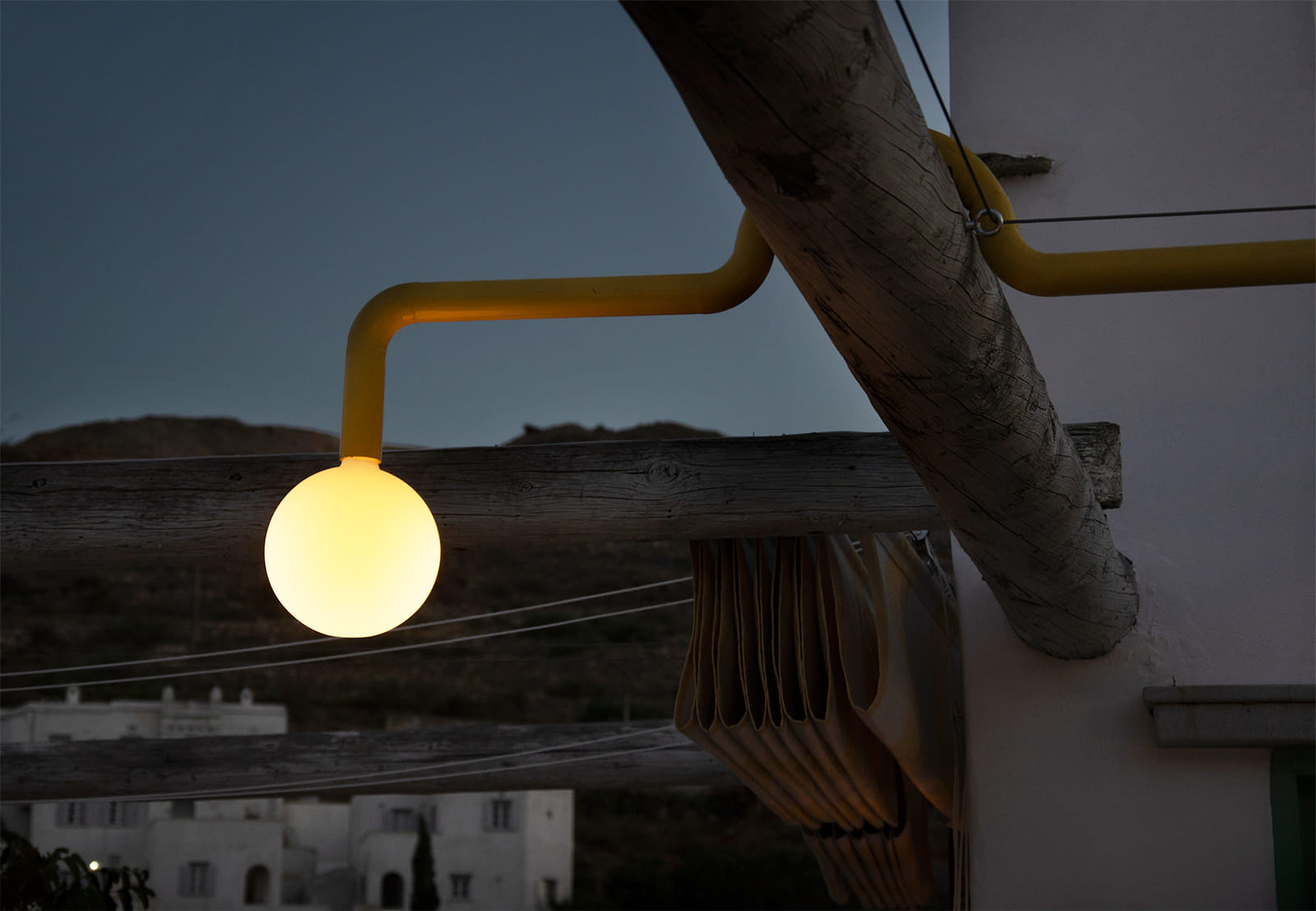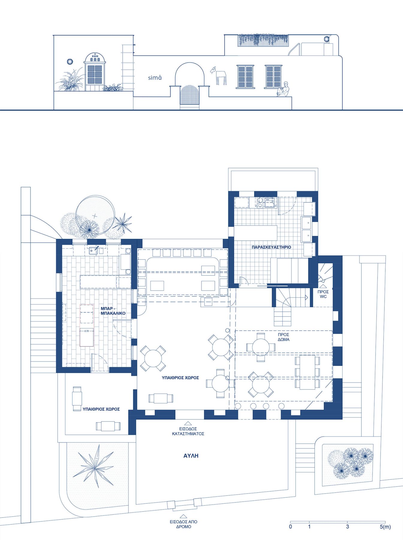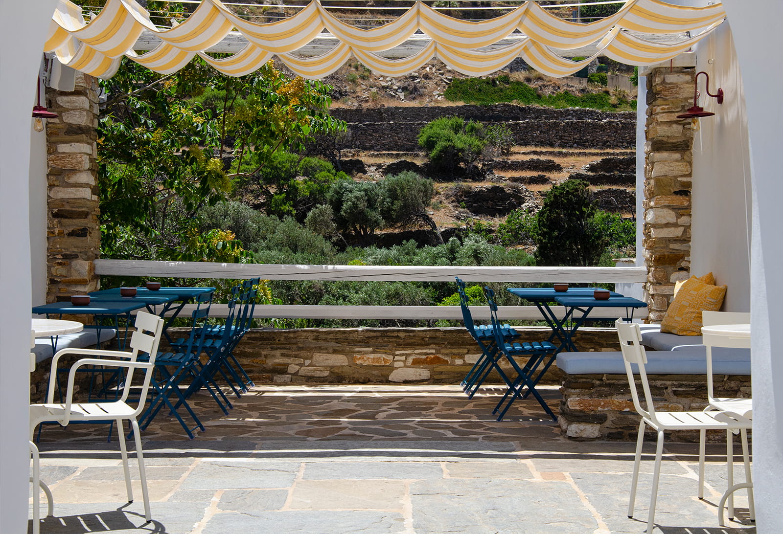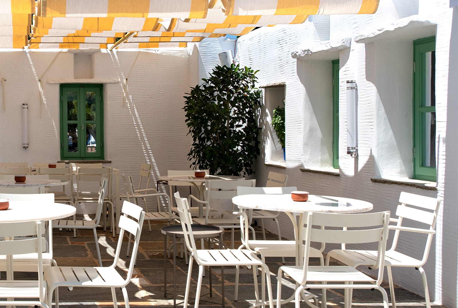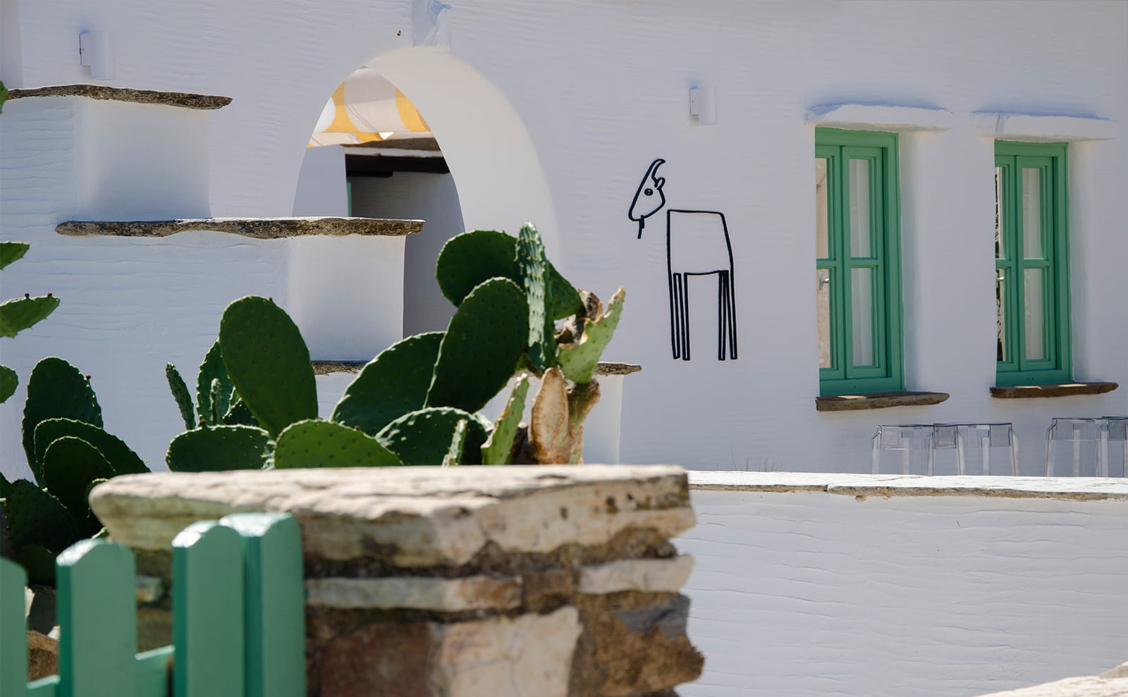 Ο εξωτερικός χώρος είναι μια νησιώτικη σπιτική αυλή, όπου το λευκό επικρατεί σε αντίστιξη με τα χρώματα του χωριού – πέραν του συνηθισμένου μπλε – που εισχωρούν σε αυτή.