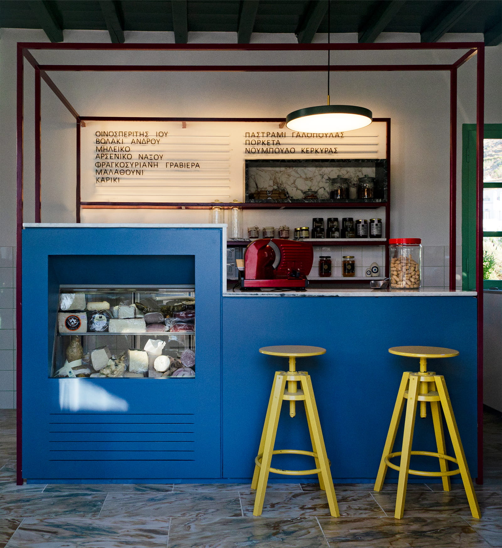 A deli bar for both locals and visitors. A space that has a fluid character, the shop and the bar merge in one another. The main indoor space is formed by this combination. A metallic structure signifies the ordering point.