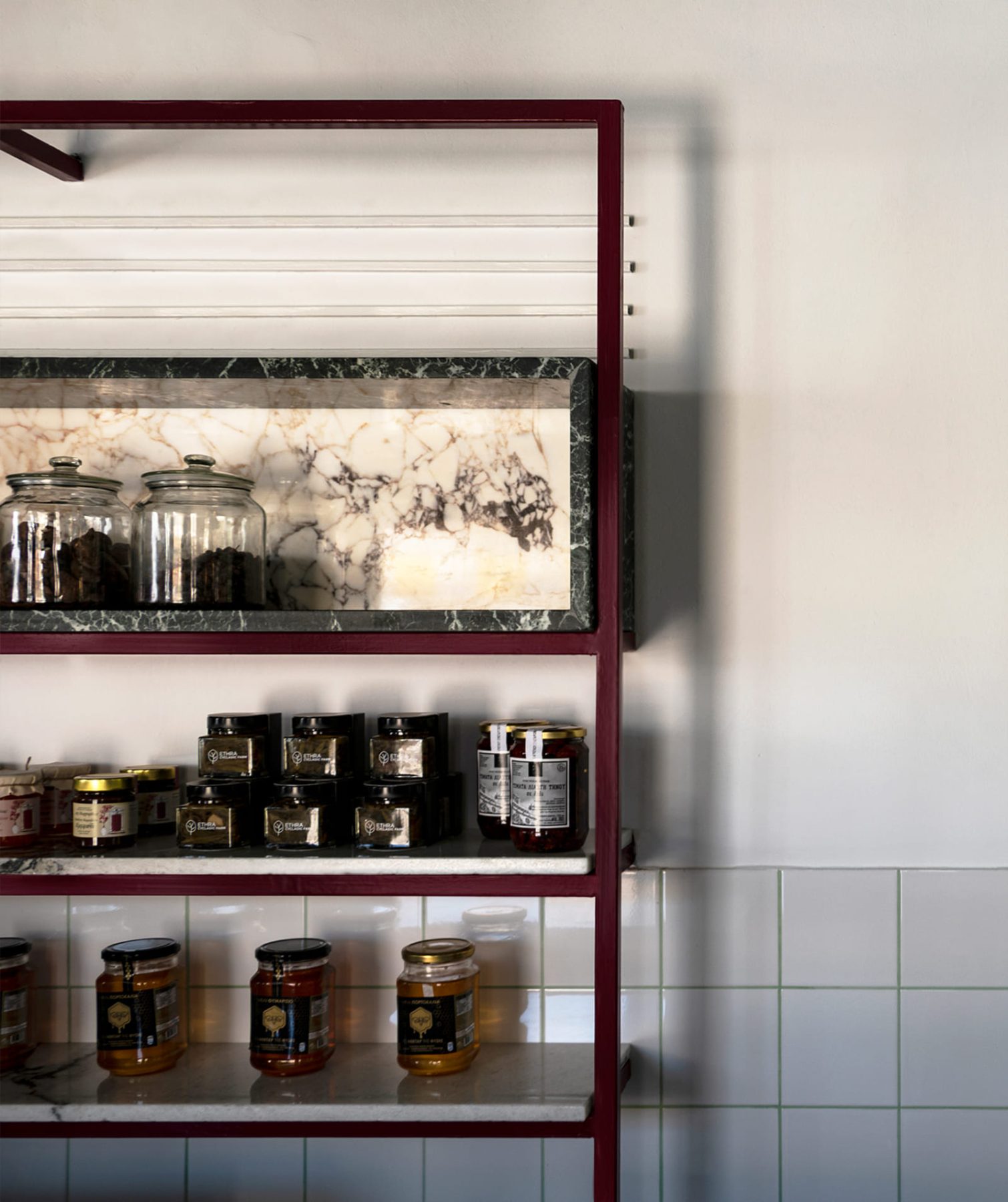 The food preparation and serving is open to the visitors, who can themselves observe the process. The red metal structure above the preparation bench creates a frame, placing emphasis on the local goods.