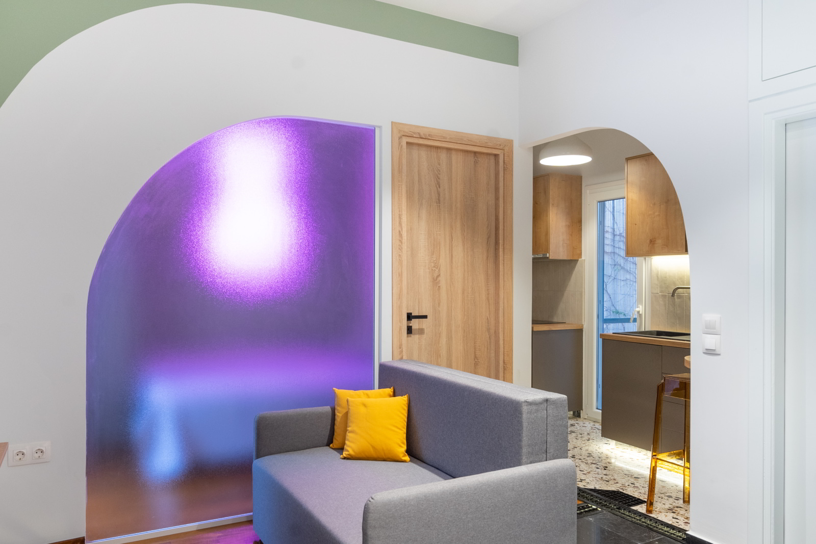 Η τοποθέτηση στοιχείων που αναφέρονται στην ιστορία της Αθήνας είναι εμφανής, με την τοποθέτηση του λόφου του Λυκαβηττού σε μορφή sticker στην είσοδο του διαμερίσματος, καθώς και τη χρήση της Καρυάτιδας σε neon φωτιστικό στον χώρο του υπνοδωματίου σε έντονο φούξια χρώμα, προσδίδοντας μια ξεχωριστή αισθητική πινελιά που είναι ορατή έμεσα και από τον χώρο του καθιστικού.