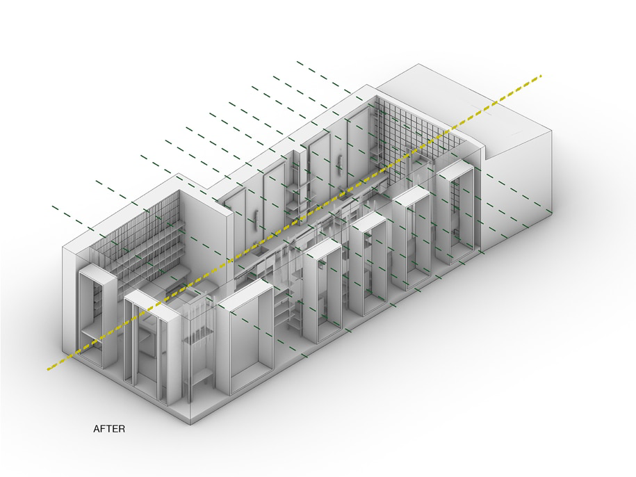 Η ανοιχτή κάτοψη του χώρου και το επίμηκες σχήμα της έθεσε κάποια ζητήματα ιδιωτικότητας στον σχεδιασμό. Προκειμένου να αποφευχθεί η επιμέρους διαμερισματοποίηση του χώρου, χρησιμοποιήθηκαν μεταλλικές κουρτίνες ως κατακόρυφα διάτρητα στοιχεία για να επιτευχθούν διαφορετικές ποιότητες ιδιωτικότητας και να σηματοδοτηθούν οι ξεχωριστές παρεχόμενες υπηρεσίες. Στην ίδια λογική οι κύριοι με τους βοηθητικούς χώρους διαχωρίστηκαν από ένα τοίχο από υαλότουβλα. Αξιοποιώντας την διαφάνεια και τις διαφορετικές ποιότητες φωτισμού διαμορφώθηκε ένα ρευστό, εικαστικό φόντο στο τελείωμα του καταστήματος.