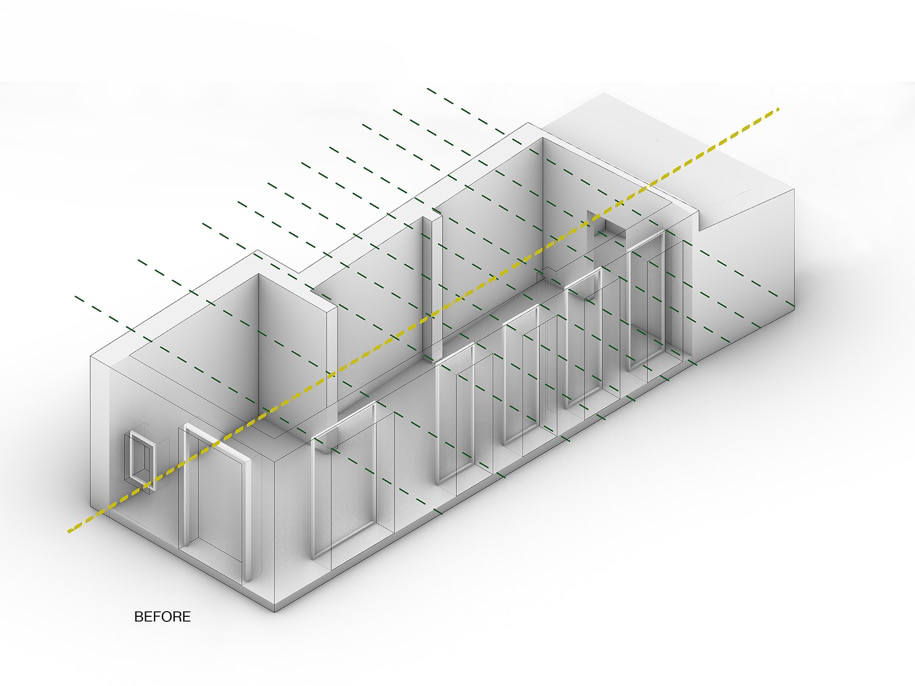 Η συνθετική δυναμική των κατακόρυφων χαράξεων του κτιρίου αποτέλεσε σημείο αναφοράς της αρχιτεκτονικής πρότασης. Αναδεικνύοντας τα διατηρητέα στοιχεία της όψης, τα κατακόρυφα ανοίγματα, καδράρονται και πλαισιώνονται σε όλο το βάθος της τοιχοποιίας. Με αυτό τον τρόπο υπογραμμίζονται οι αναλογίες τους και ενισχύεται η θέση τους στον χώρο. Μεταφέροντας τις ίδιες χαράξεις στο εσωτερικό, τοποθετούνται αντικρυστά των ανοιγμάτων και στις ίδιες αναλογίες με αυτά, τέσσερις καθρέπτες floor-to-ceiling, σηματοδοτώντας έτσι, τις θέσεις κουρέματος. Στην ίδια λογική, ο χώρος υποδοχής σχεδιάζεται στην προέκταση του μεγάλου ανοίγματος του κτιρίου, δημιουργώντας έτσι ένα “παράθυρο” του χώρου από και προς τον δρόμο.