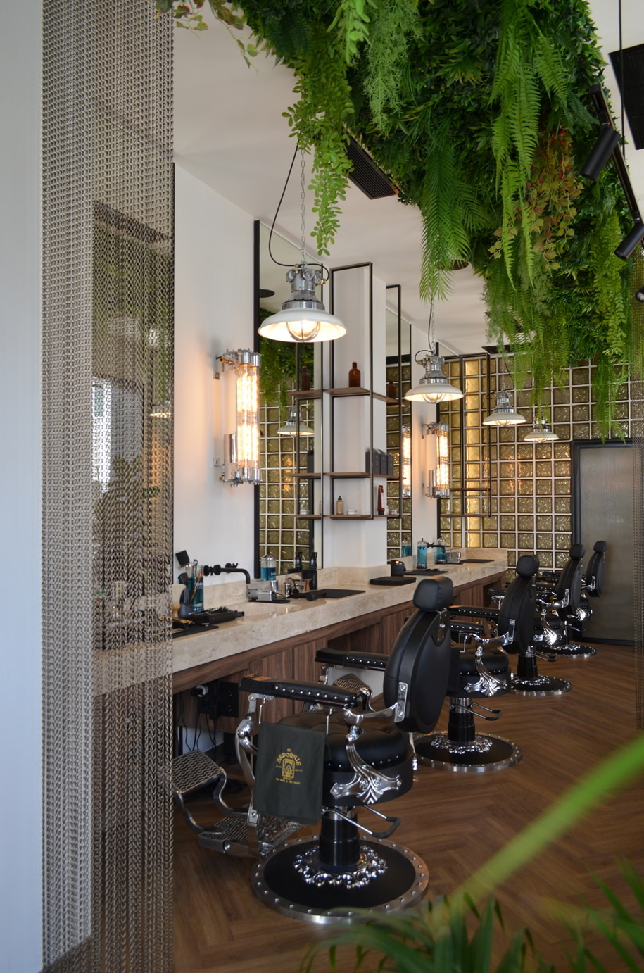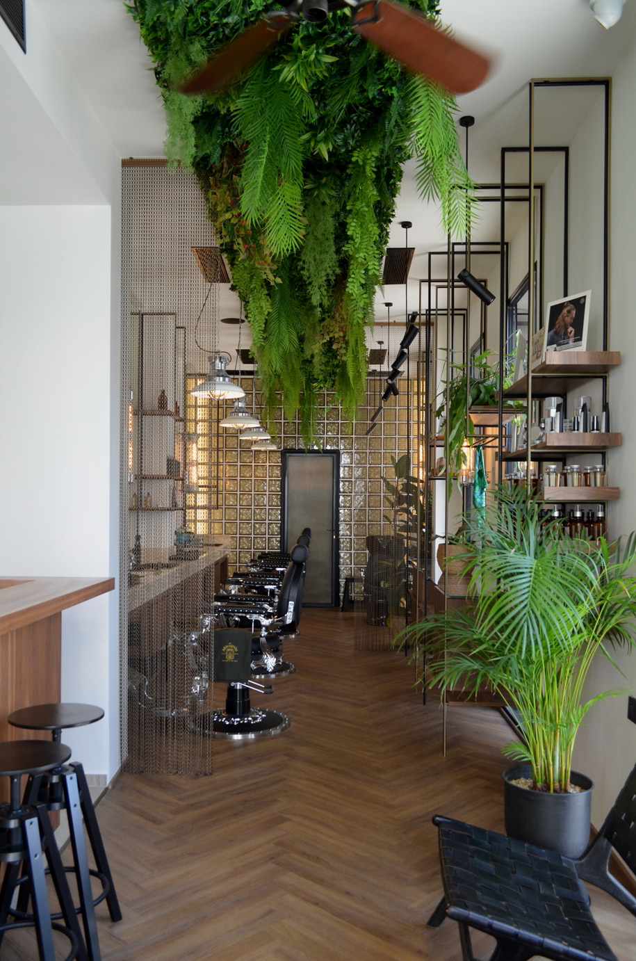 Πηγή έμπνευσης, αλλά ταυτόχρονα και πεδίο έρευνας, στον σχεδιασμό του κουρείου, αποτέλεσαν οι διαφορετικές υλικότητες, υφές και αναφορές της πρότασης. Στόχος μας ήτανε να συνδυάσουμε τον αστικό αθηναικό χαρακτήρα ενός διατηρητέου κτιρίου με την κλασσική νοσταλγικότητα ενός κουρείου ανδρών σε μια σύγχρονη εκδοχή. Οι ξύλινες κατασκευές από καρυδιά, το μάρμαρο τραβερτίνο, το ξύλινο δάπεδο chevron (στοιχεία μιας παλαιάς Αθήνας), τα vintage φωτιστικά, συνυπάρχουν με τα μαύρα-μπρονζέ μεταλλικά στοιχεία και τα μπρονζέ υαλότουβλα. Αυτήν την σύνθεση παλαιού και νέου συμπληρώνει η παρουσία των φυτών σε όλον τον χώρο του κουρείου δίνοντας του μια αίσθηση κρυφής όασης στην πόλη.