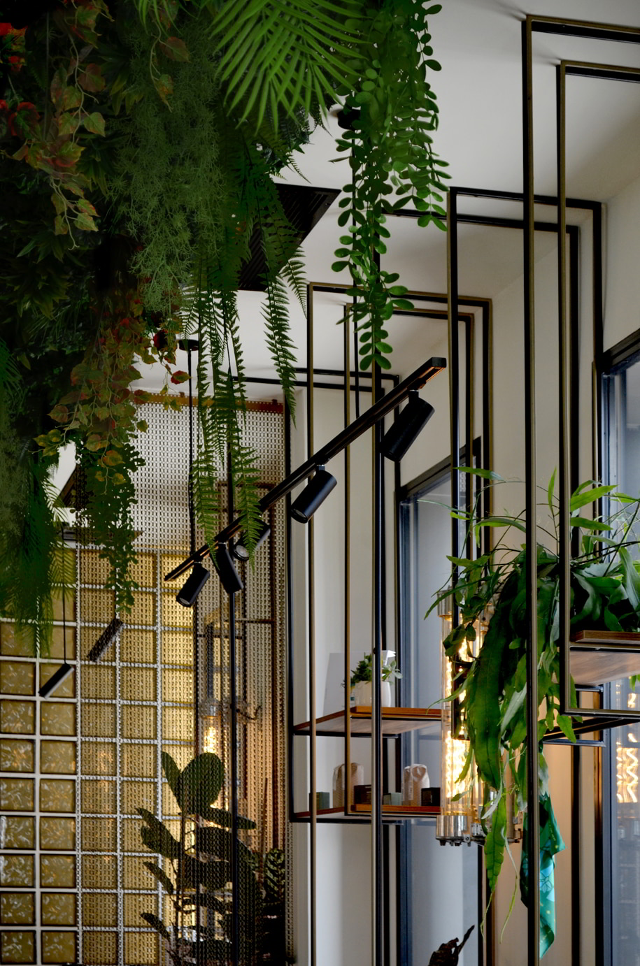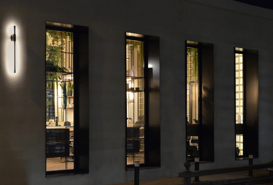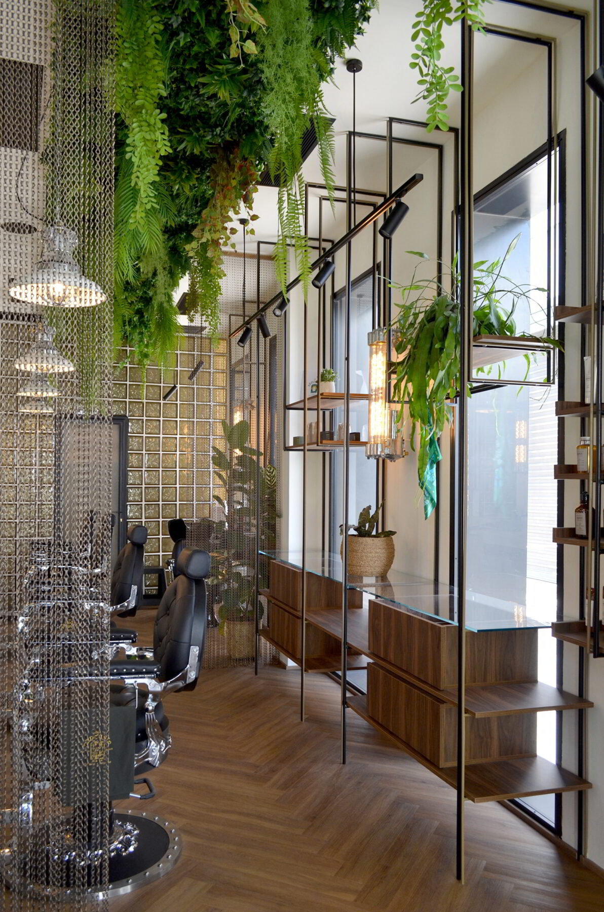 For the final configuration of the layout, a linear axis connecting the central entrance to the rear exit of the store was defined. This axis is marked by linear planting on the roof and separates the functions of the barbershop. On the left handside are placed the reception area and the linear travertine counter, while on the right handside, a specially designed space for the display of men’s grooming products is developed. Vertical metal double rods are placed around the perimeter of the openings supporting the product display surfaces and transforming the openings into the store’s showcases.