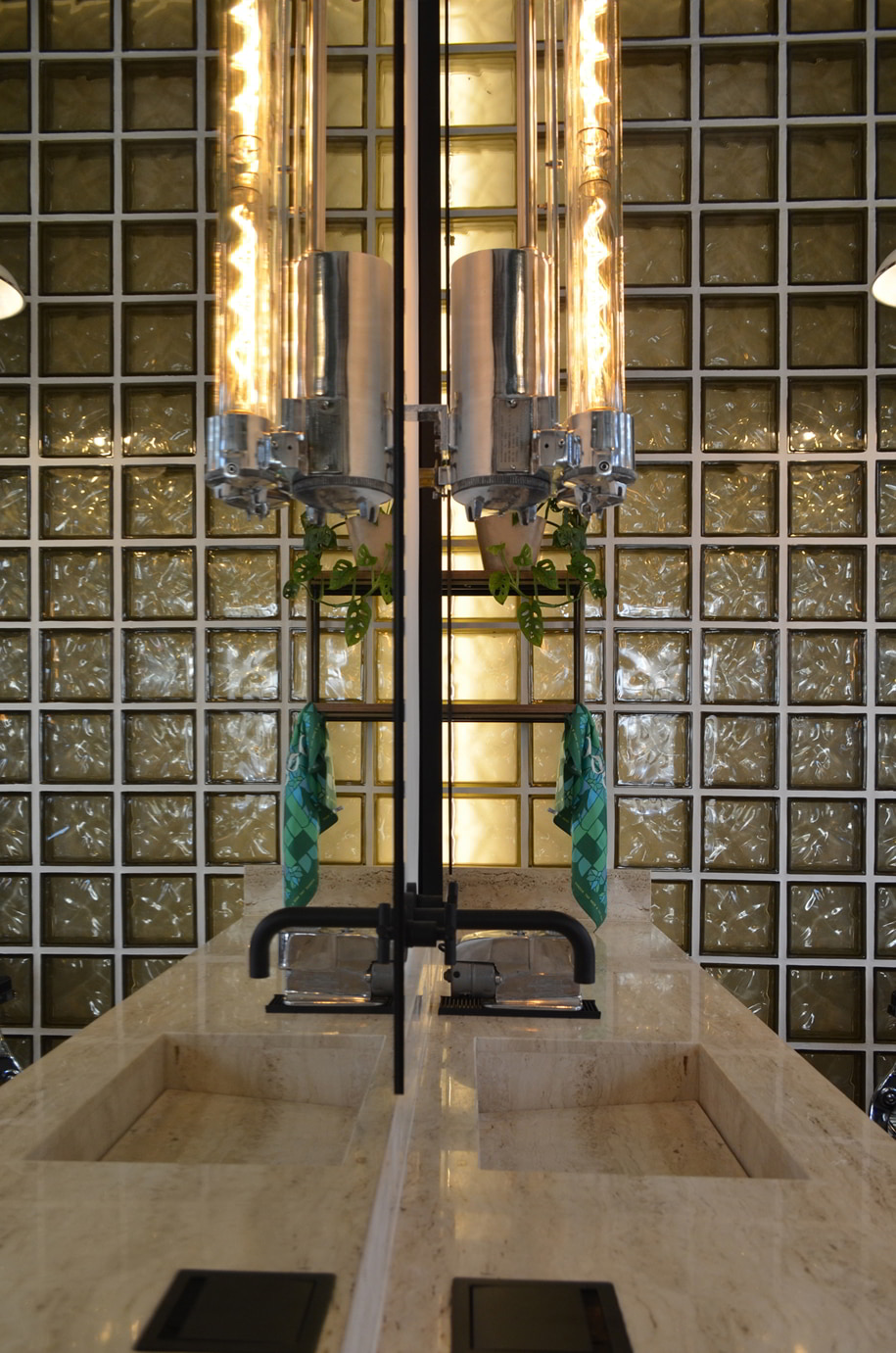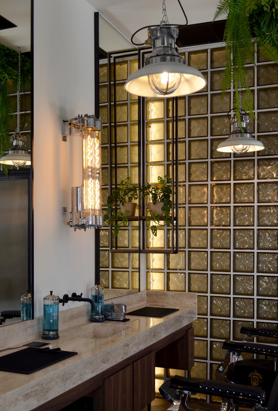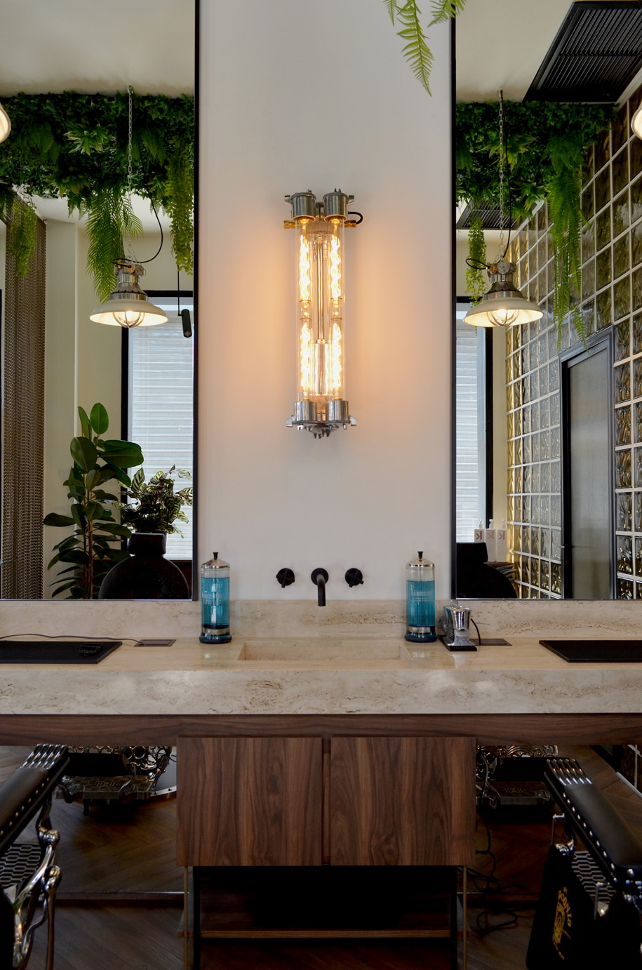 The different materials, the textures, and the references of the proposal have been a source of inspiration, but also a field of exploration, during the design process of the barbershop. Our goal was to combine the urban Athenian character of a listed building with the classic nostalgia of a men’s barbershop transferred in the contemporary world. Walnut wood constructions, travertine marble, chevron wooden flooring (elements of old Athens) and vintage lighting fixtures coexist with black-bronze metal elements and bronze glass blocks. This composition of old and new is complemented by the presence of plants throughout the barbershop, giving it a sense of hidden oasis in the city.