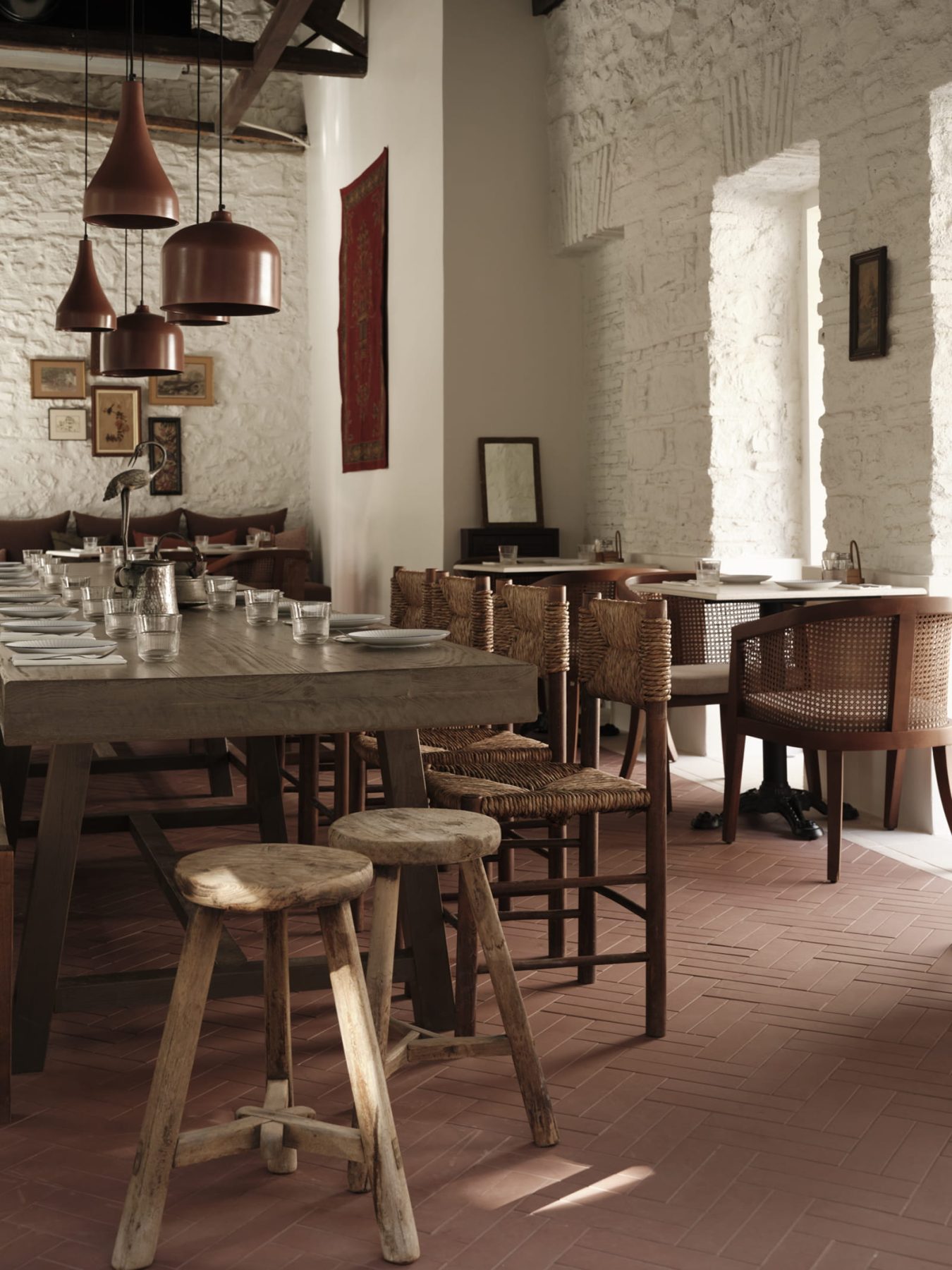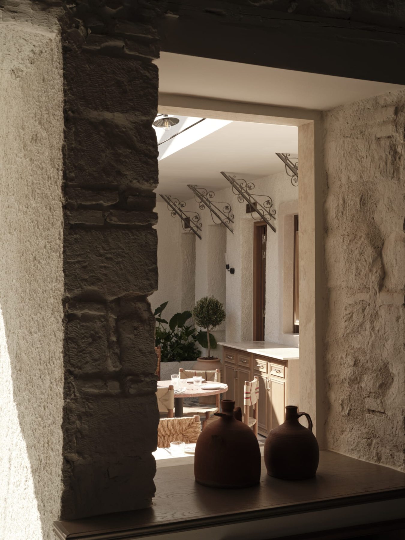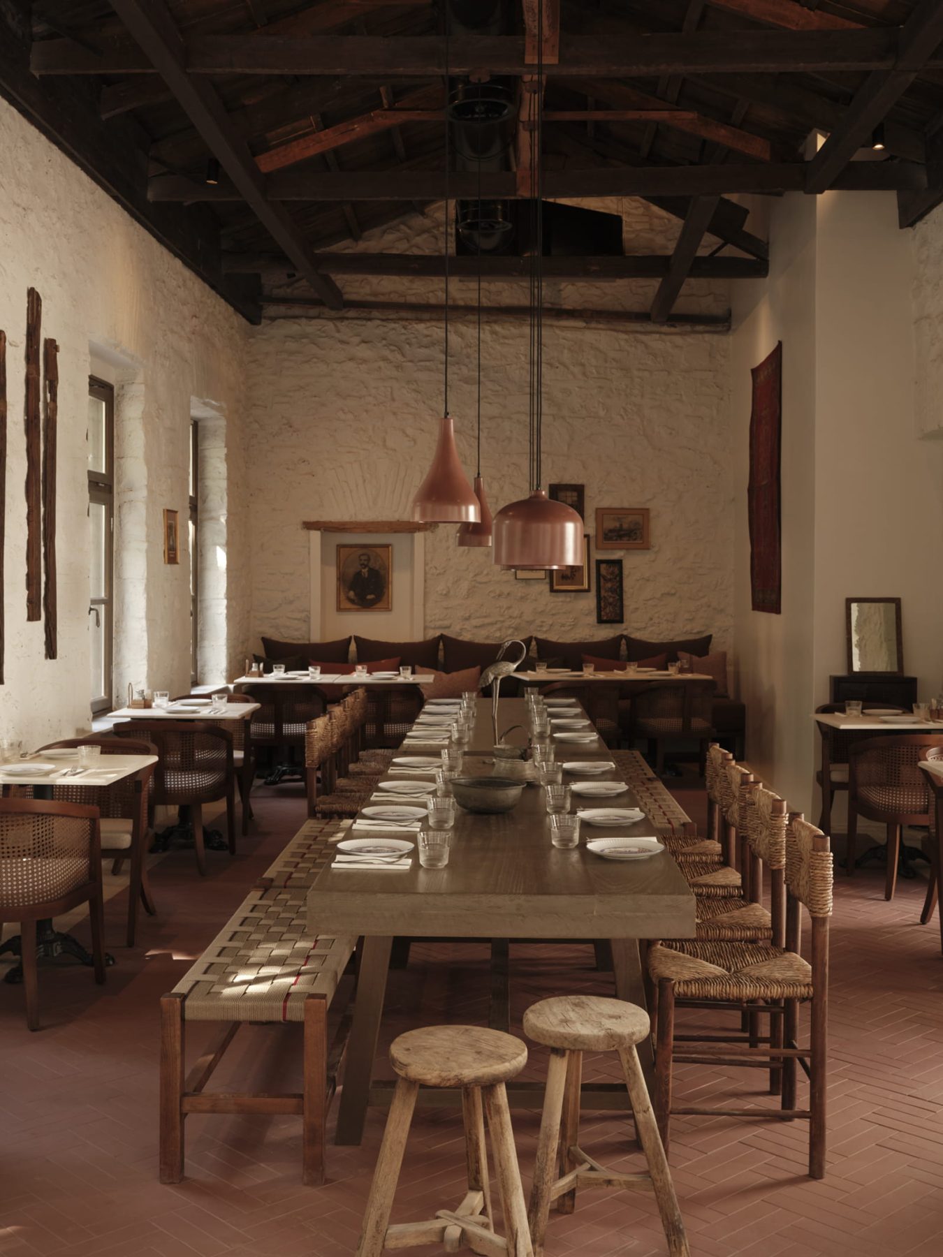 Previous layers and later additions were removed, while as many original elements as possible were preserved. This process revealed a clear architectural canvas, allowing for precise and measured interventions. Each decision was guided by respect for the building’s inherent qualities, highlighting its authentic beauty and seamlessly incorporating its natural charm into the restaurant’s contemporary design. Authenticity operates as a central conceptual axis, extending beyond spatial design and cuisine to define the overall transformation of the venue.