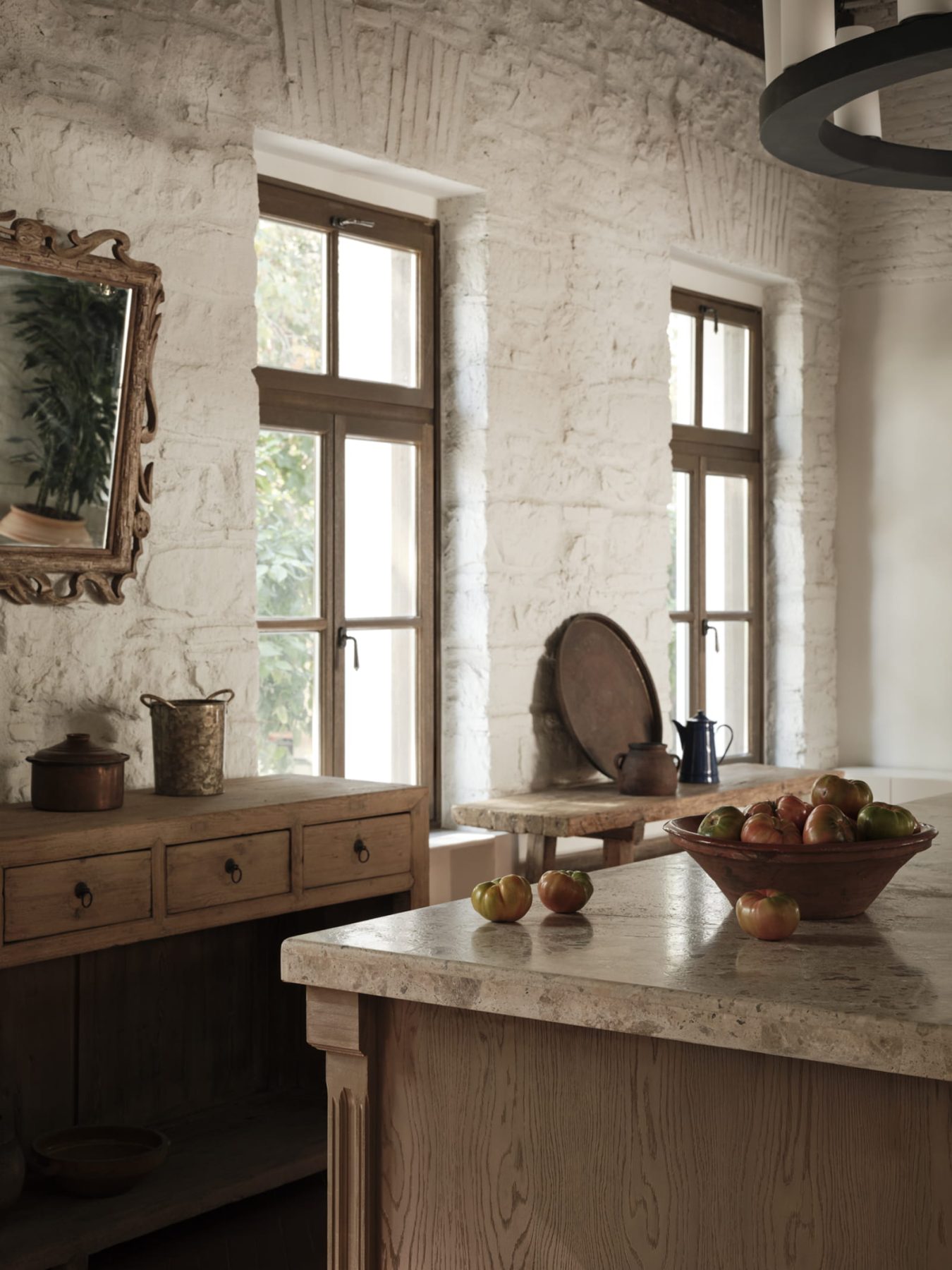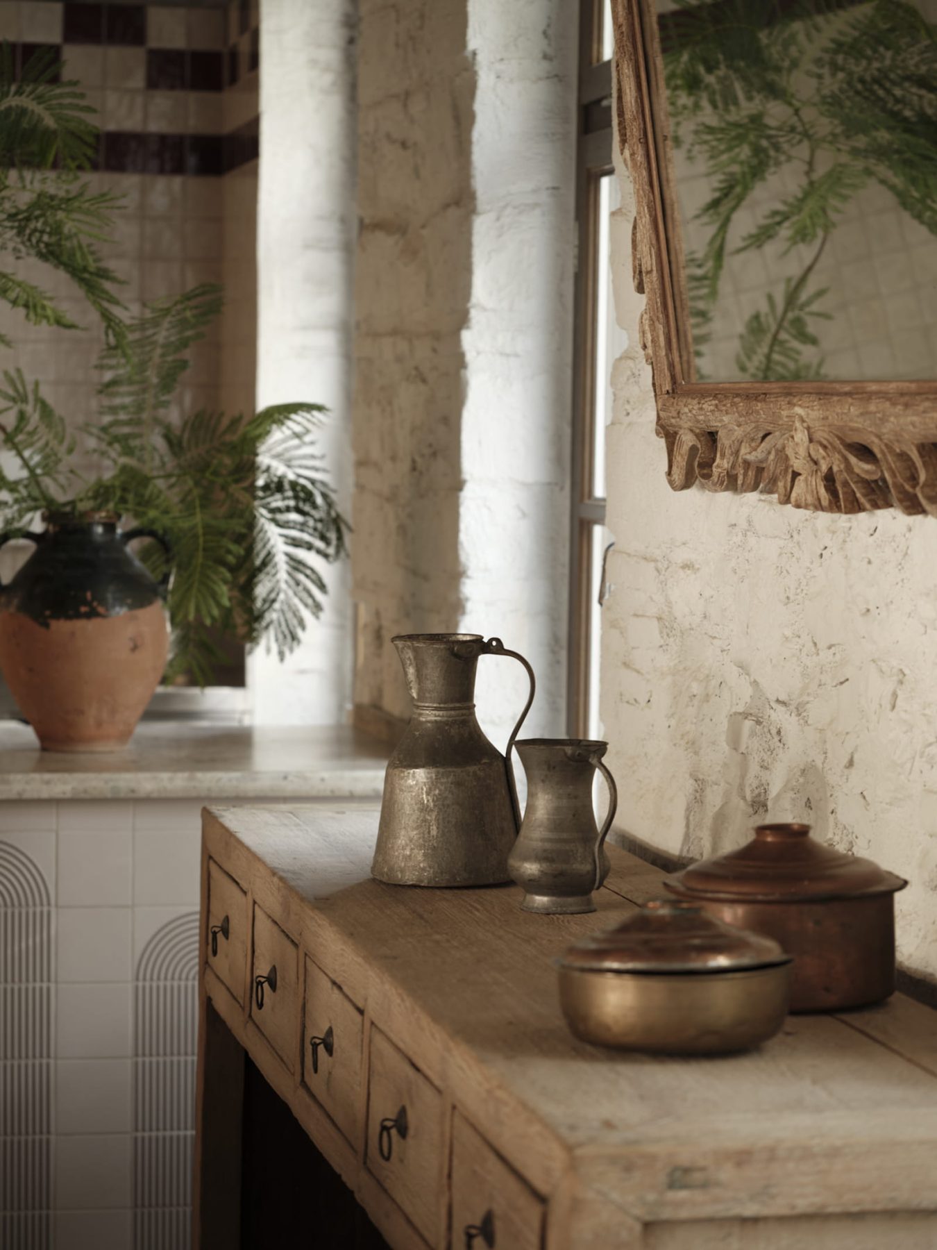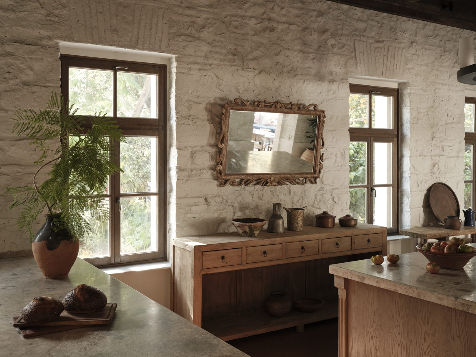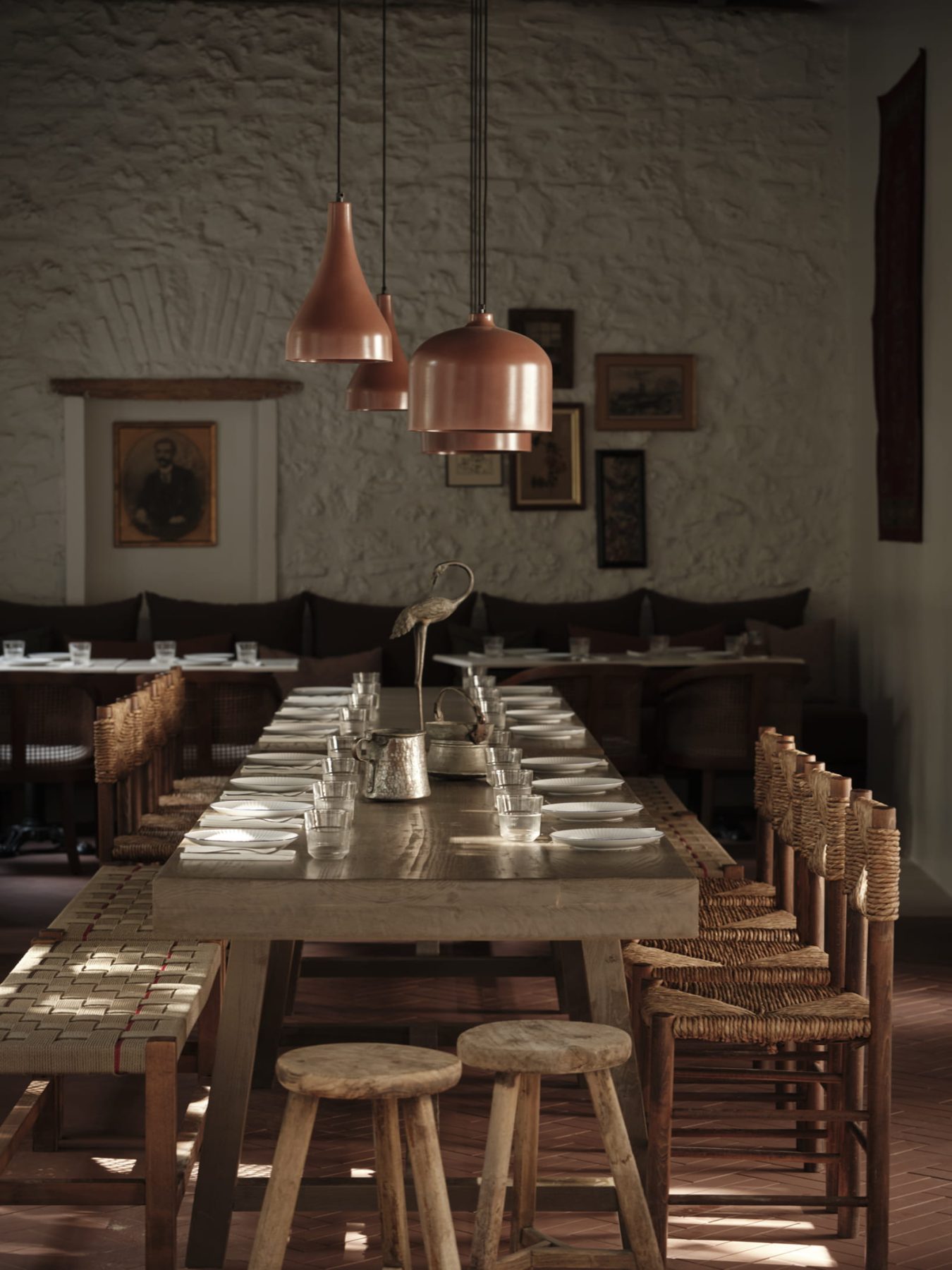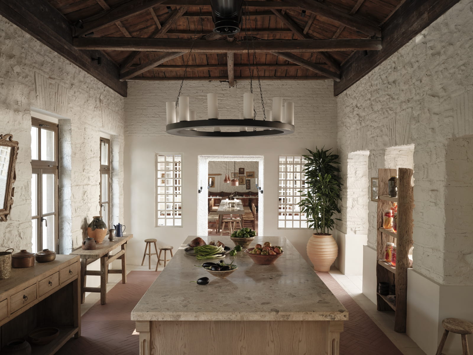 Around the planter, guests are able to sit and observe the multiple functions of the restaurant unfolding simultaneously. The bar, enriched by a distinctive artwork by Anna Mentogianni, introduces an artistic layer within the overall composition. The front dining area is defined by an imposing monastery-style table and the sensory presence of the open kitchen, fostering an atmosphere of warmth and shared experience. Antique furniture and buffets filled with jars of pickled goods further evoke the intimacy of a domestic kitchen environment.