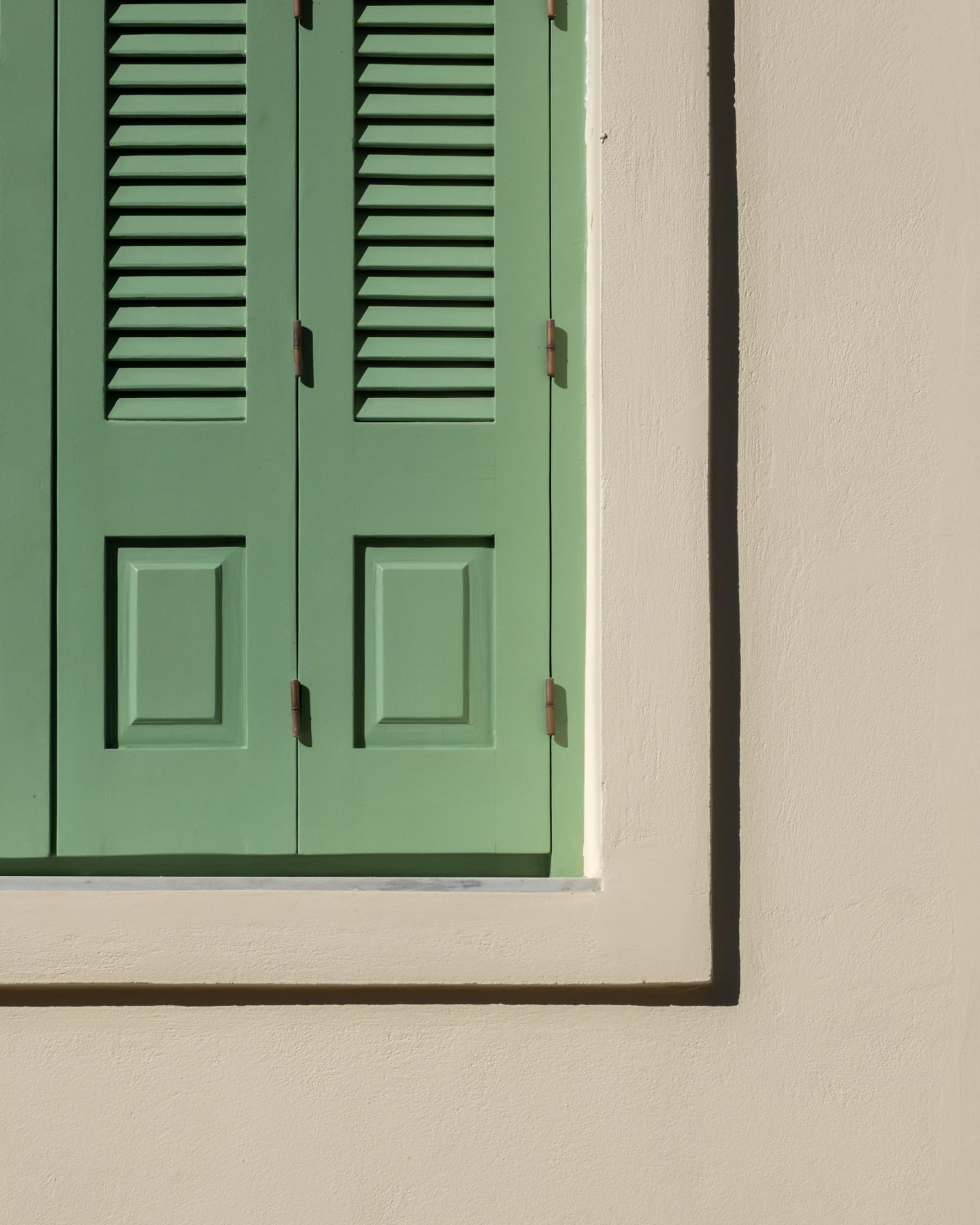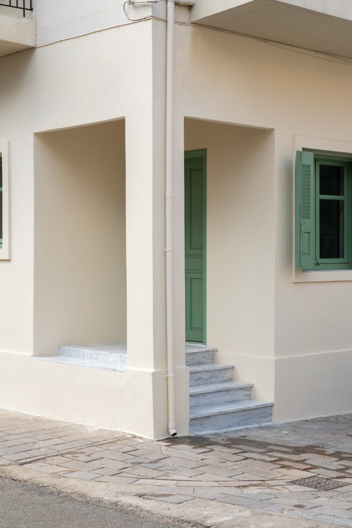 Inside, brown wooden window frames match the pine plywood tones, while pistachio-green shutters pair with the light beige hue of the exterior coating. The house’s doorstep is clad in white marble from Kavala, forming a protected, semi-outdoor, semi-public space for neighborly gatherings, unexpected encounters, and impromptu meet-ups.