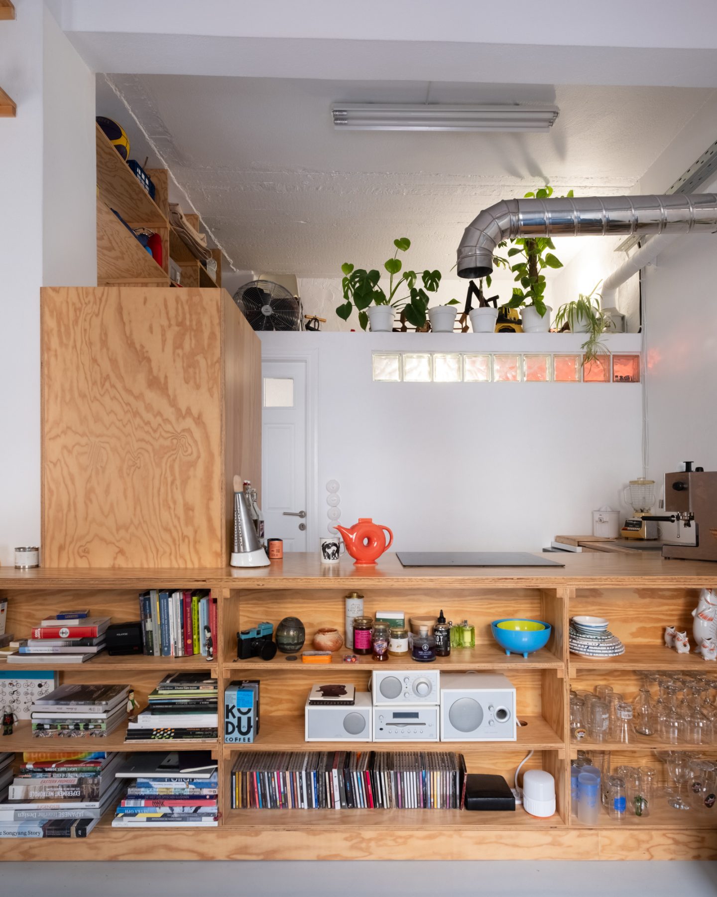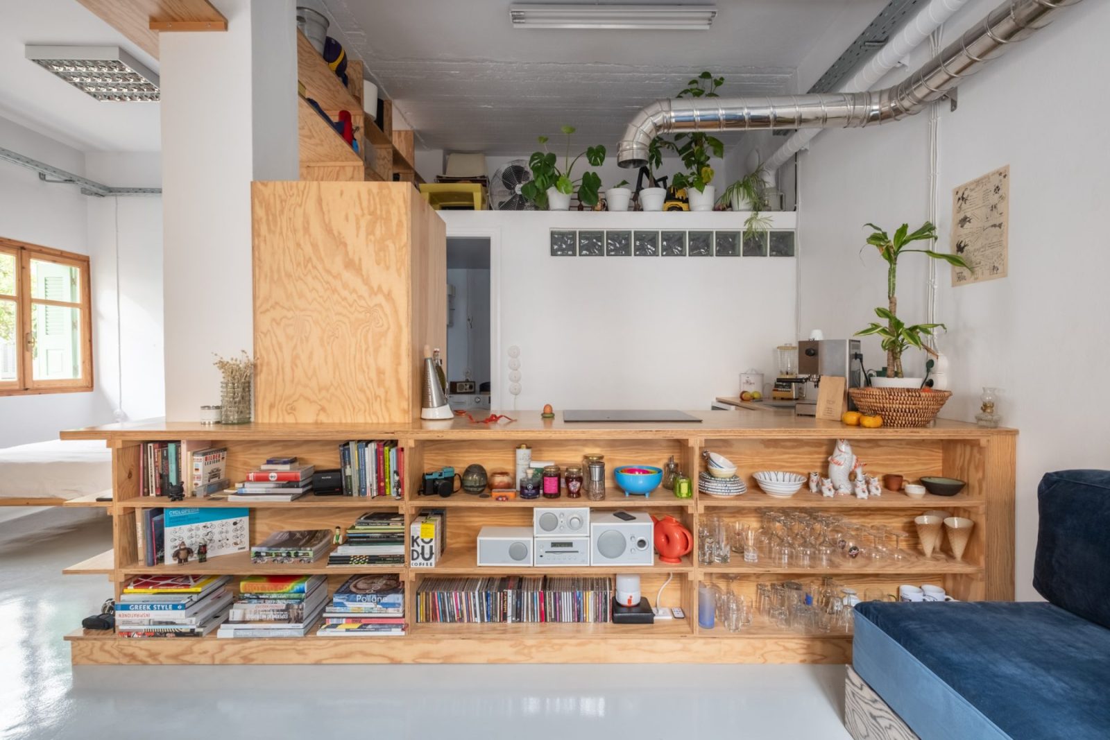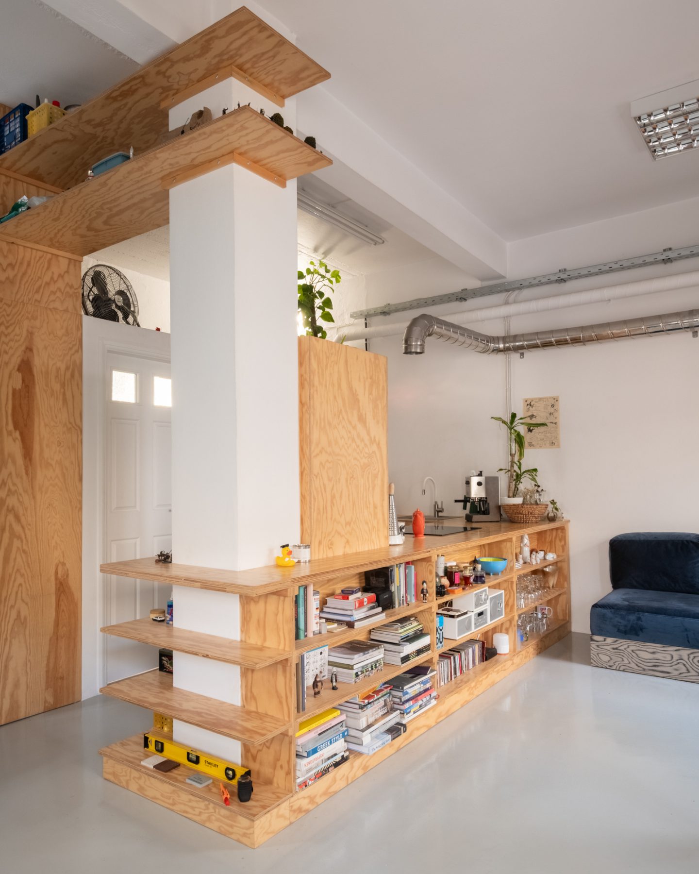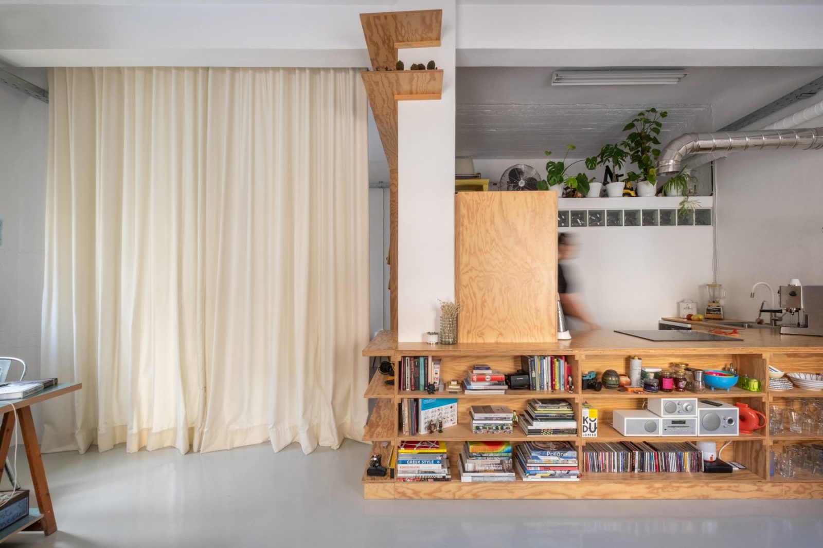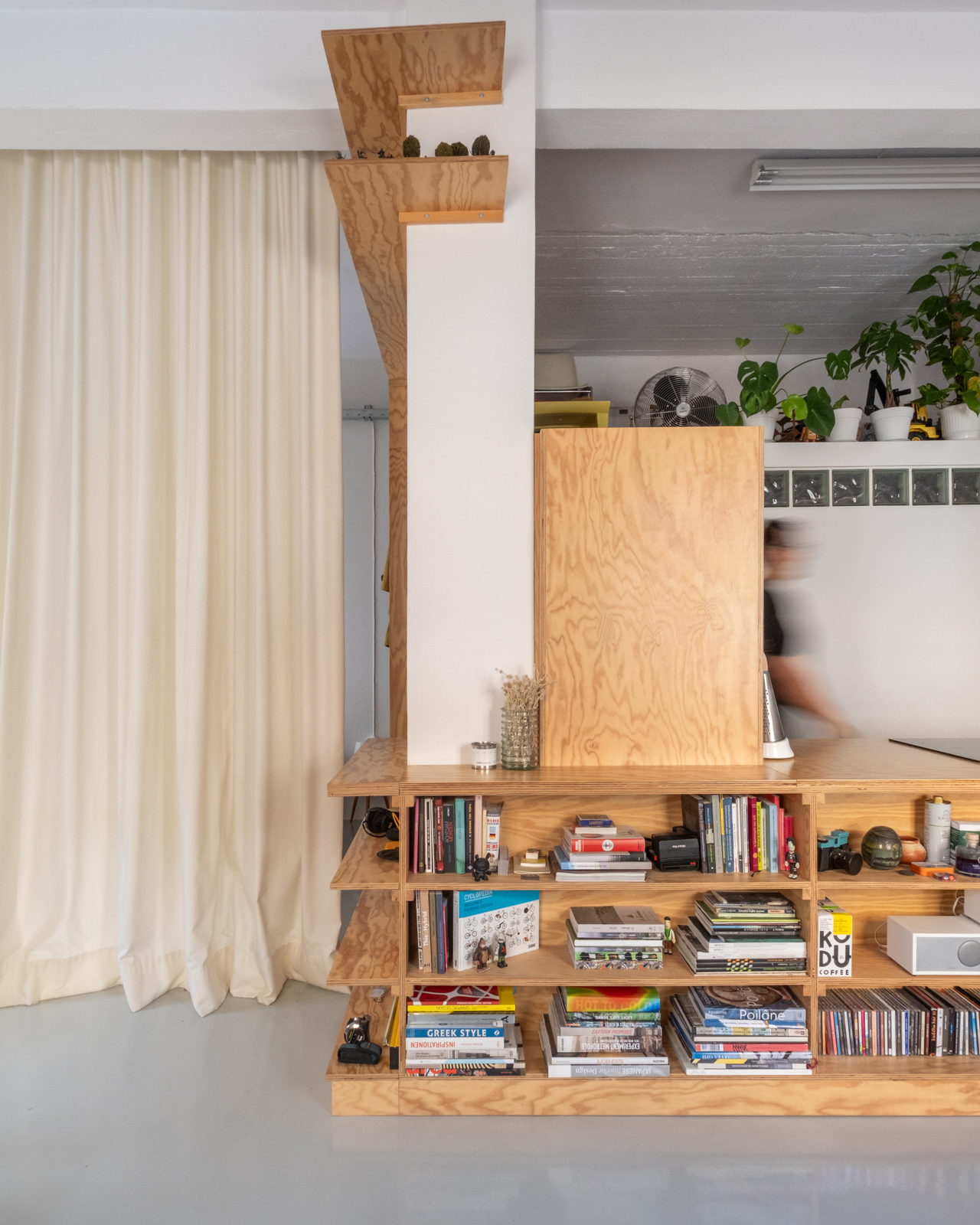 Centering on the need for display — “basically a showcase of myself,” as he puts it — Kouklakis demolishes blind, opaque walls, aiming for a luminous, open plan home studio space organized around a pine plywood multifunctional piece of furniture.