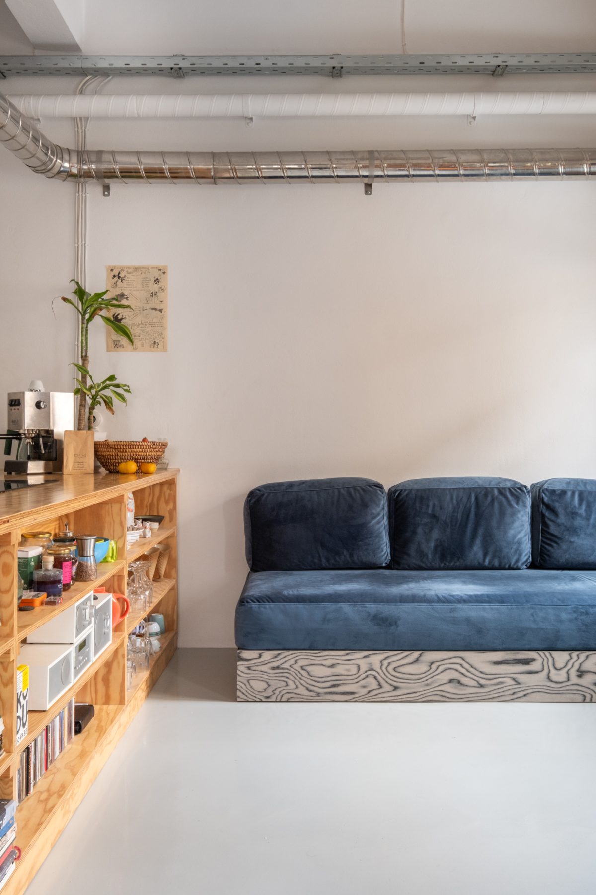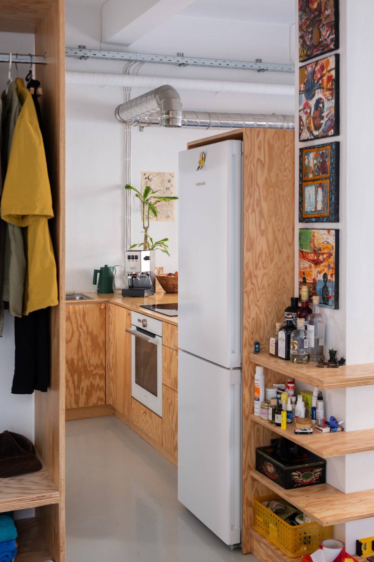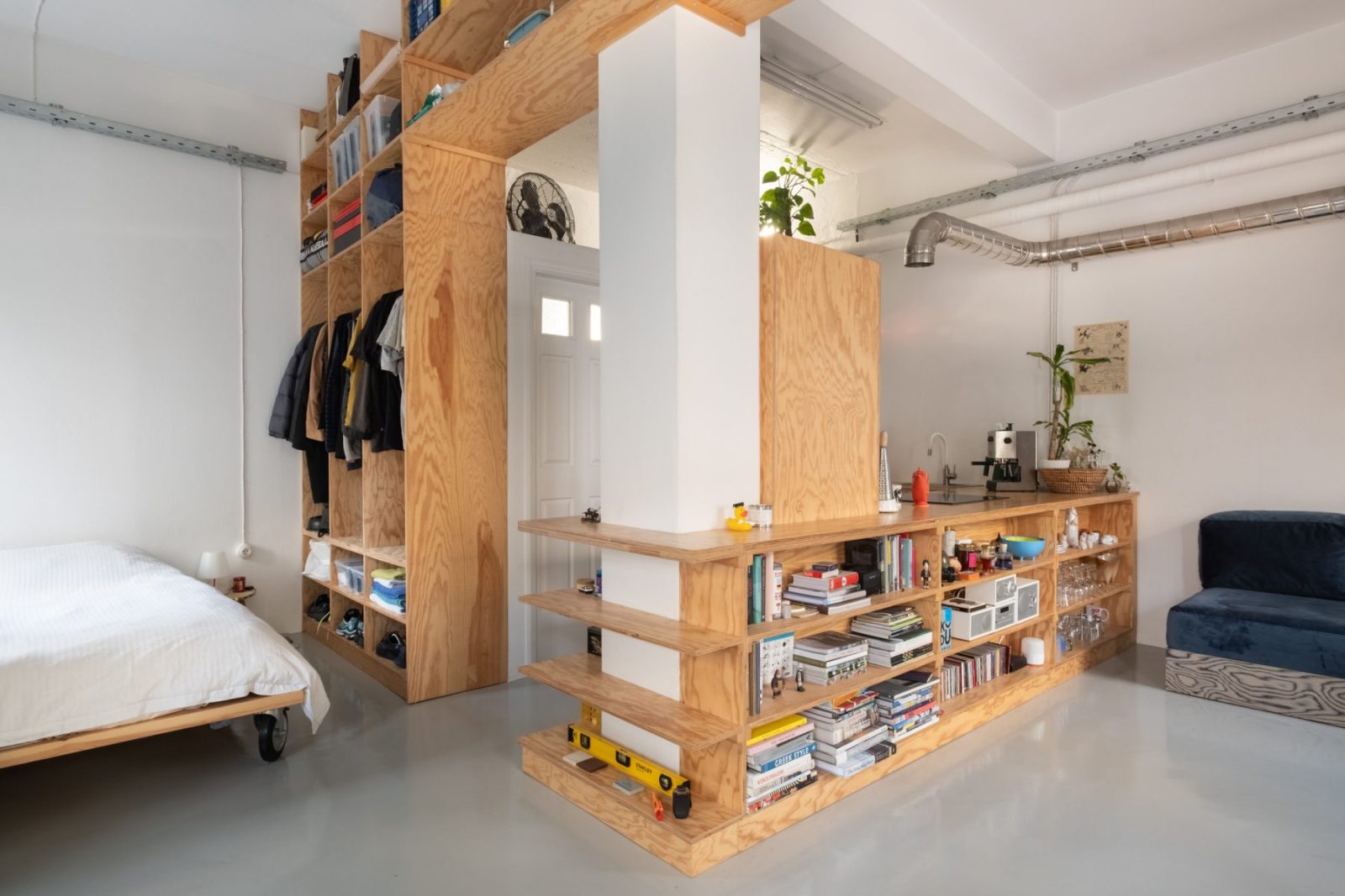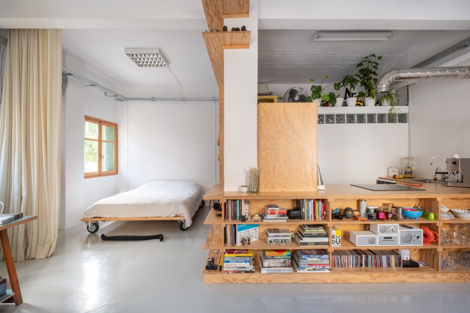 Centering on the need for display — “basically a showcase of myself,” as he puts it — Kouklakis demolishes blind, opaque walls, aiming for a luminous, open plan home studio space organized around a pine plywood multifunctional piece of furniture.