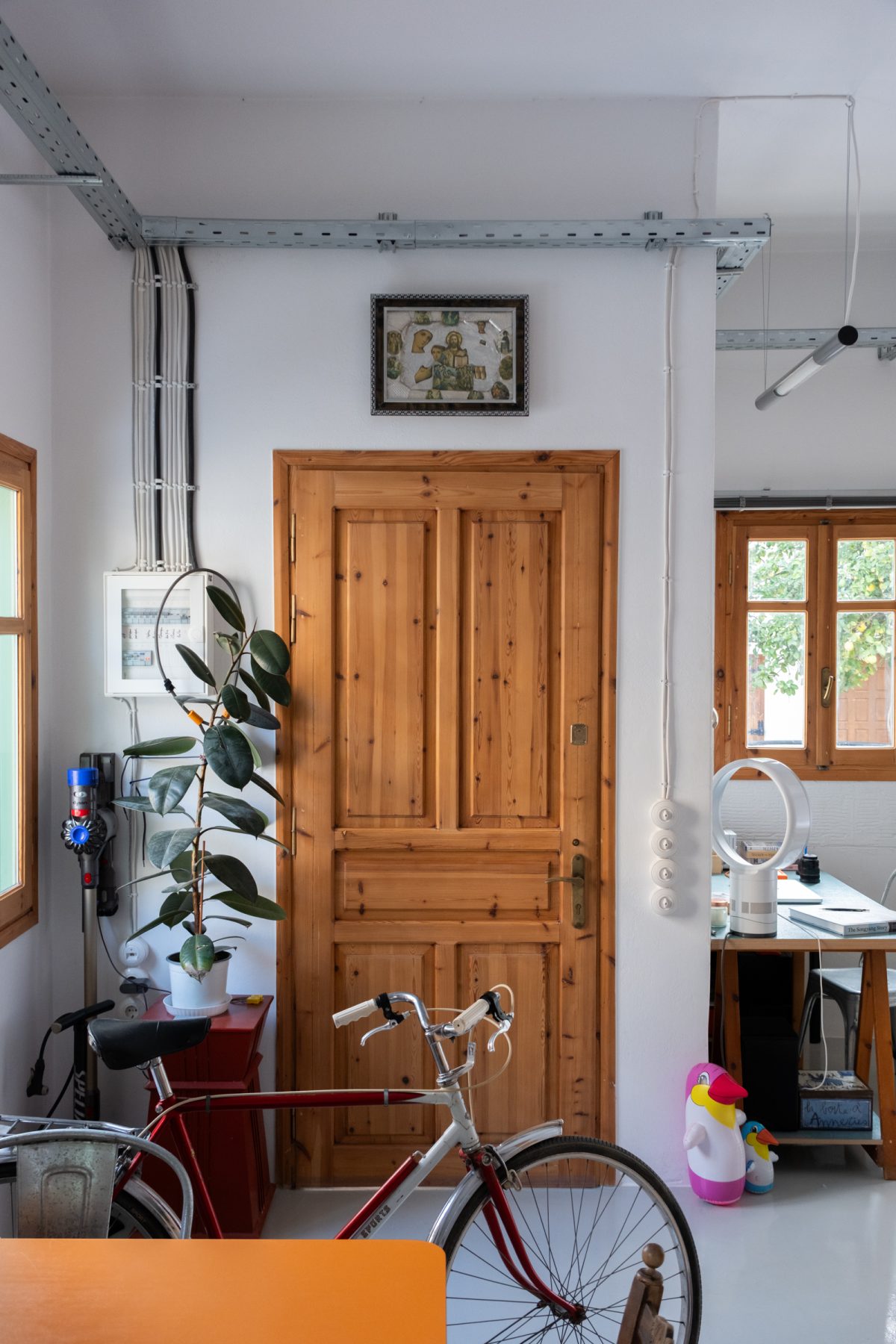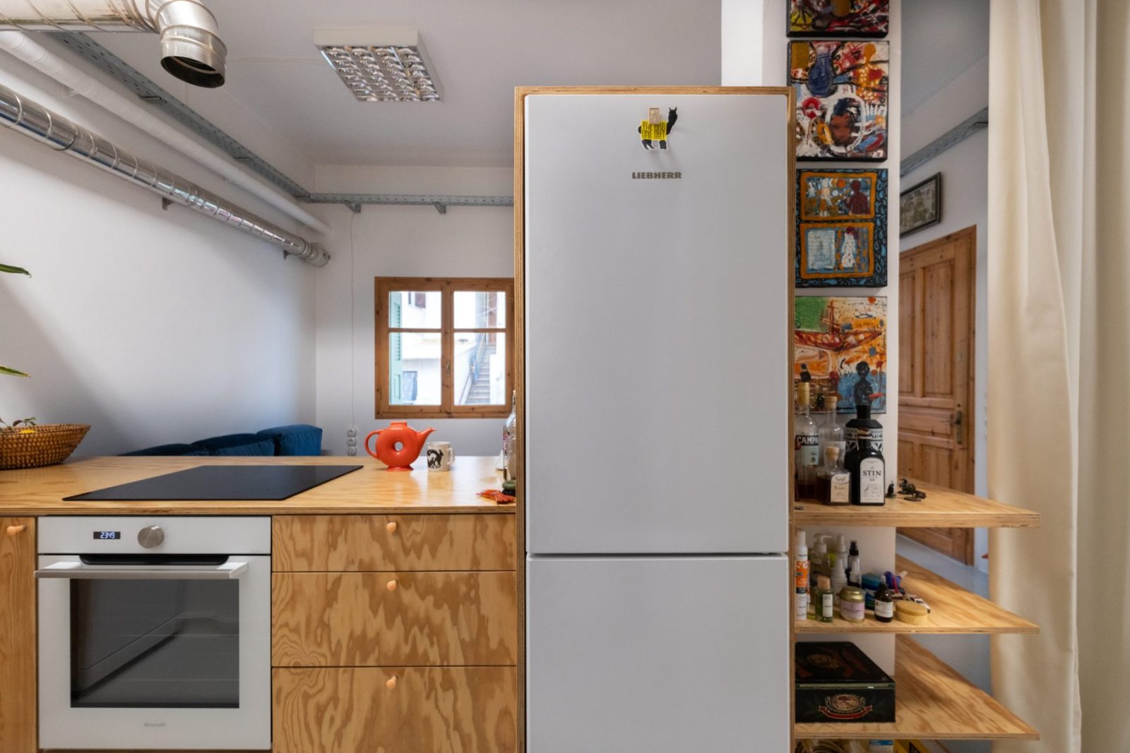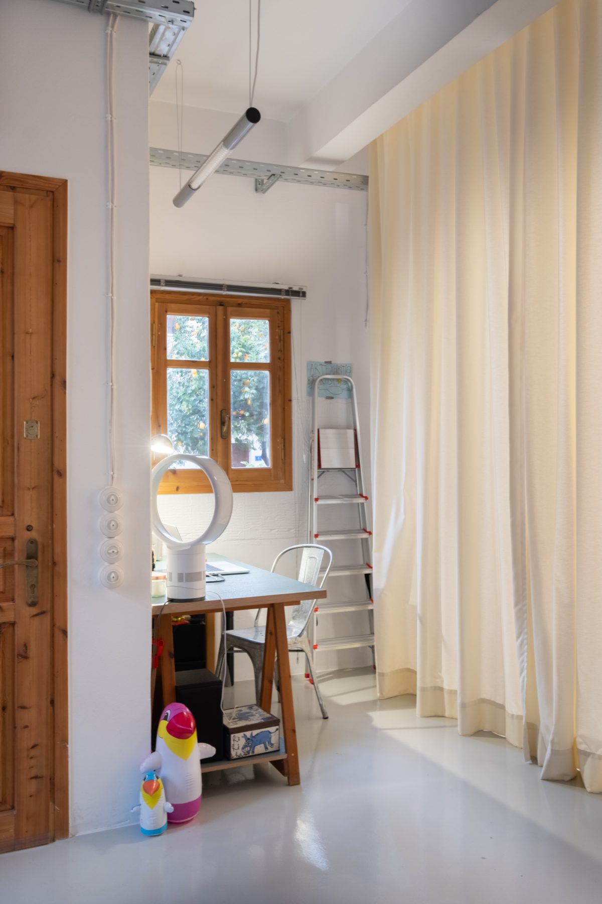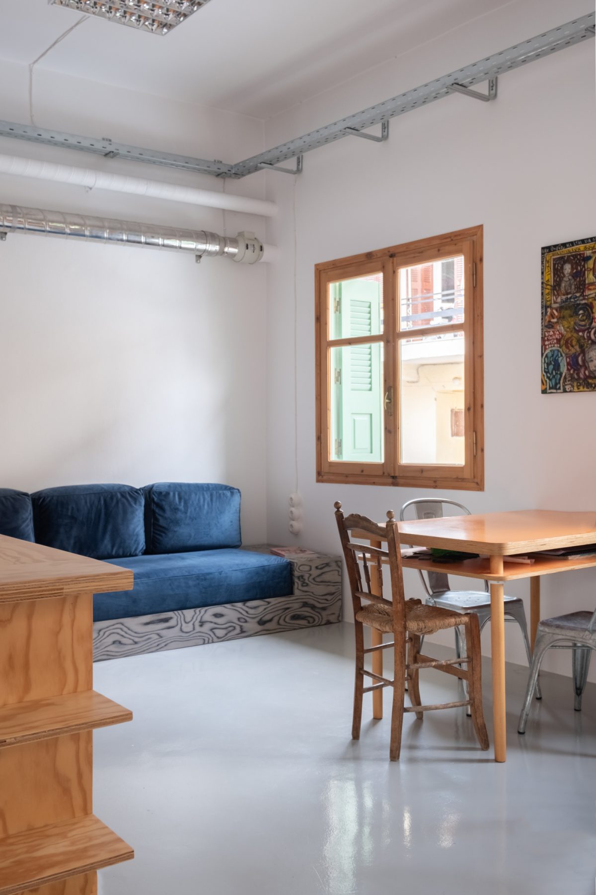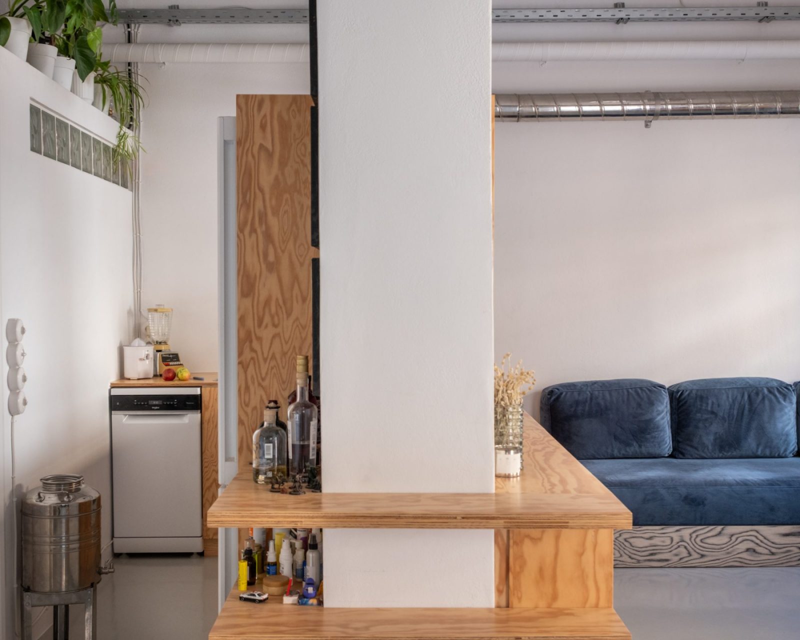 Centering on the need for display — “basically a showcase of myself,” as he puts it — Kouklakis demolishes blind, opaque walls, aiming for a luminous, open plan home studio space organized around a pine plywood multifunctional piece of furniture.