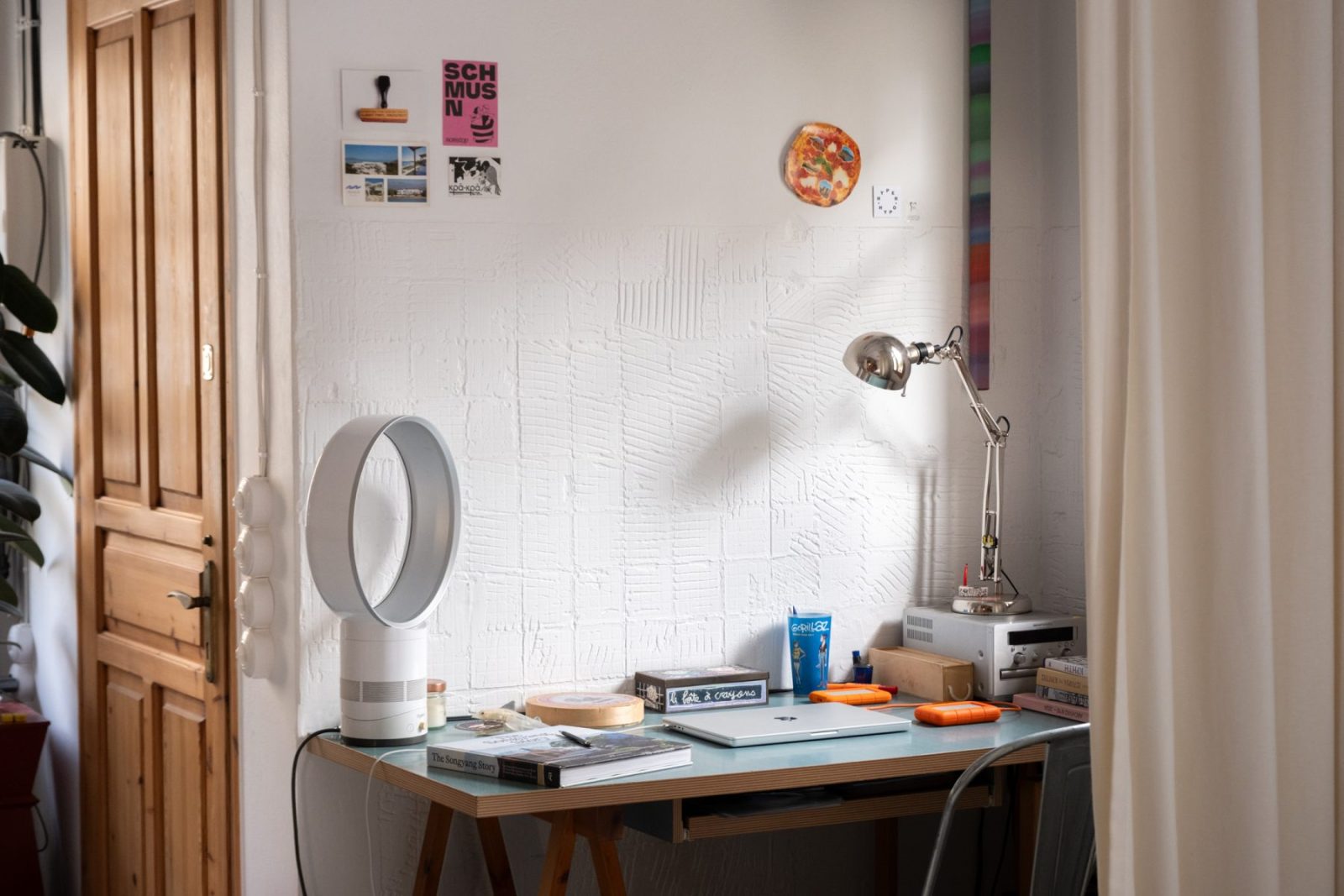A marine plywood desk hosts Studio Nikos Kouklakis entirely bound with objects: a laptop, a table lamp, a bunch of stickers and postcards, The Songyang Story book on architectural acupuncture, and a mechanical pencil form a constellation of deeply personal things.
