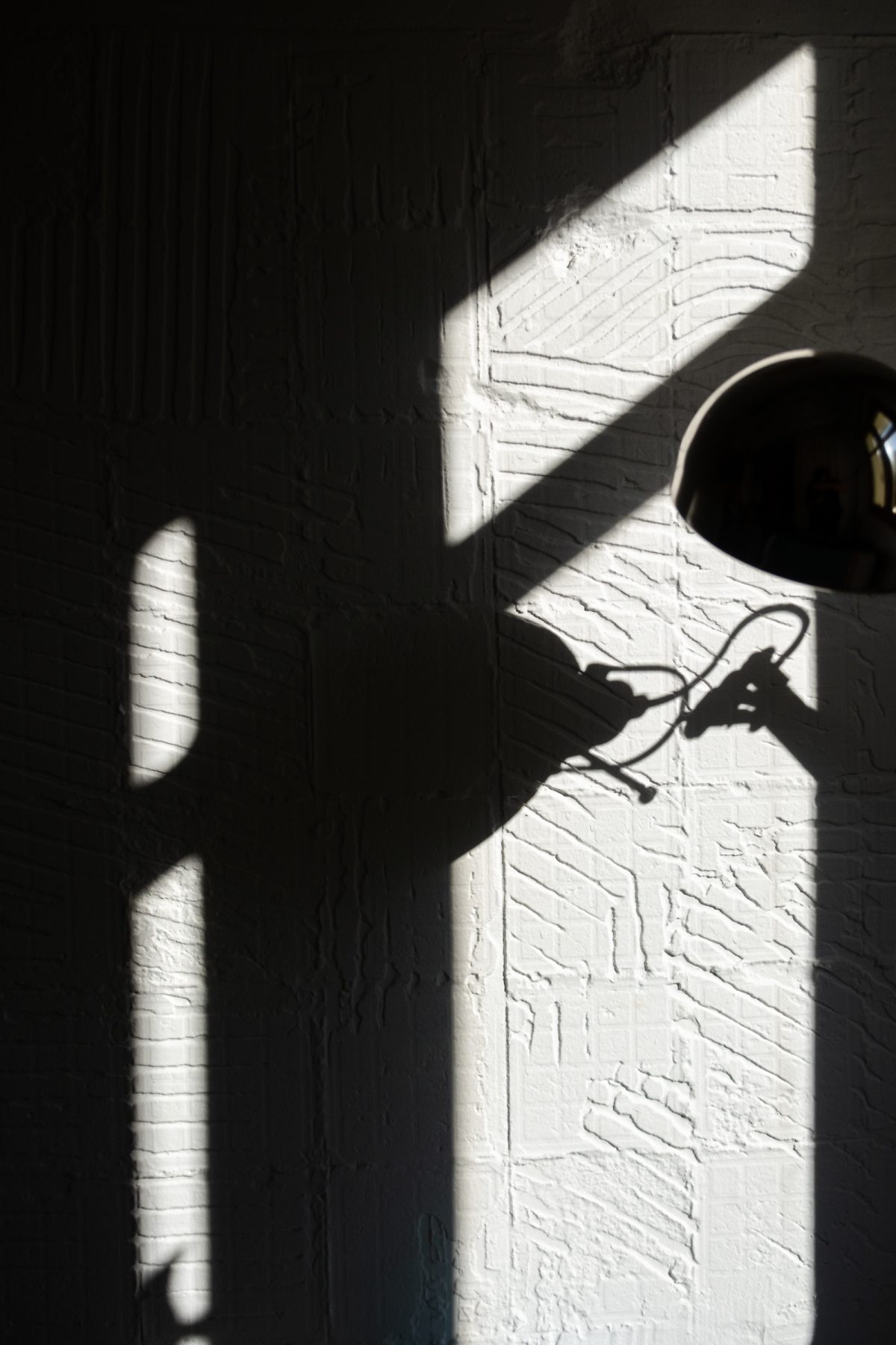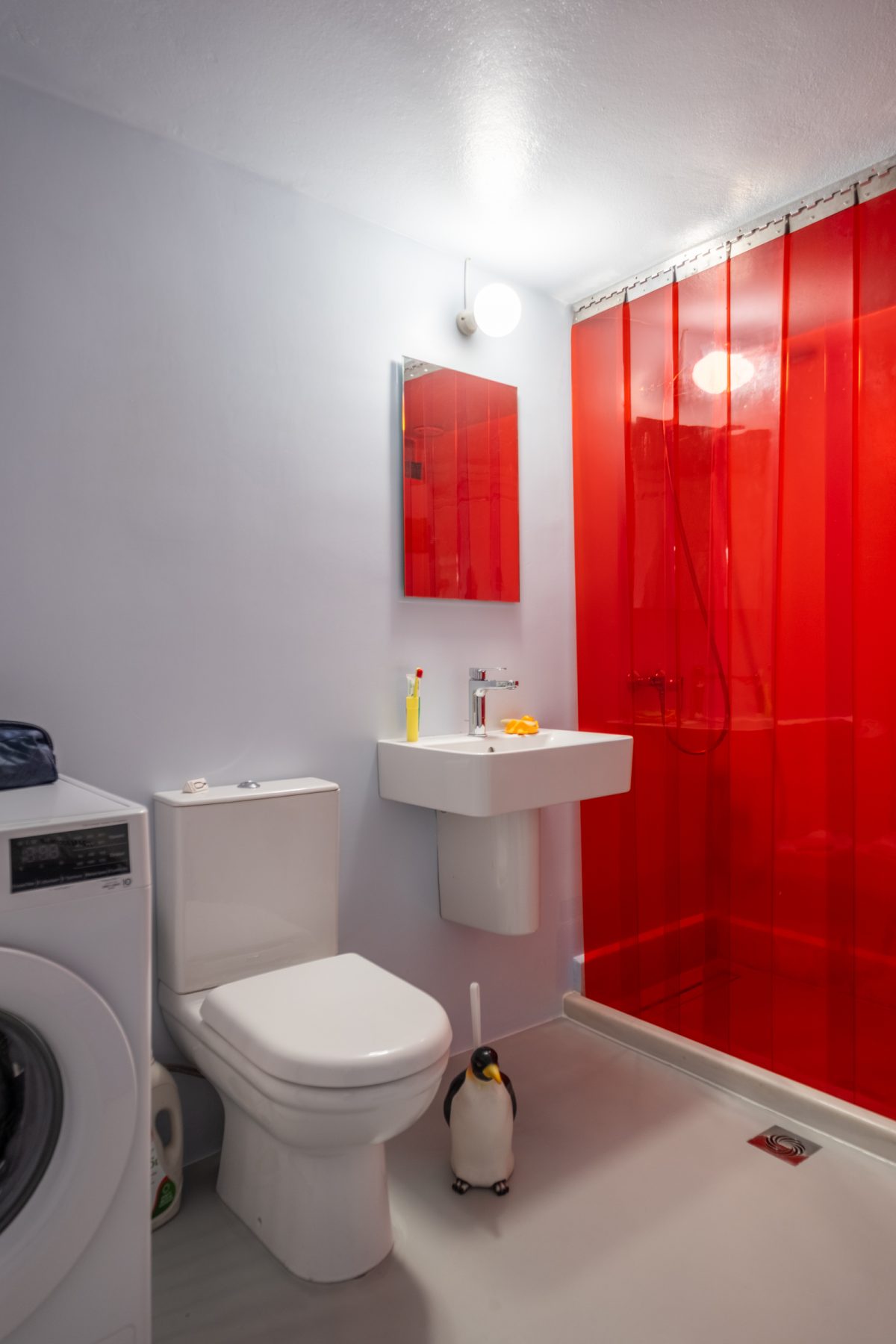A beige linen curtain replaces the wall that once separated the bedroom from the rest of the house. A mattress on wheels carries the sleeping space, adjacent to the home’s only enclosed room — the bathroom. An open mezzanine level, right above the bathroom, enhances visual layering while functioning as an elevated indoor garden and an additional display space for the boundless collection of things. A linear cut filled with glass bricks at the top of the wall defining the bathroom brings natural light into the enclosed space while pointing out where the red bathroom curtain, actually, is.