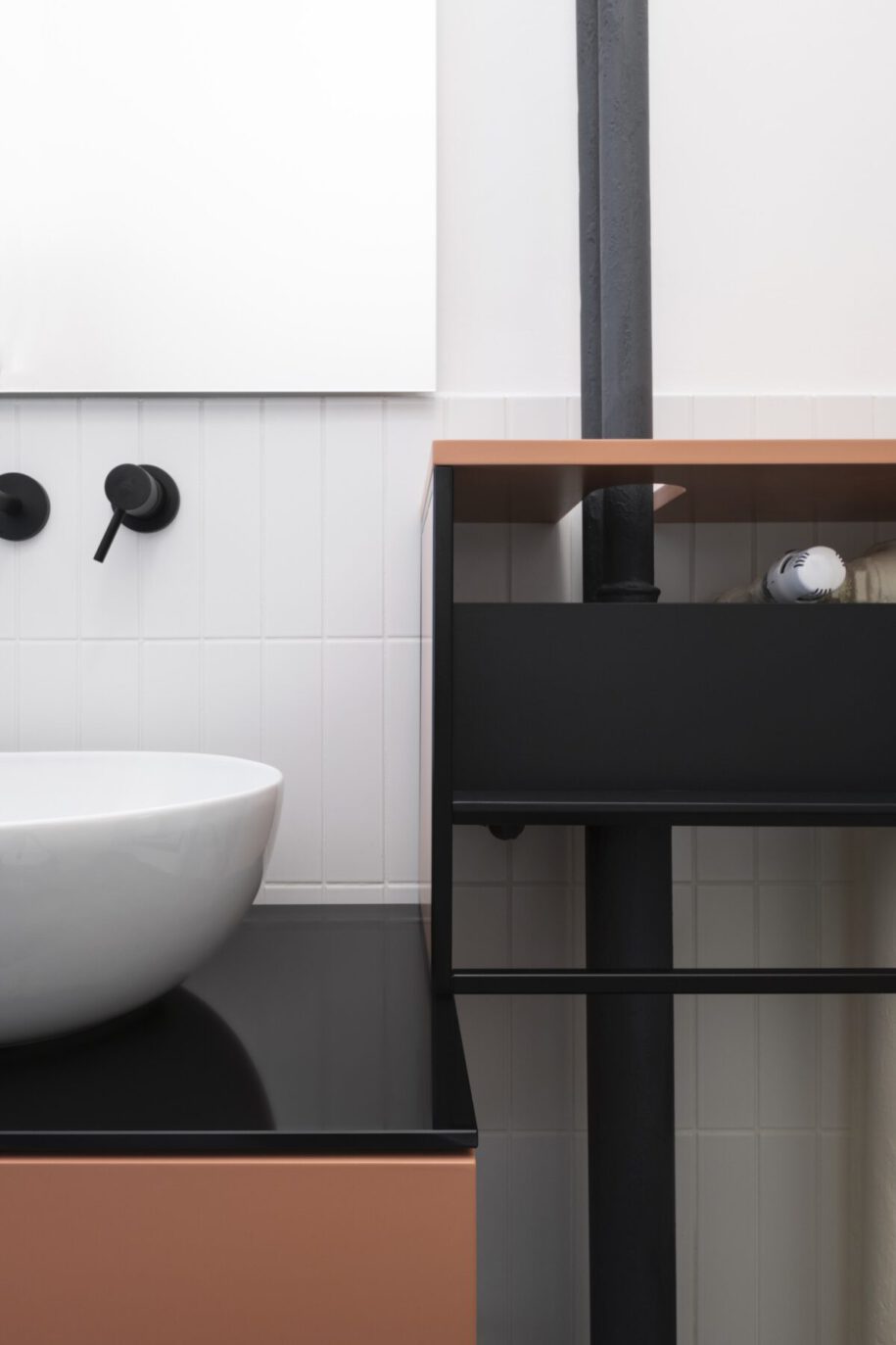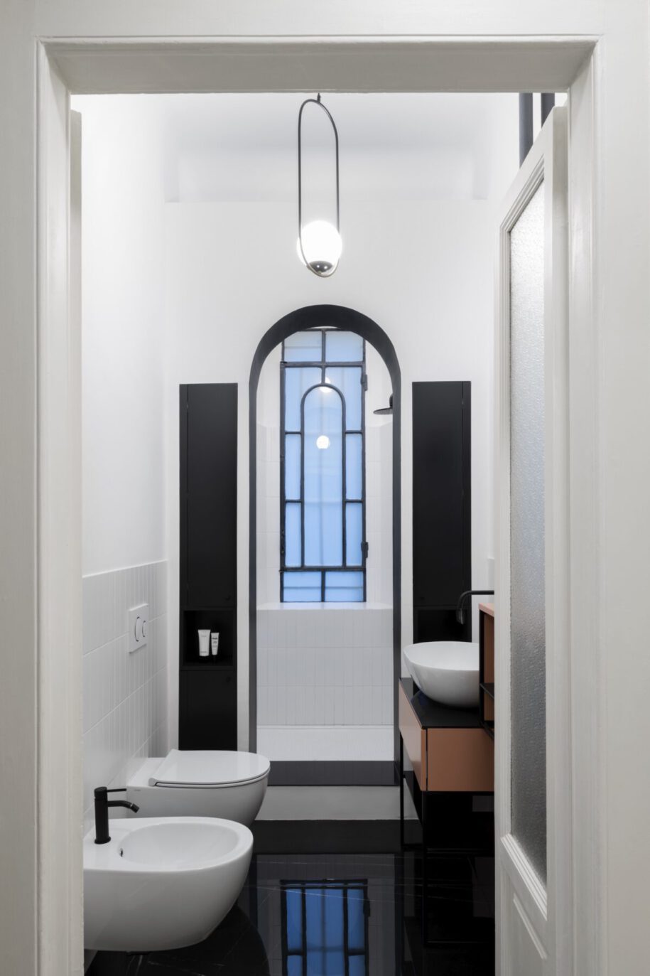 In the bathroom the two-tone black and white appears again: here the only touch of color is given by the furniture of the sink, in shades of brick-red. Here the architects have chosen to match the shapes to the design of the original window and door frame. This is the case with the arched opening that frames the window and gives access to the shower area, tiled in white ceramic. The lacquered furniture integrates the existing radiator in a geometric and minimalist design.