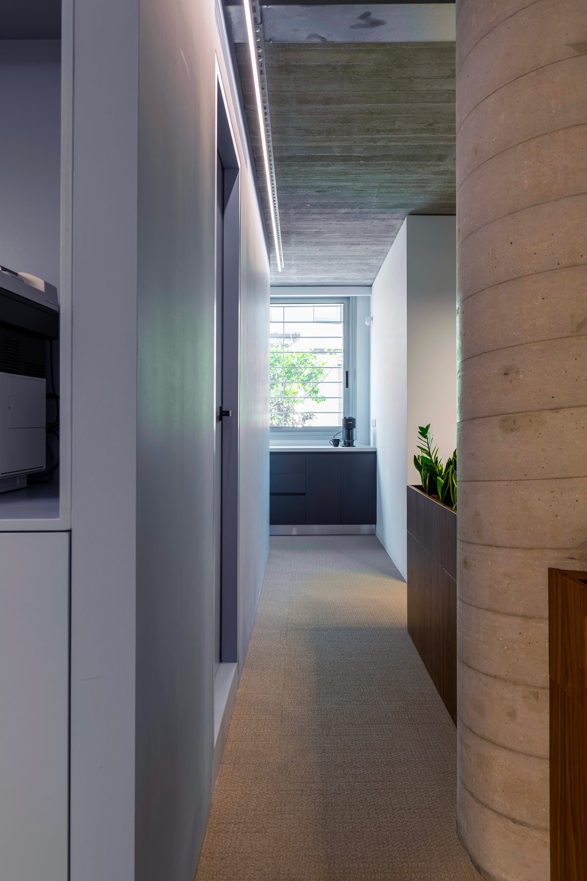 The new layout consists of a communal elongated core, around which the more private workspaces and auxiliary functions are arranged. The core accommodates the circulation corridor, four open workstations, a lounge area, storage units, a printer station and a wardrobe. Surrounding it are seven distinct office rooms (with one to three workstations each), the executive office, a soundproof meeting booth, WC and a kitchenette.