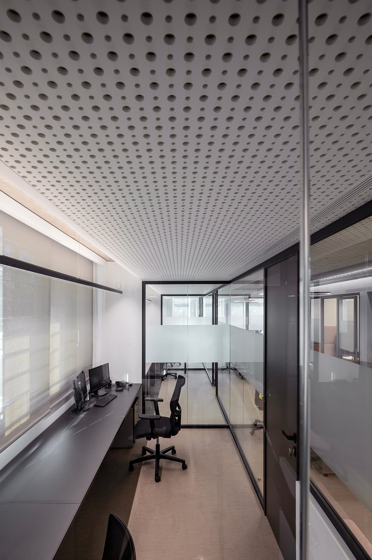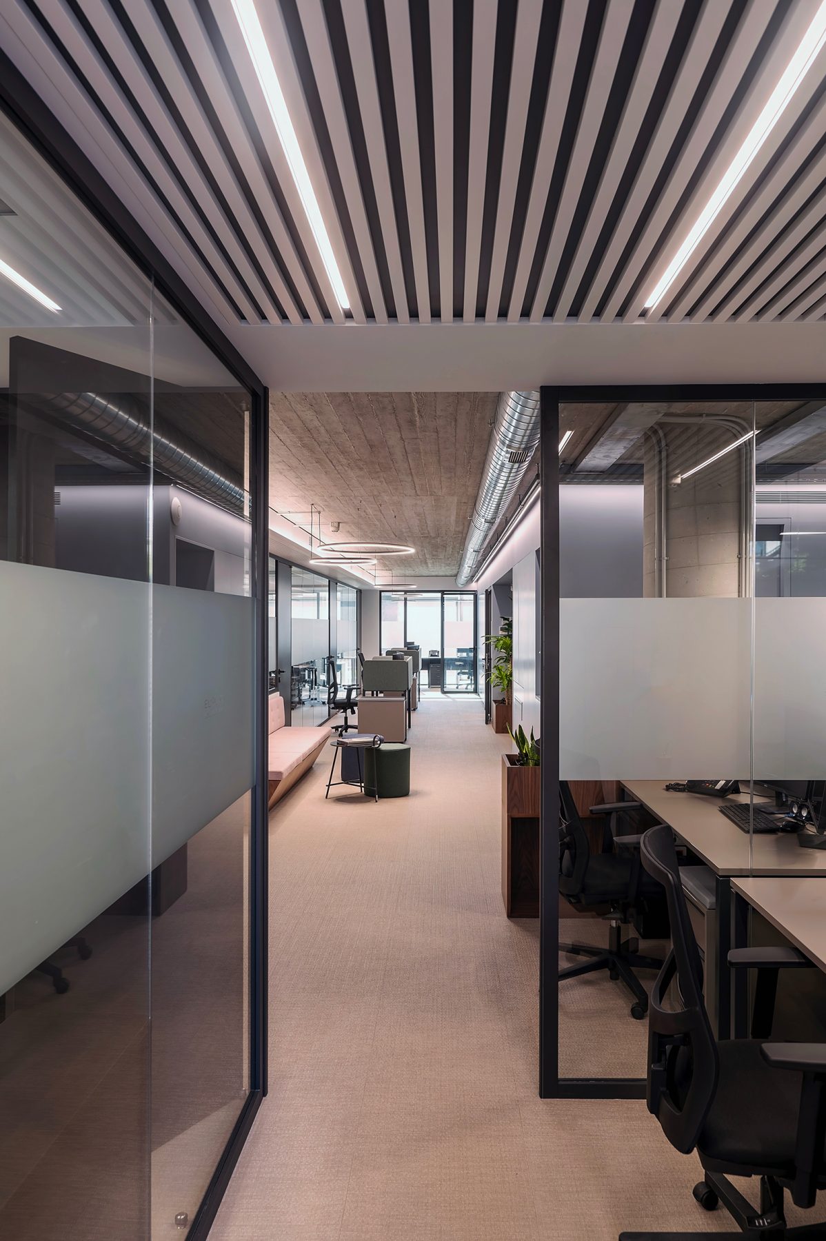 We used glass partions in order to maximize visibility and continuity, enhancing a sense of openness, flow and the unified perception of space.
