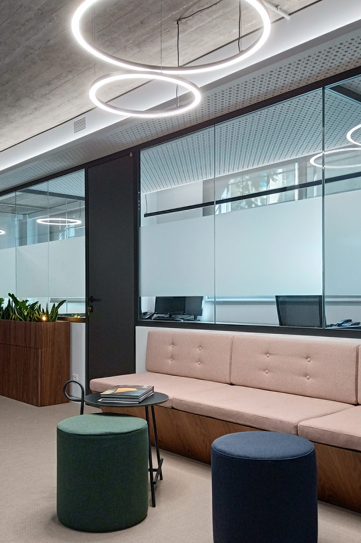 The offices occupy the ground floor of a six-story building, which was constructed in the 1990s. The requirements of the assignment, both on functional and aesthetic level, were: