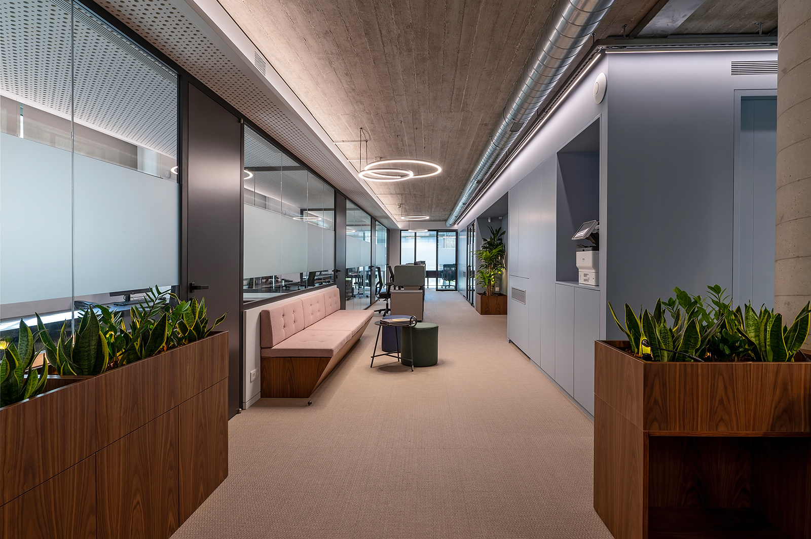 In contrast to the exposed industrial materials—concrete, glass, aluminum, pipes and wires—we introduced a woven vinyl floor in a warm sandy hue, luxurious walnut veneer surfaces, upholstery fabrics in pops of green and pink and bespoke planters with greenery to enrich the workspace atmosphere.