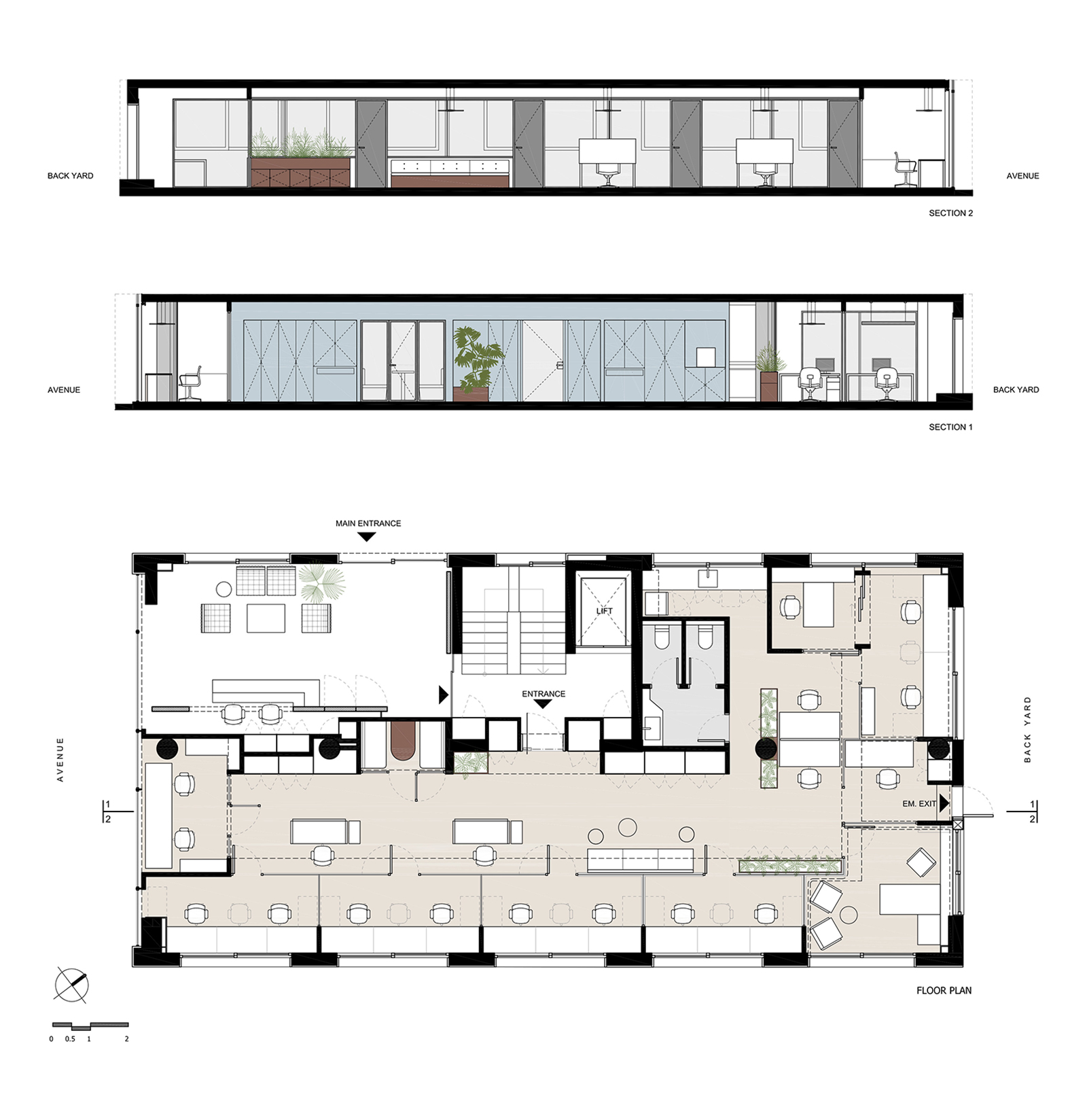 Πρόκειται για την ισόγεια στάθμη εξαόροφου κτιρίου γραφείων, κατασκευής της δεκαετίας του 1990. Ζητούμενα της αναδιαμόρφωσης του χώρου, τόσο σε λειτουργικό όσο και σε αισθητικό επίπεδο, ήταν: