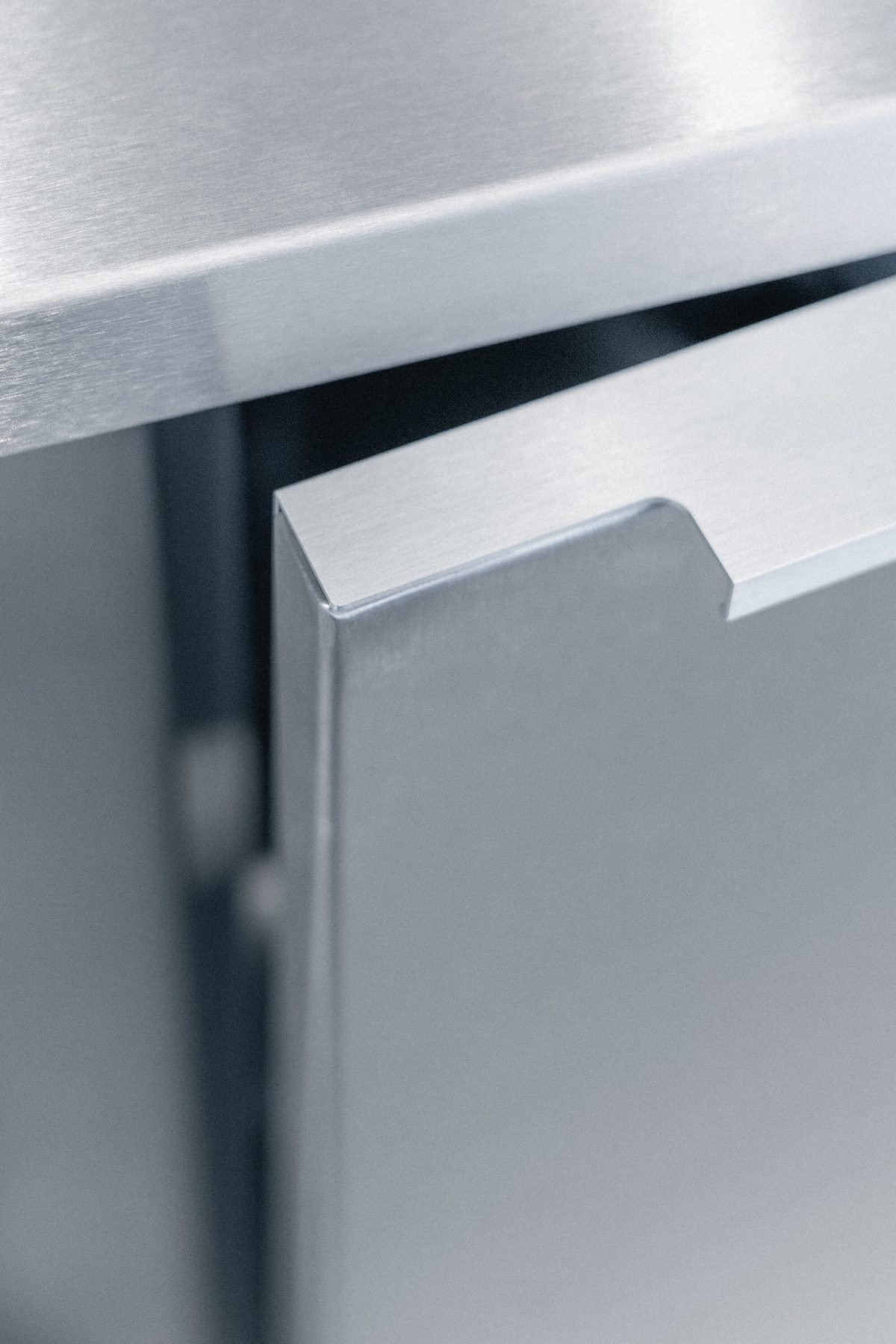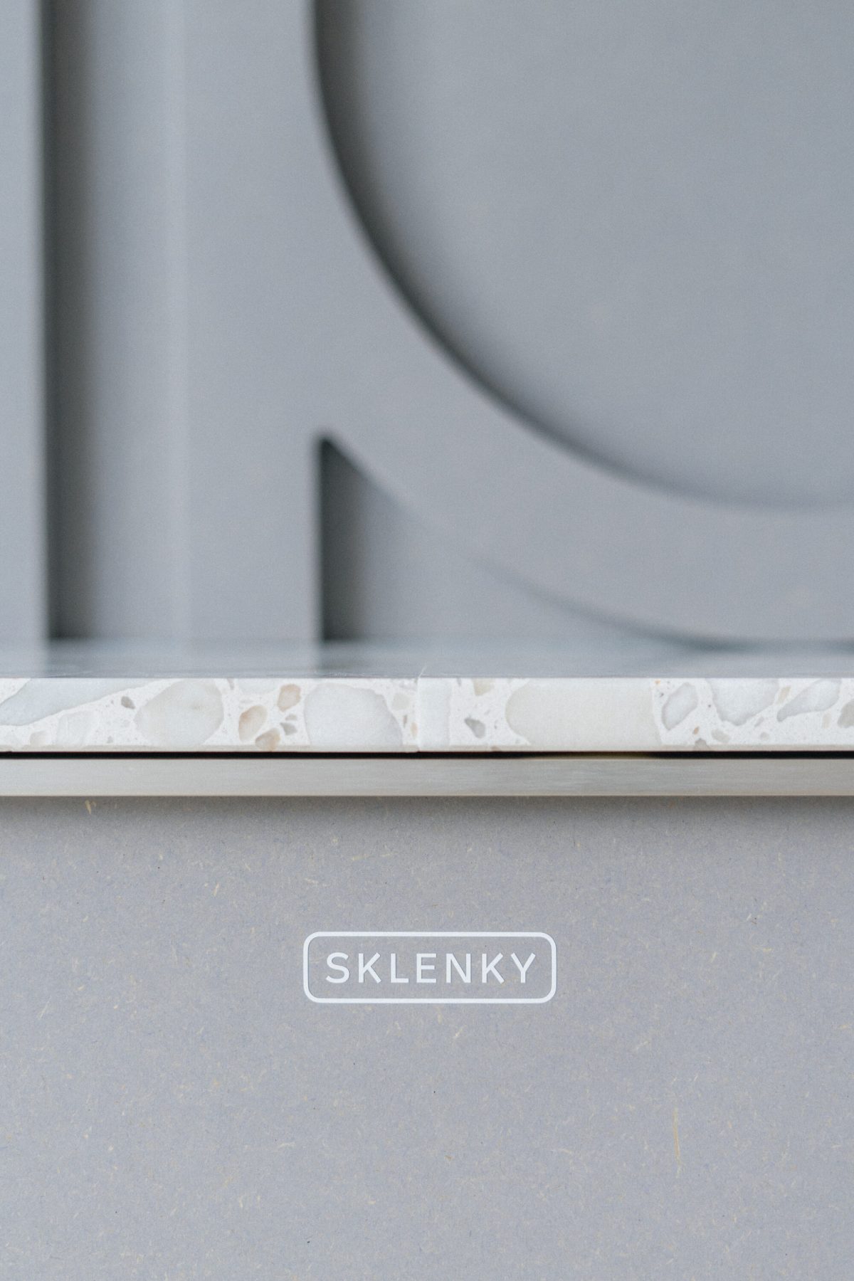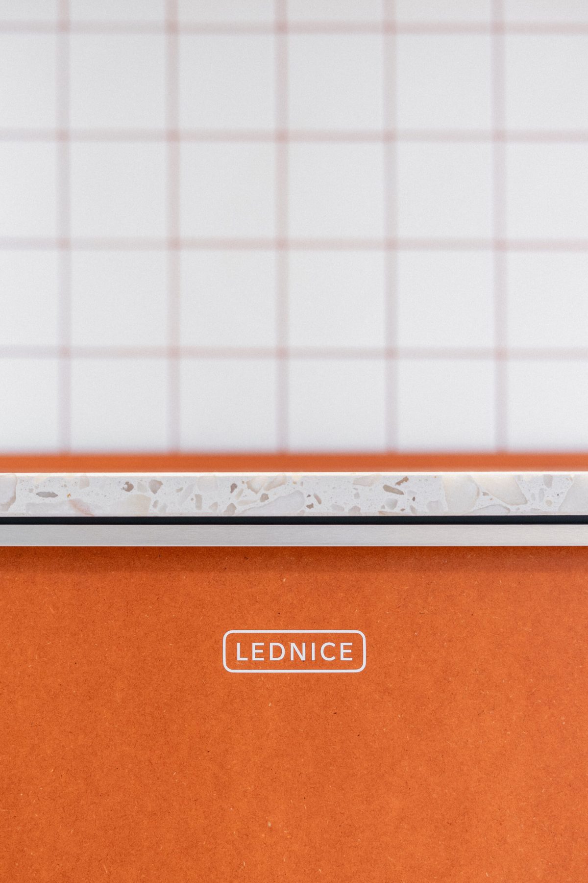 The materials used underline the precise and contemporary character of the space—the kitchenette features stainless steel cladding and a ceramic island, while the meeting room includes custom MDF paneling that incorporates the company logo motif as a pattern. These unique elements and custom furniture were supplied by specialists from the company Brick.