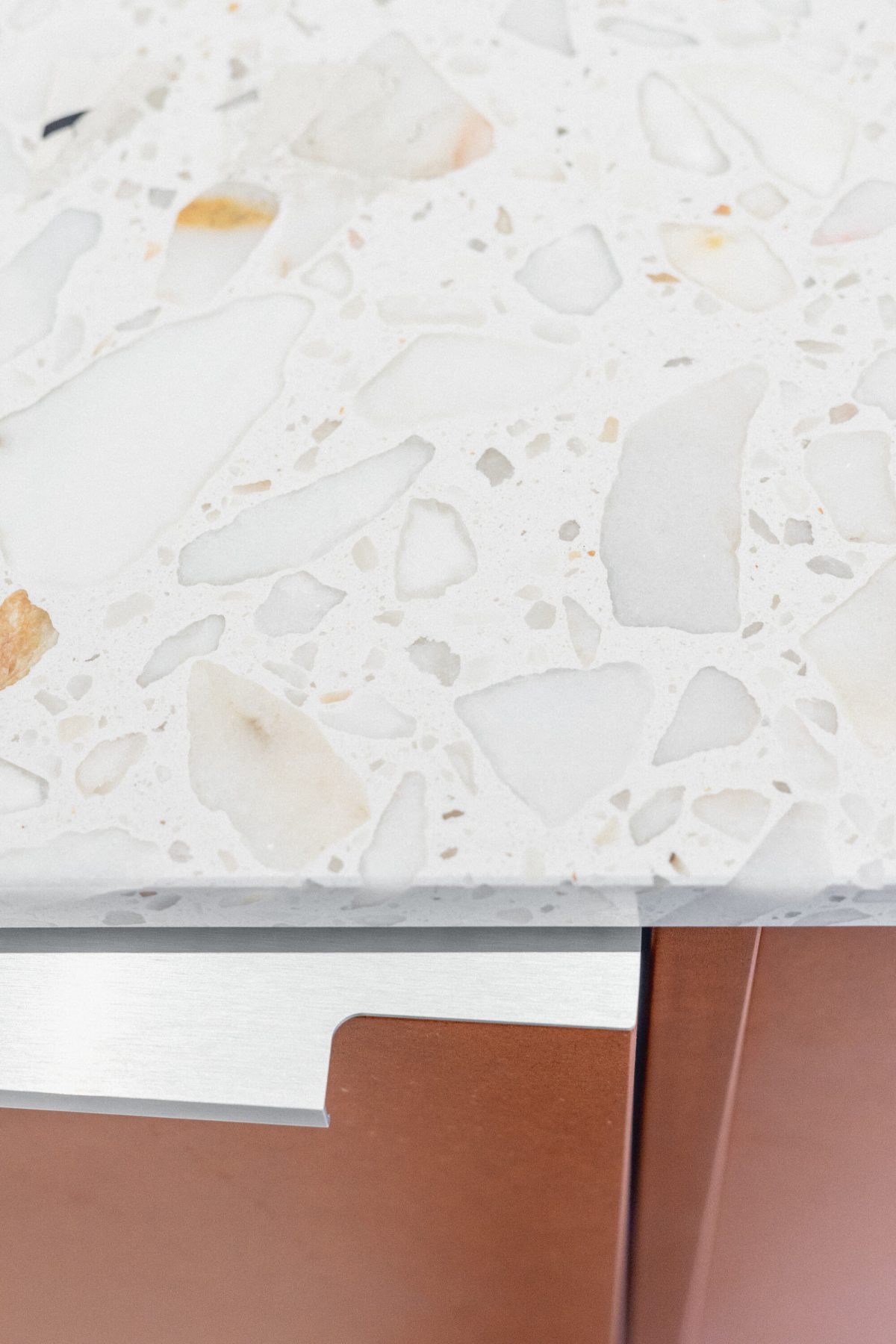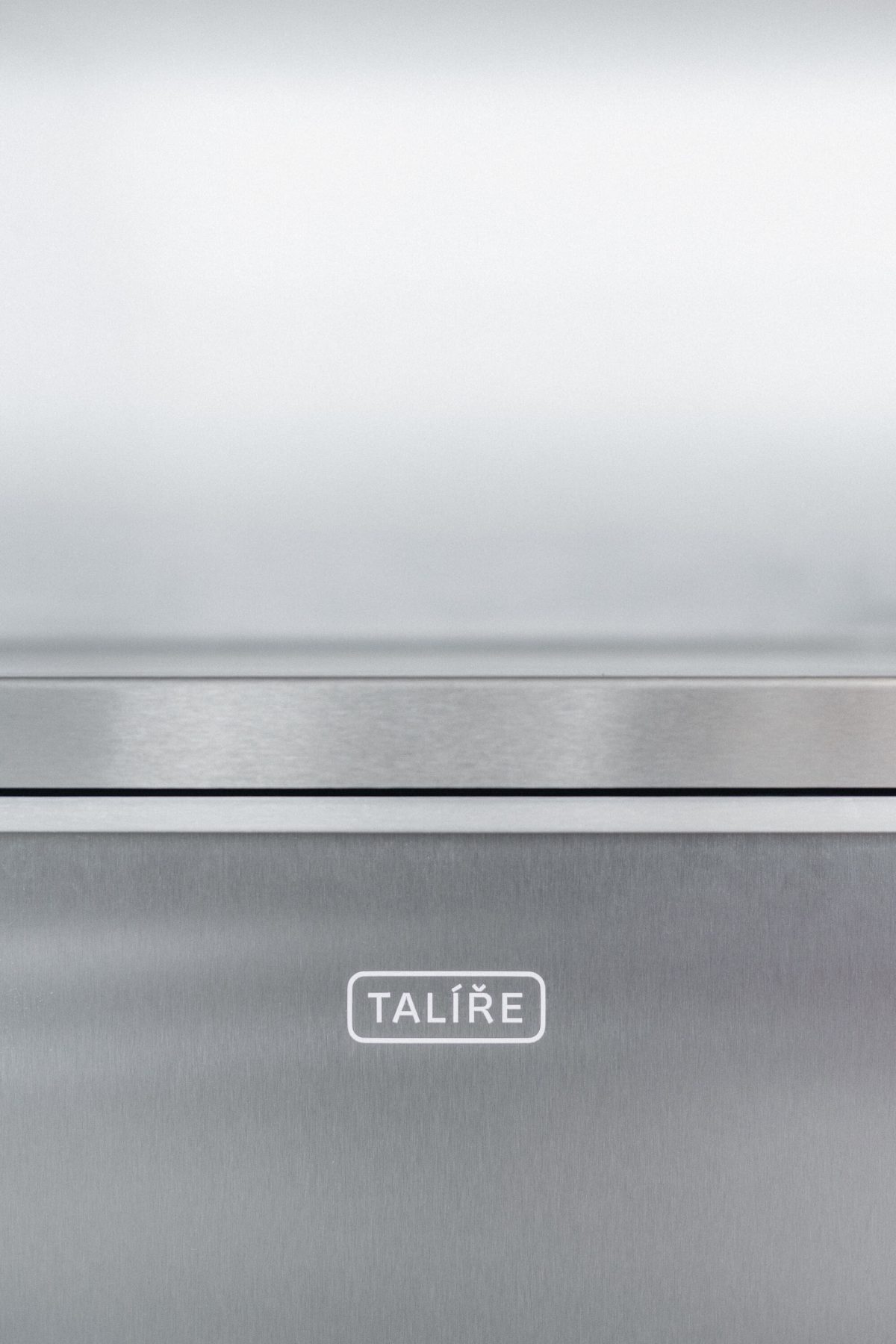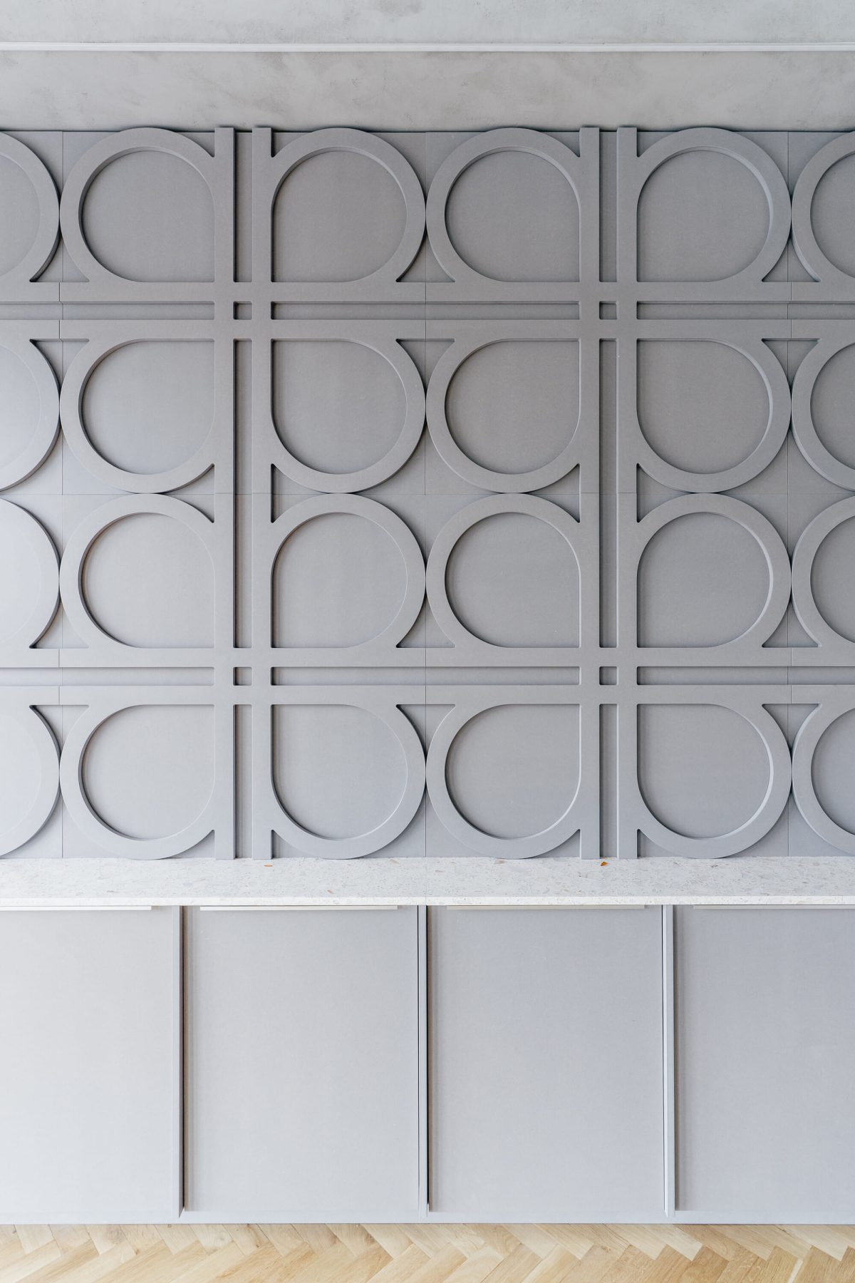 The materials used underline the precise and contemporary character of the space—the kitchenette features stainless steel cladding and a ceramic island, while the meeting room includes custom MDF paneling that incorporates the company logo motif as a pattern. These unique elements and custom furniture were supplied by specialists from the company Brick.