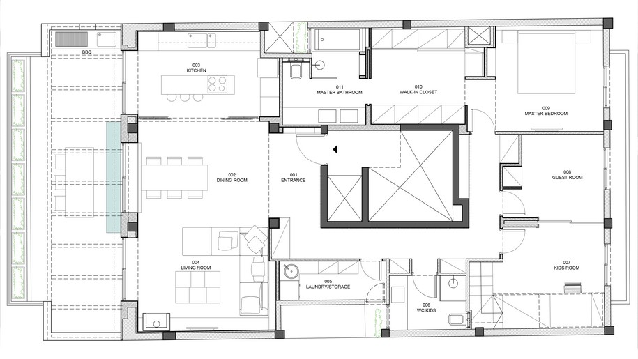 Επιλέχθηκε να χωροθετηθεί κατ’επέκταση του καθιστικού και της τραπεζαρίας δημιουργώντας έναν ενιαίο χώρο με άπλετο φυσικό φωτισμό για όλη την ημέρα.