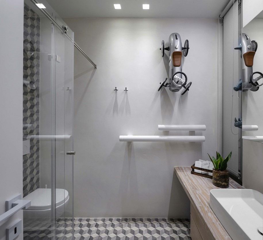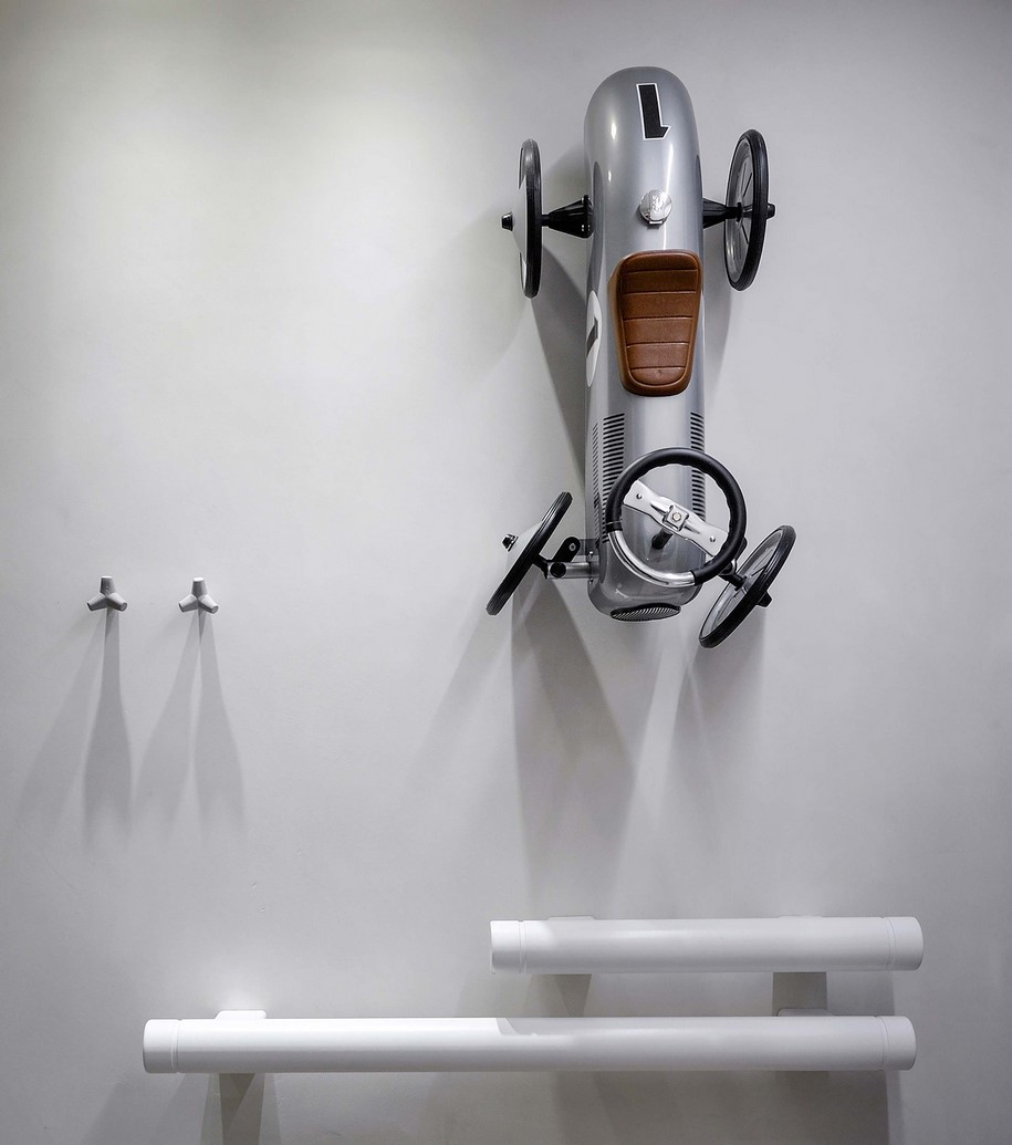 In the kids’ bedroom, a large sliding door connects the space with the adjacent auxiliary room, uniting them and creating a large, open playroom.