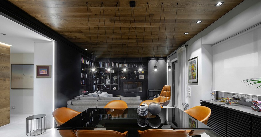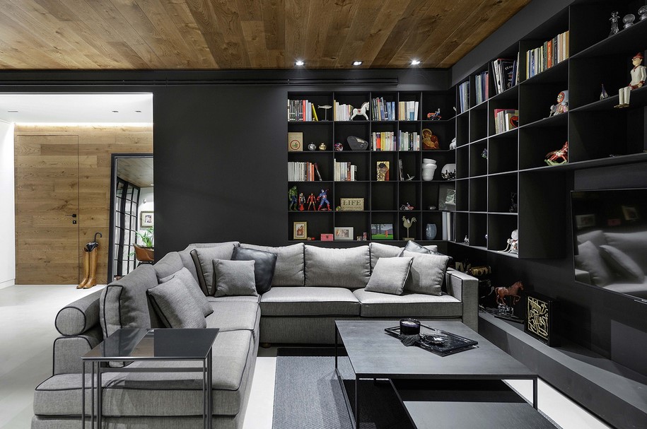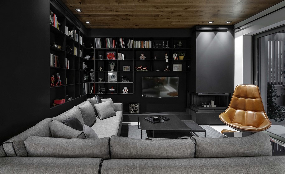 Dominant element of the living room is the custom furniture that was designed to accommodate the owners’ books and collectibles as well as technological equipment.