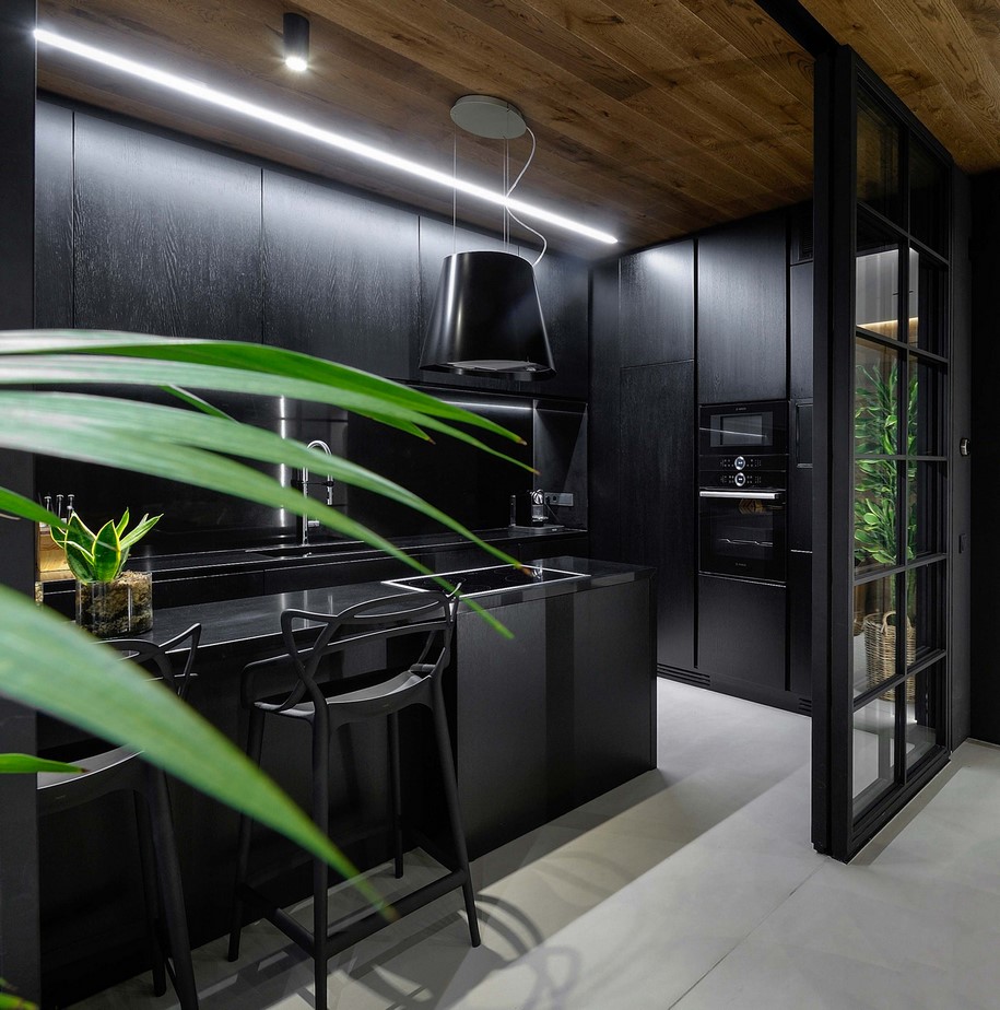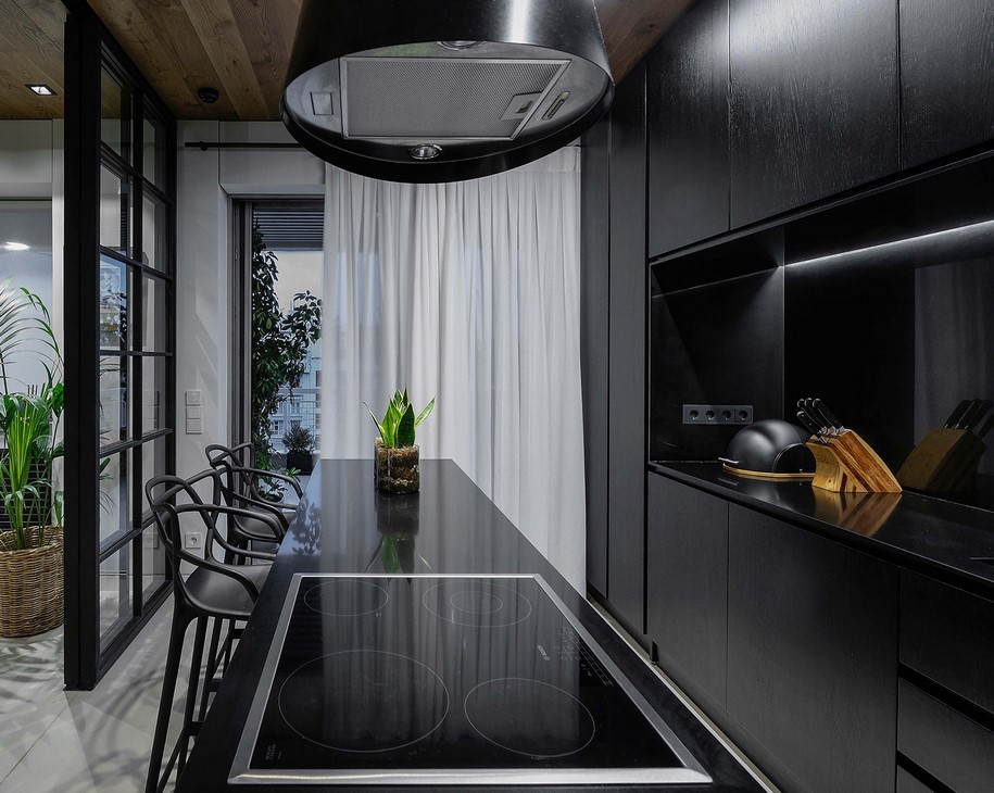 Σχεδιαστικά μεγάλη πρόκληση αποτέλεσε η επιλογή χωροθέτησης και οργάνωσης της κουζίνας.