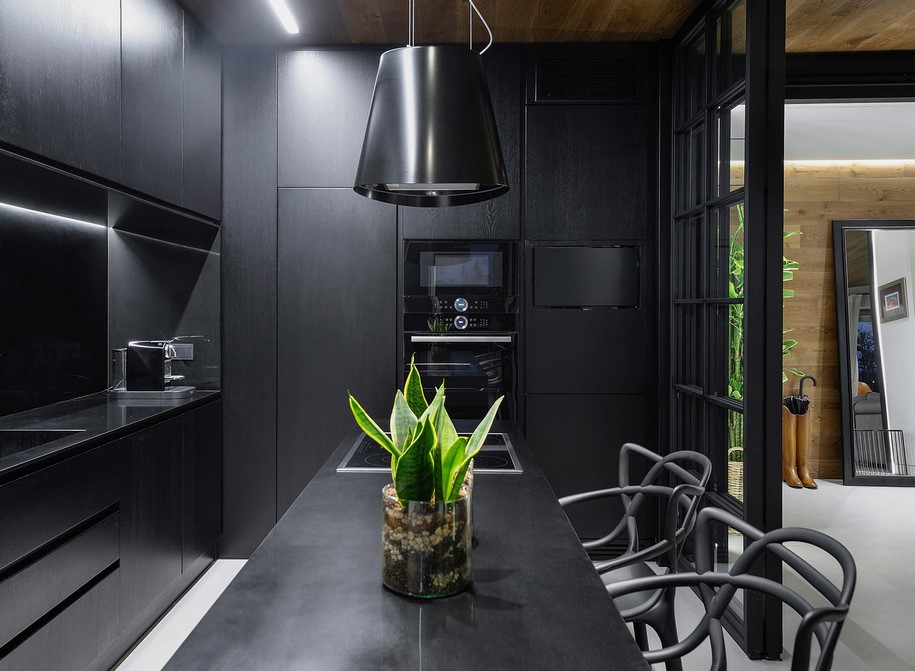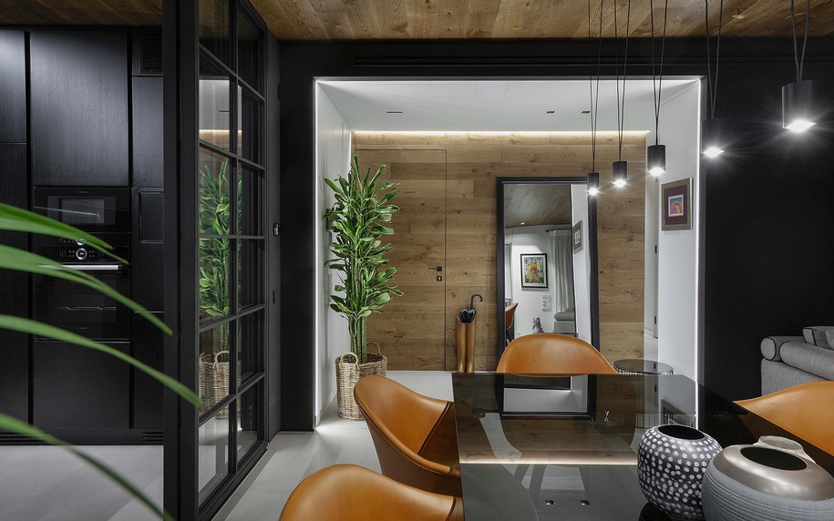 By combining timber furniture and dark accessories with black, custom-made heating pipes and forged cement flooring, the design team managed to compose a unique space with particularly fine qualities.