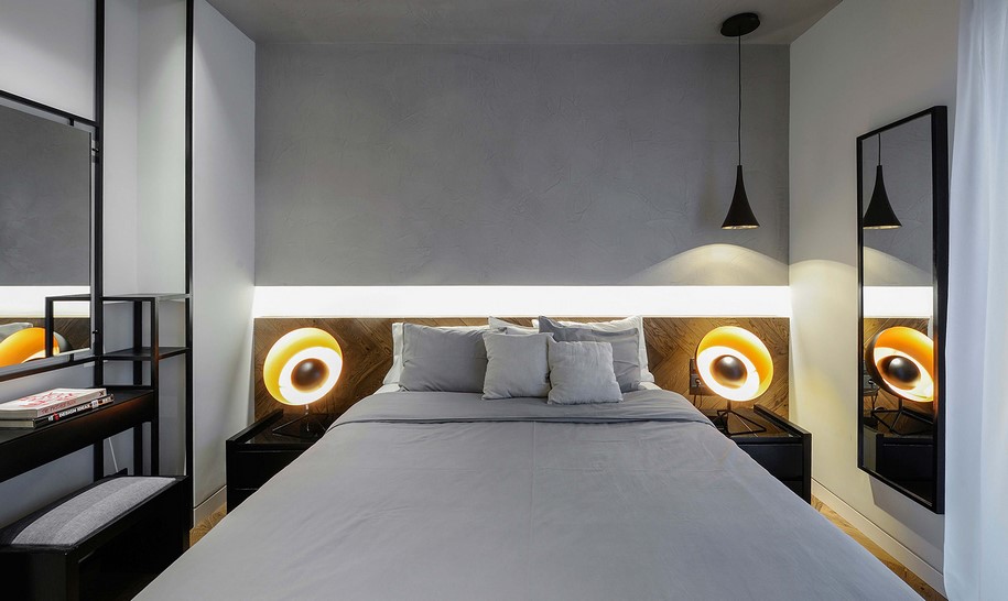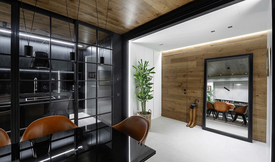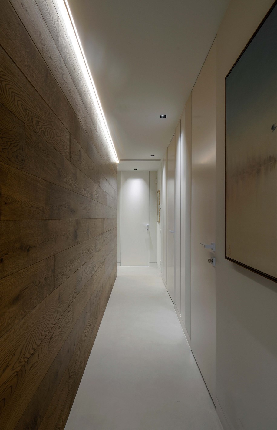 In terms of functional arrangement, the proposal introduced a radical alteration of the flat’s circulation, placing it around the volume of the building’s vertical communication core. The volume was clad with adequately processed walnut timber, creating an interesting path through the residence. Perimetrical illumination on the walnut-clad surface was applied to enhance its texture and natural characteristics.