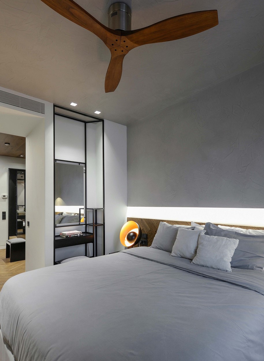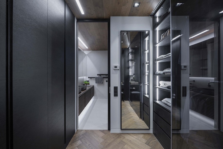 Another important challenge of the overall design process was the master bedroom area, which was conceived as a large space incorporating the master bathroom and dressing room. The wardrobe area was placed between the bedroom and bathroom spaces, creating a functional in-between space. Large surfaces of dark tinted glass were selected to enhance the space’s sense of depth.