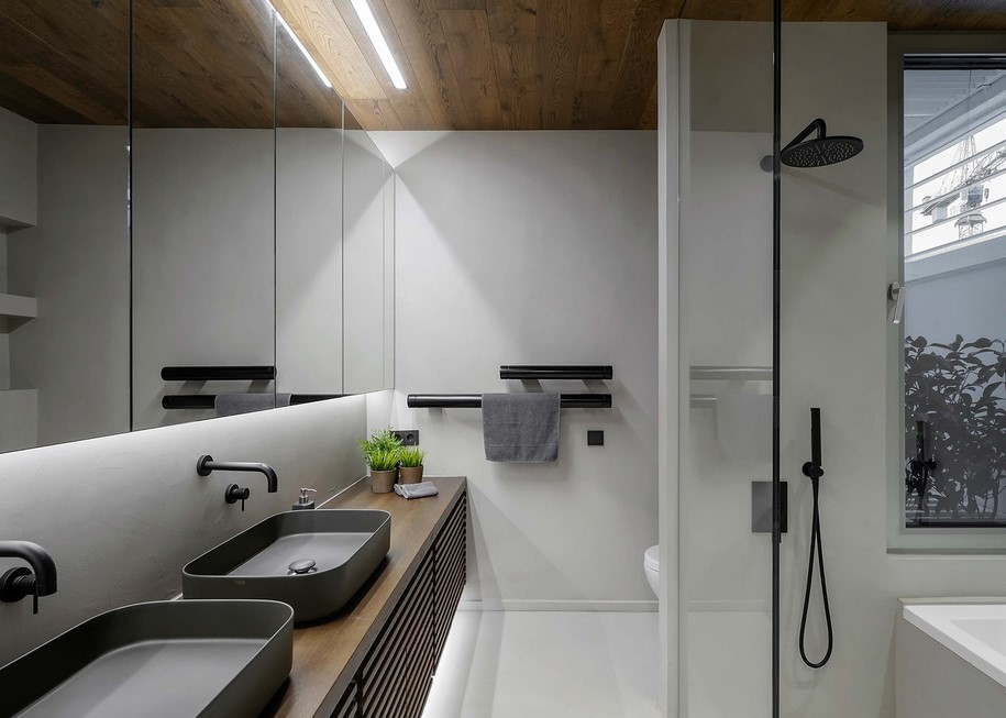 Για το master bathroom ο συνδυασμός της πατητής τσιμεντοκονίας, των ξύλινων επίπλων, των μαύρων custom-made σωλήνων θέρμανσης και των μαύρων αξεσουάρ, δημιουργεί έναν ιδιαίτερο και μοναδικό χώρο. Παράλληλα η διεύρυνση του παραθύρου και η τοποθέτηση φυτών στον φωταγωγό δίνει μία διαφορετική αίσθηση στο λουτρό.