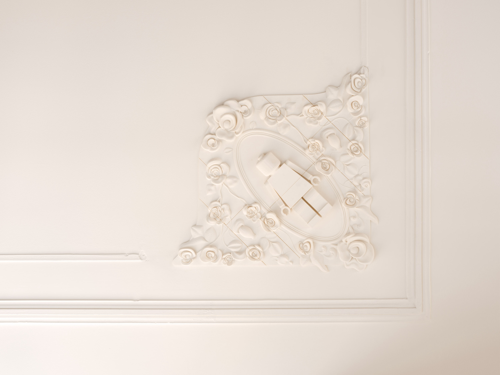 In the bathroom, as in the rest of the apartment, the original terrazzo flooring has been retained. Though not particularly ornate, it serves as a testament to the architectural history of the Liguria region. Following the same principle, the decorative stuccoes on the ceiling, dating back to the early 20th century, have also been preserved. Due to a missing corner stucco, a decision was made to reinterpret it in a contemporary style by modeling and then 3D printing it. Unlike the other designs, the central motif depicts a Lego figure—an amusing Easter egg, according to architects Luca Scardulla and Federico Robbiano, reflecting the playful nature of the studio and its clients.