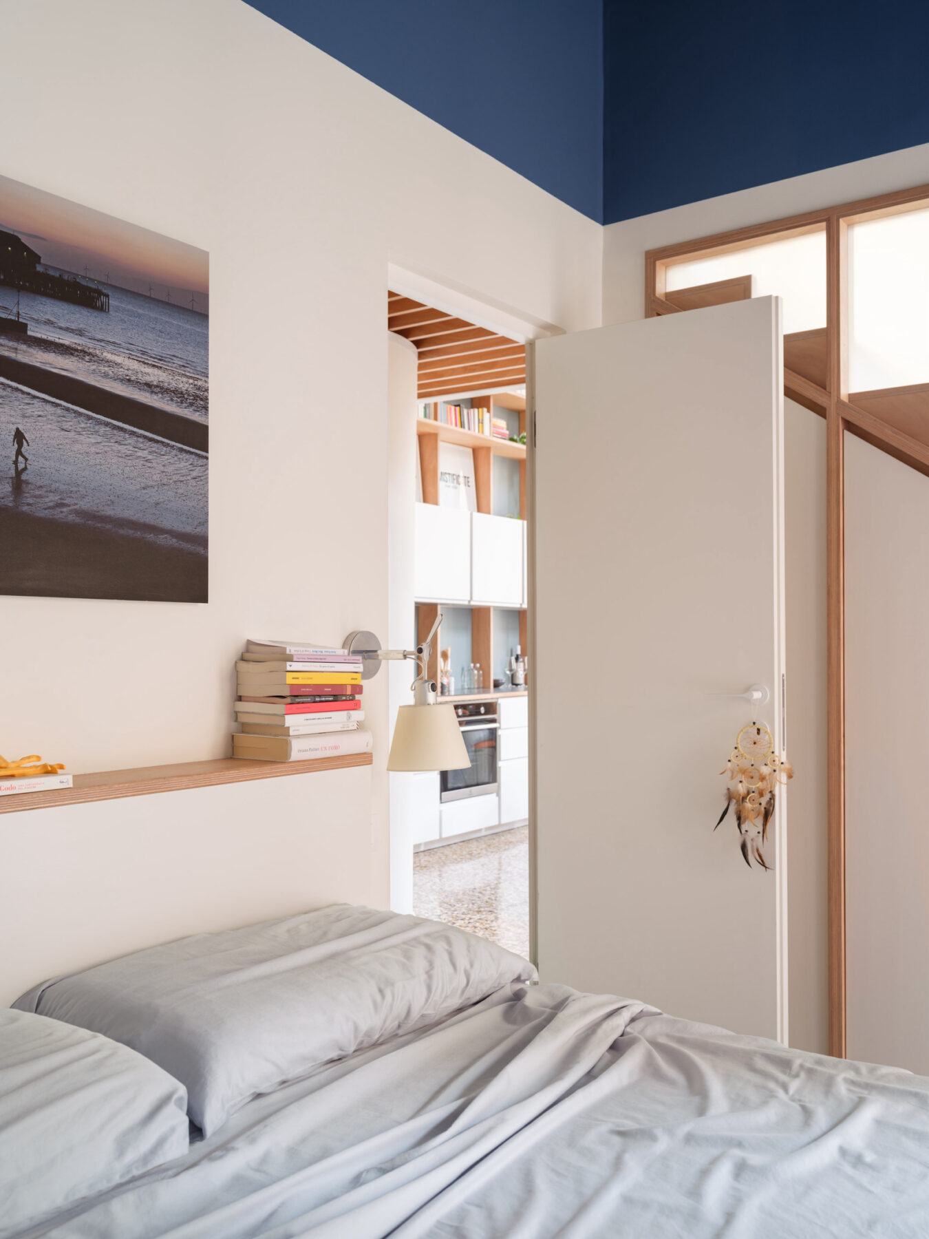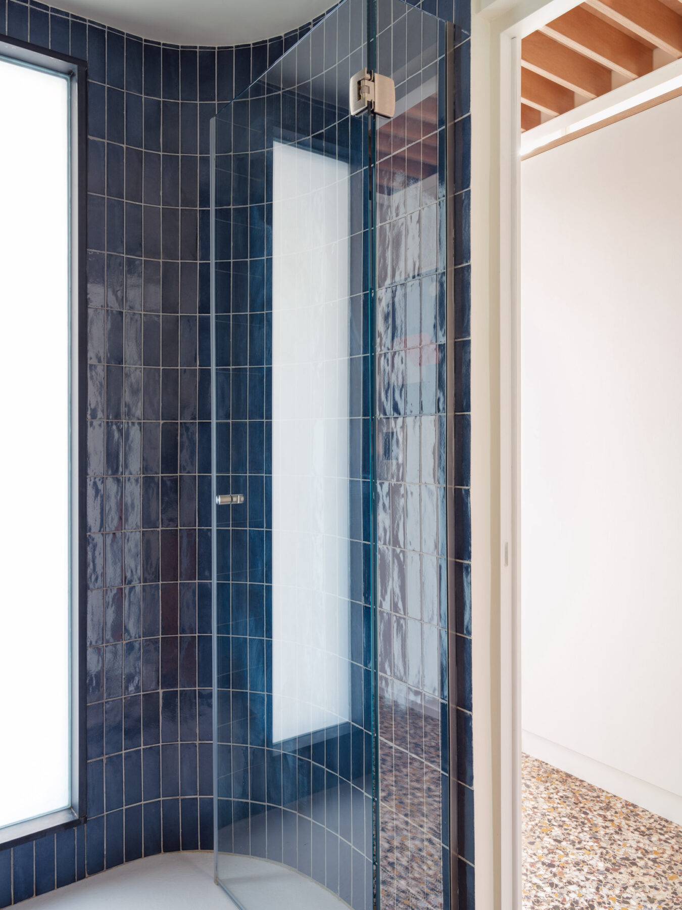 The loft follows a meandering path until it expands into a small protruding curved form, continuing the design solution adopted in the volume below. In the loft, the curvature aims to lighten the projecting part of the structure, while in the lower section it softens the edge of the volume, creating an asymmetry between the walls that define the corridor. The curve of the lower volume outlines the shower space of the bathroom, separated by a vertical glass with slate mullions that bring natural light into the otherwise enclosed small area. The play of light cuts through the small dark blue tiles, making them vibrate. The same tiles, but in a different color, have been used throughout the rest of the bathroom.