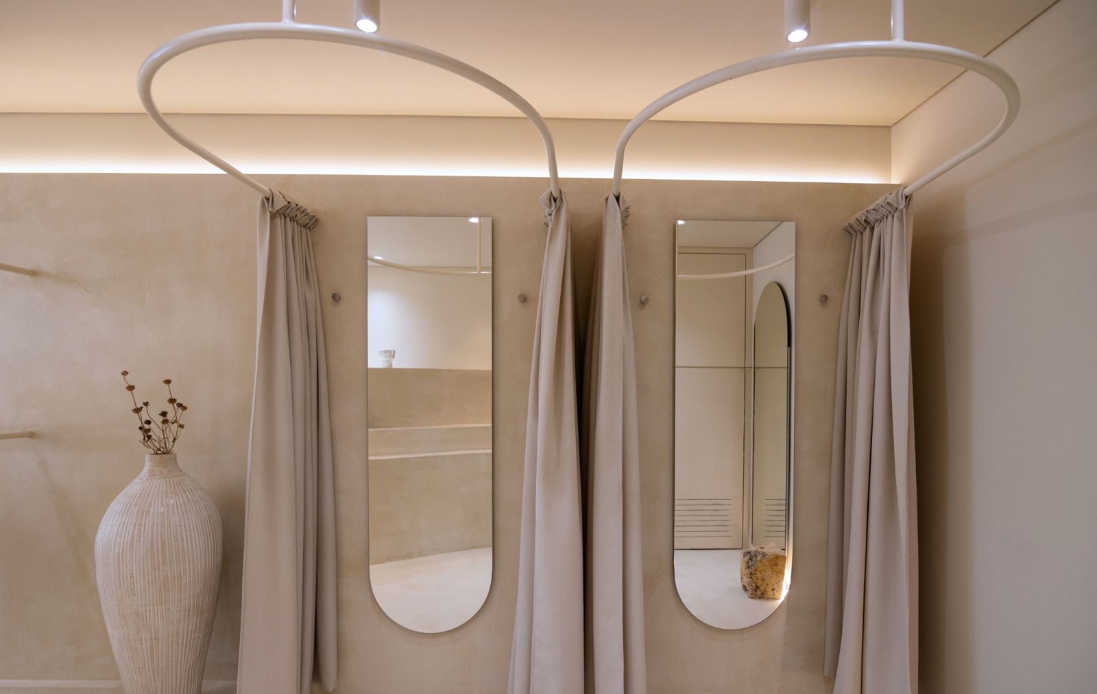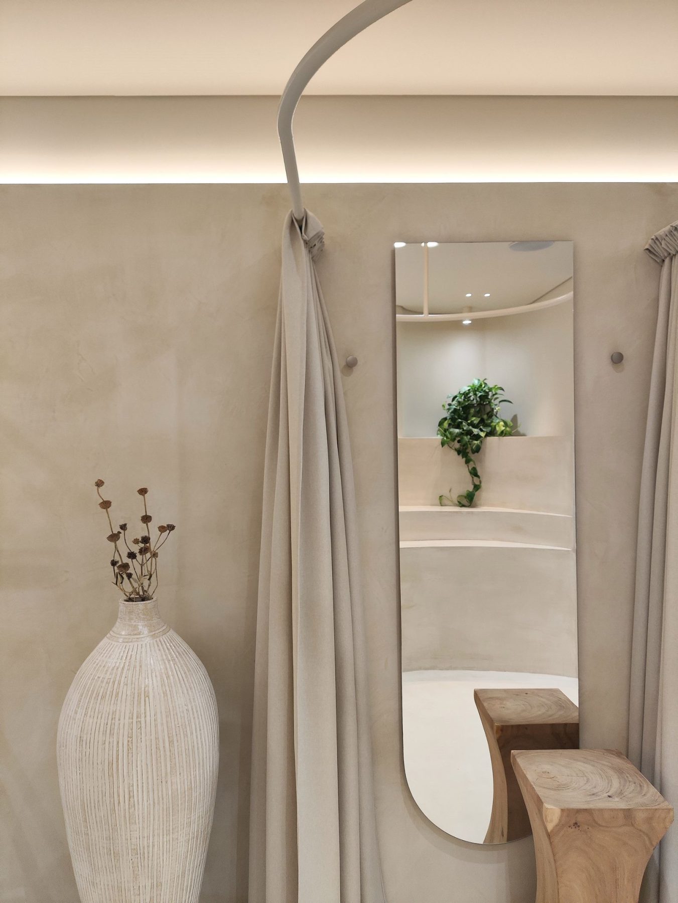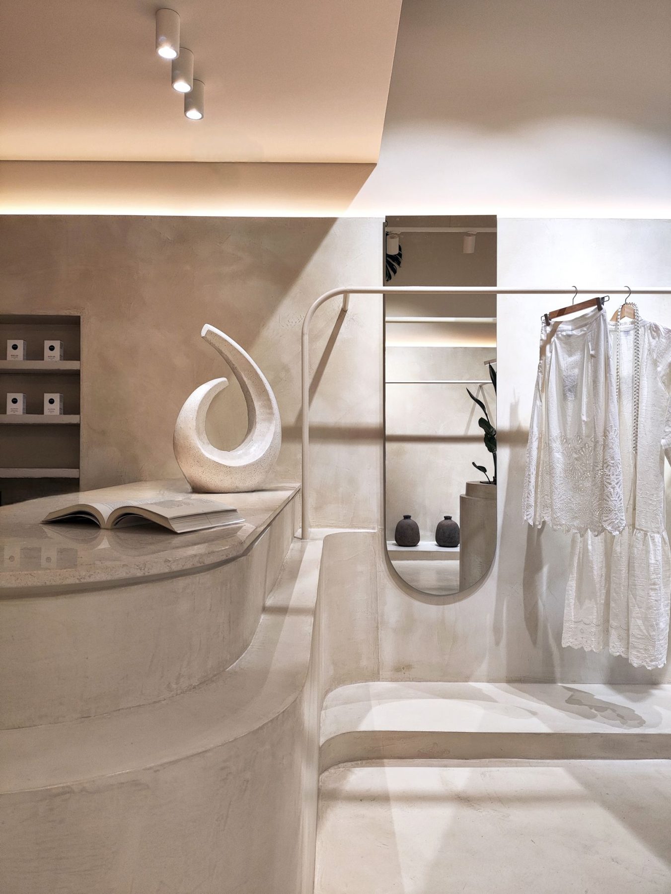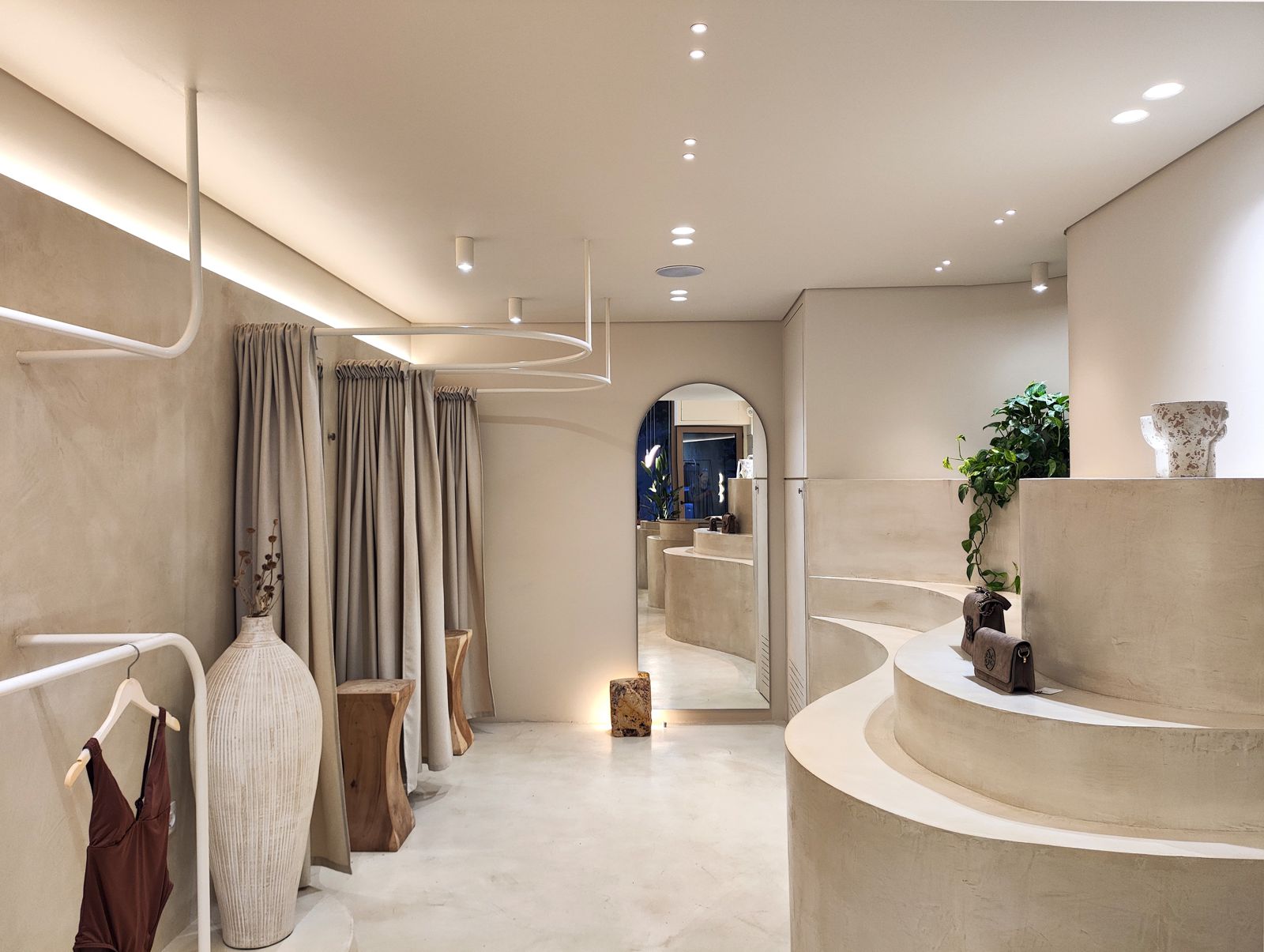 Ο σχεδιασμός αυτού του καταστήματος στα Χανιά από Nōema Studio βασίστηκε στην καμπύλη, ως αναφορά στη φυσική γραμμή του γυναικείου σώματος. Η ροϊκότητα του χώρου και οι οργανικές μορφές σε γήινους τόνους, με κυρίαρχο υλικό την πατητή τσιμεντοκονία, διαμόρφωσαν ένα καθαρό, ενιαίο και λιτό αισθητικό αποτέλεσμα.
