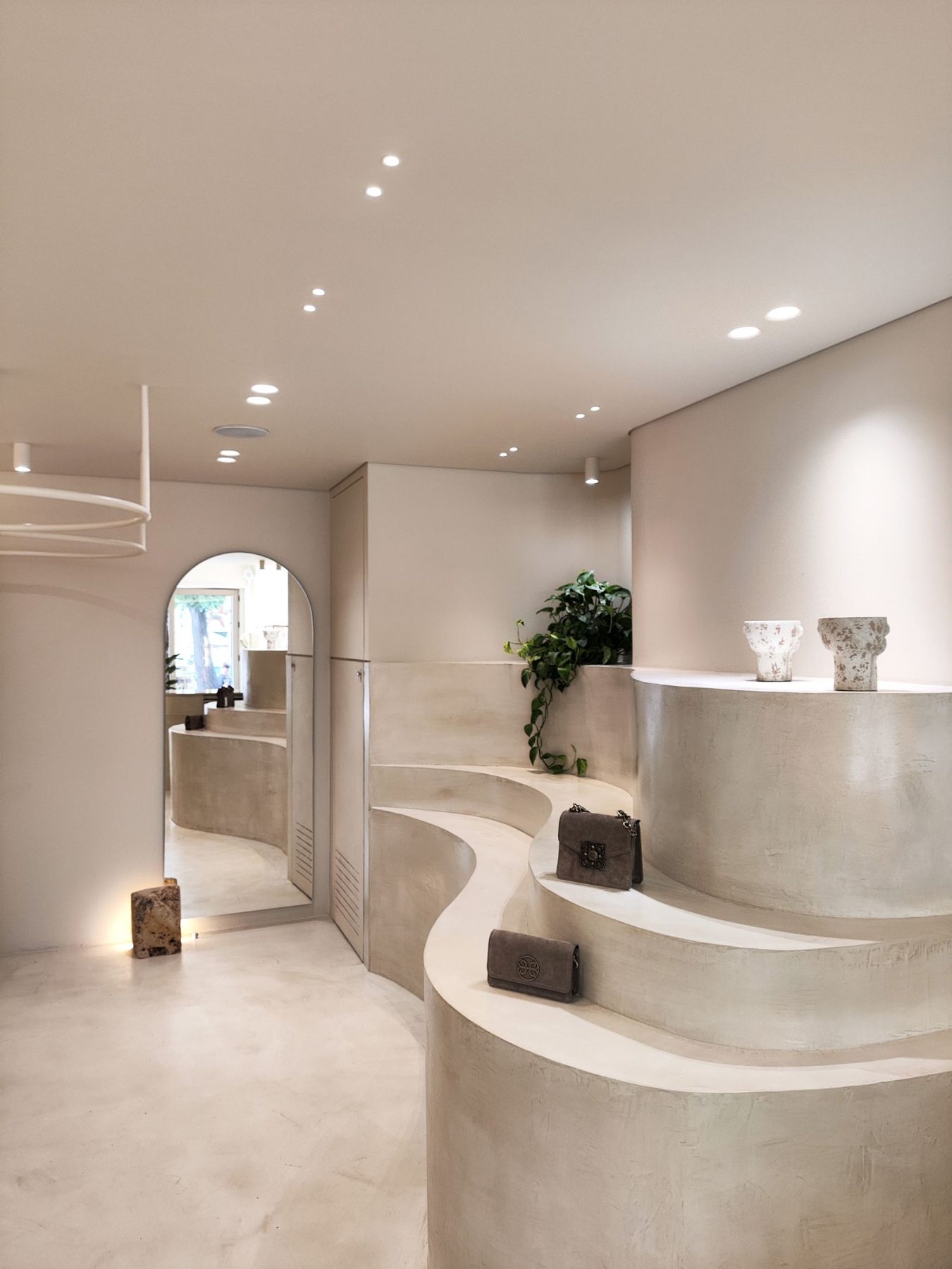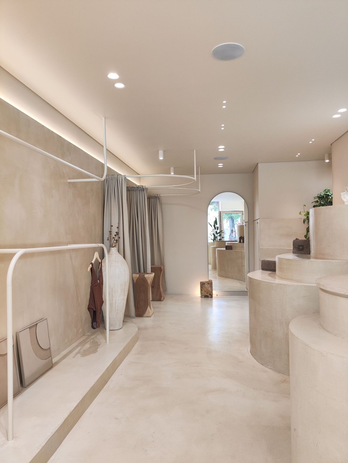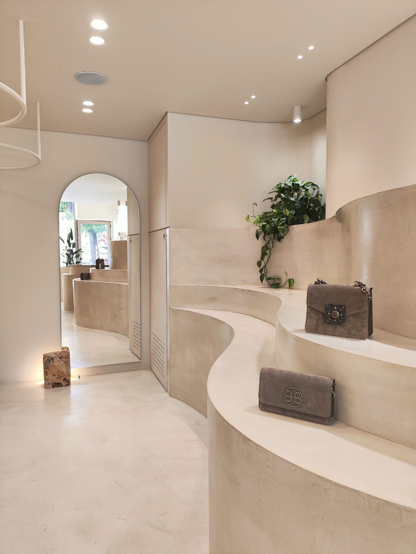 The design of this store in Chania by Nōema Studio draws its inspiration from the curve, referencing the natural contours of the female body. The spatial fluidity and organic forms, rendered in earthy tones and defined by polished cement as the dominant material, establish a clean, unified, and understated aesthetic.
