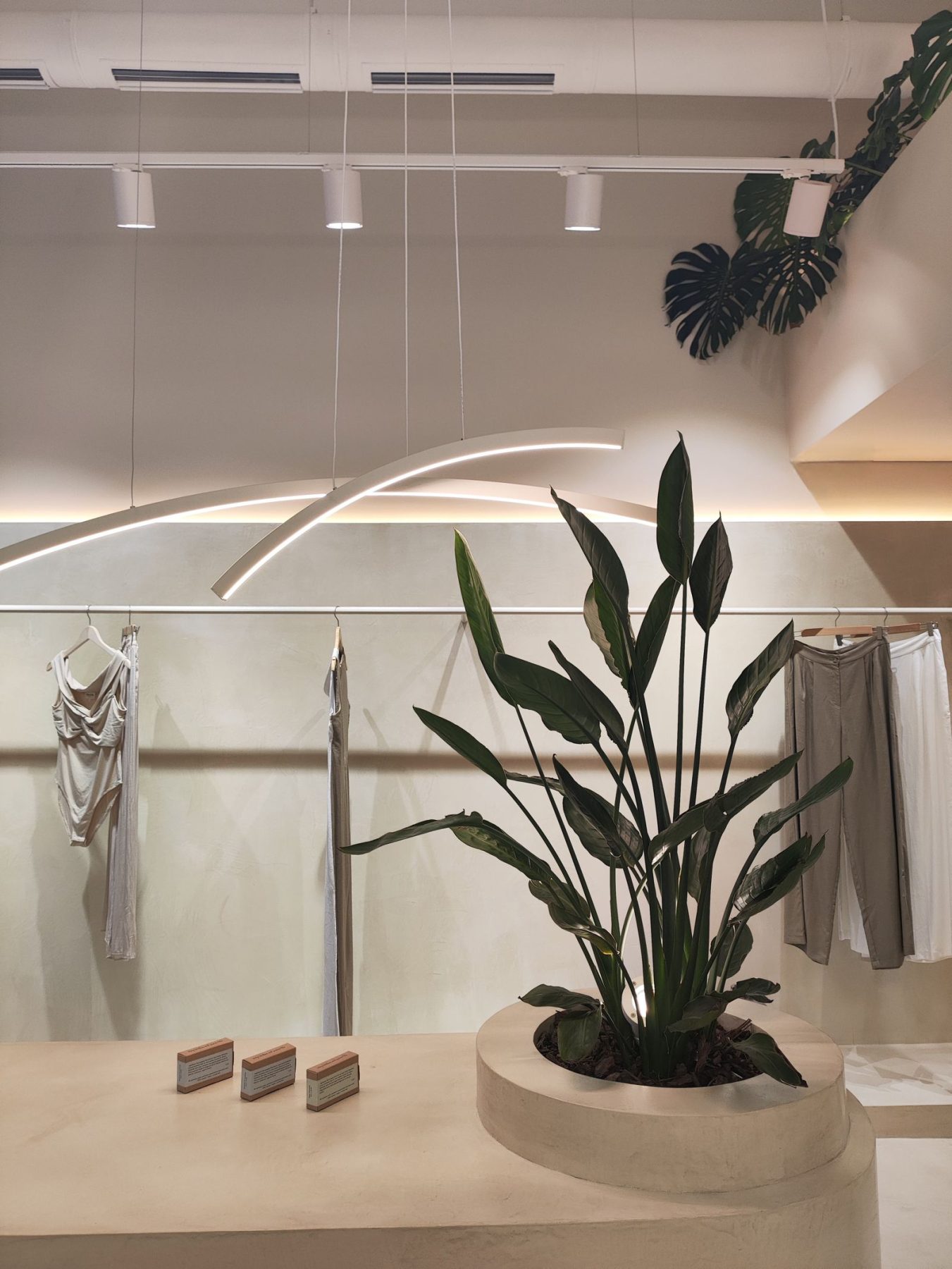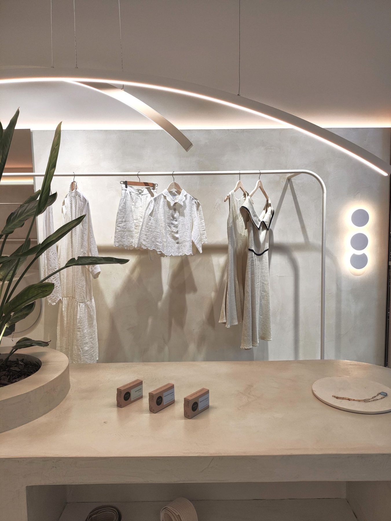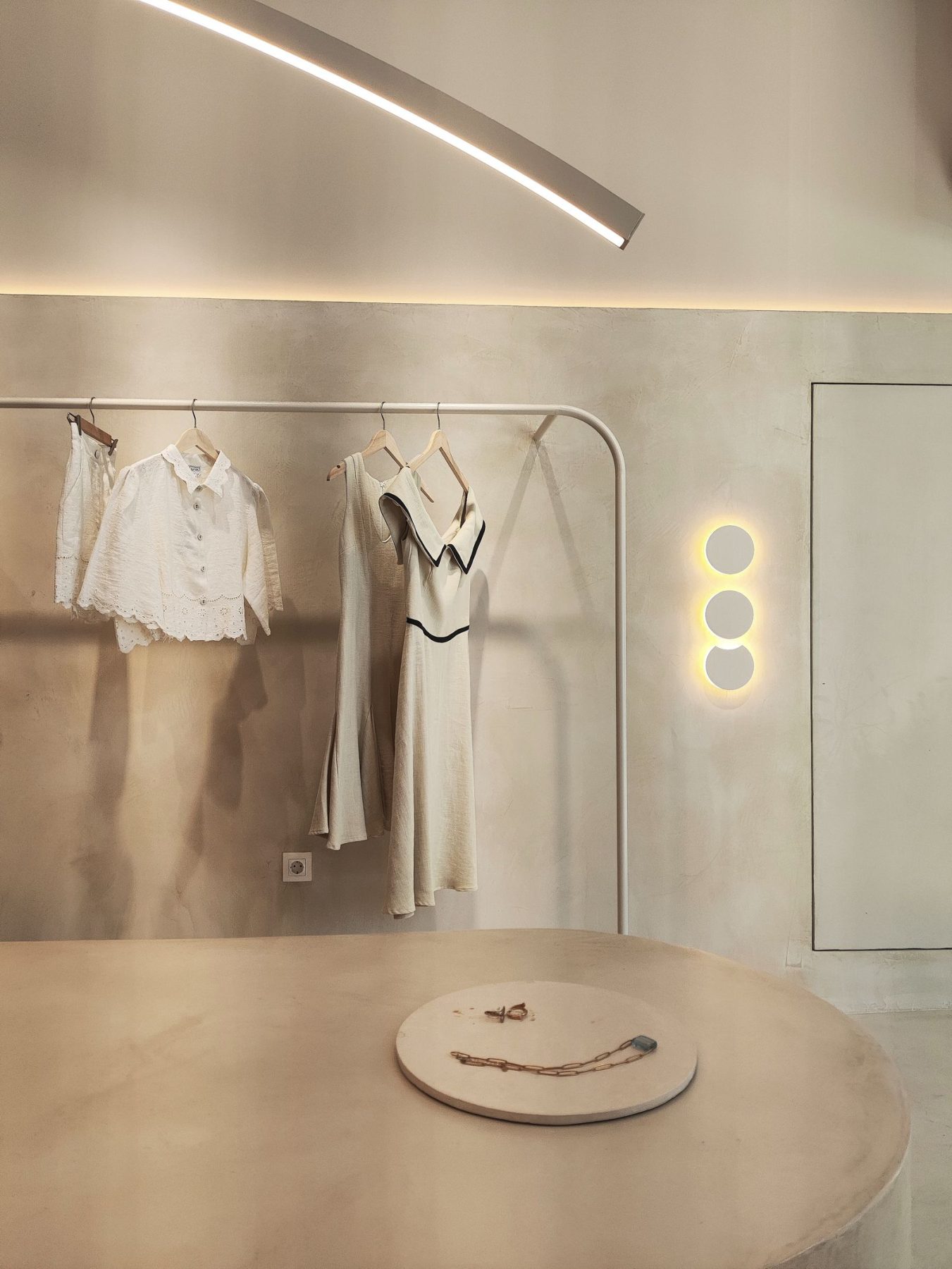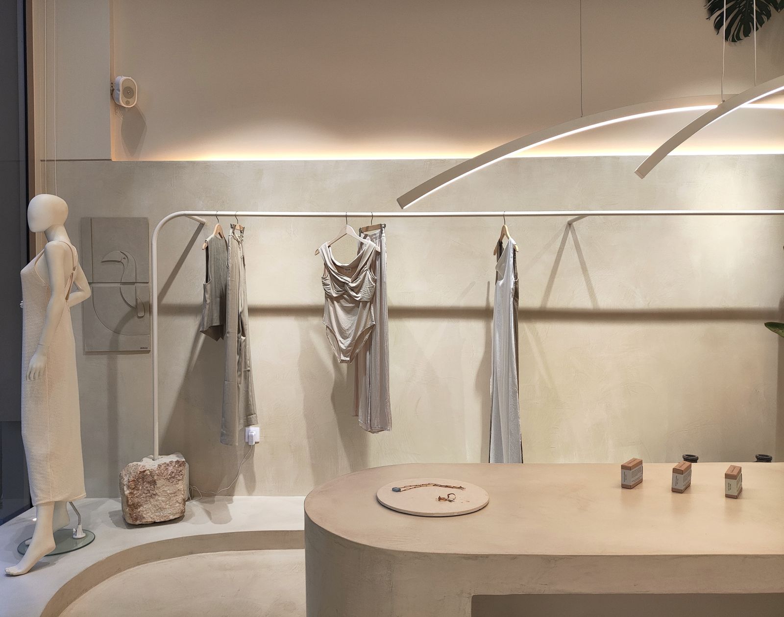 Αυτή η απλότητα των γραμμών και η επιλεγμένη υλικότητα λειτουργούν ταυτόχρονα ως φόντο, αναδεικνύουν τα ρούχα ως πρωταγωνιστές και προσφέρουν στον επισκέπτη μια εμπειρία ηρεμίας, κομψότητας και αισθητικής συνέχειας.