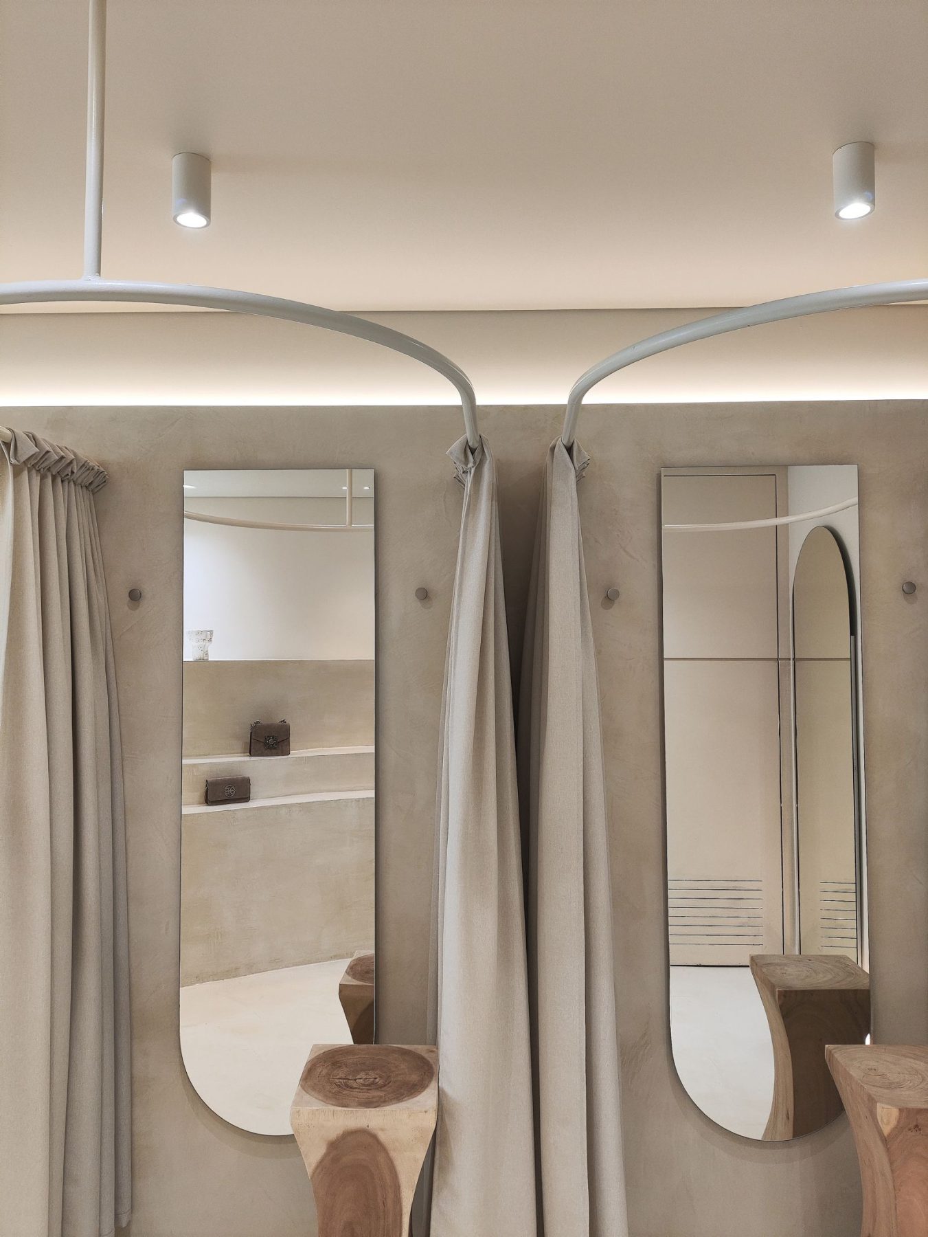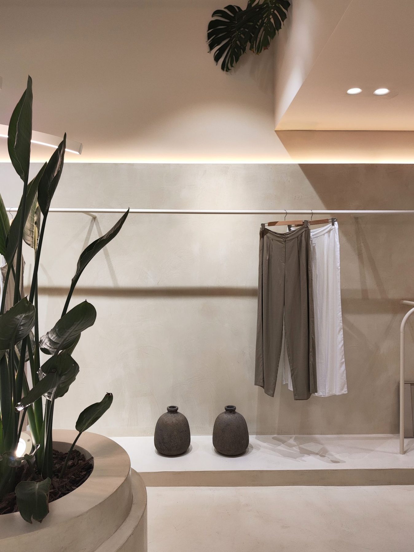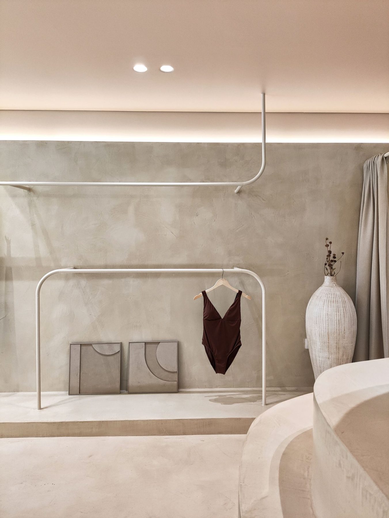 Αυτή η απλότητα των γραμμών και η επιλεγμένη υλικότητα λειτουργούν ταυτόχρονα ως φόντο, αναδεικνύουν τα ρούχα ως πρωταγωνιστές και προσφέρουν στον επισκέπτη μια εμπειρία ηρεμίας, κομψότητας και αισθητικής συνέχειας.