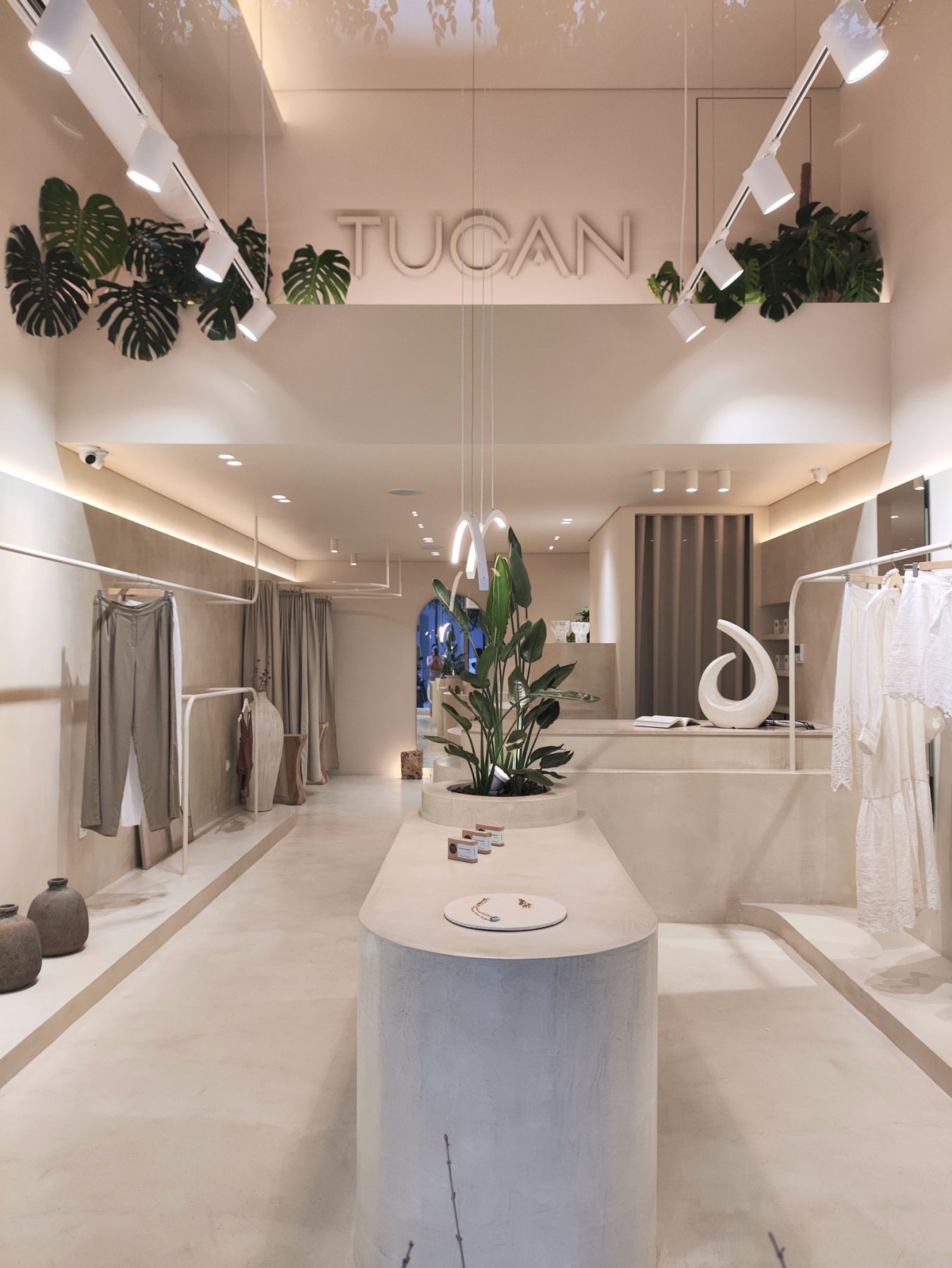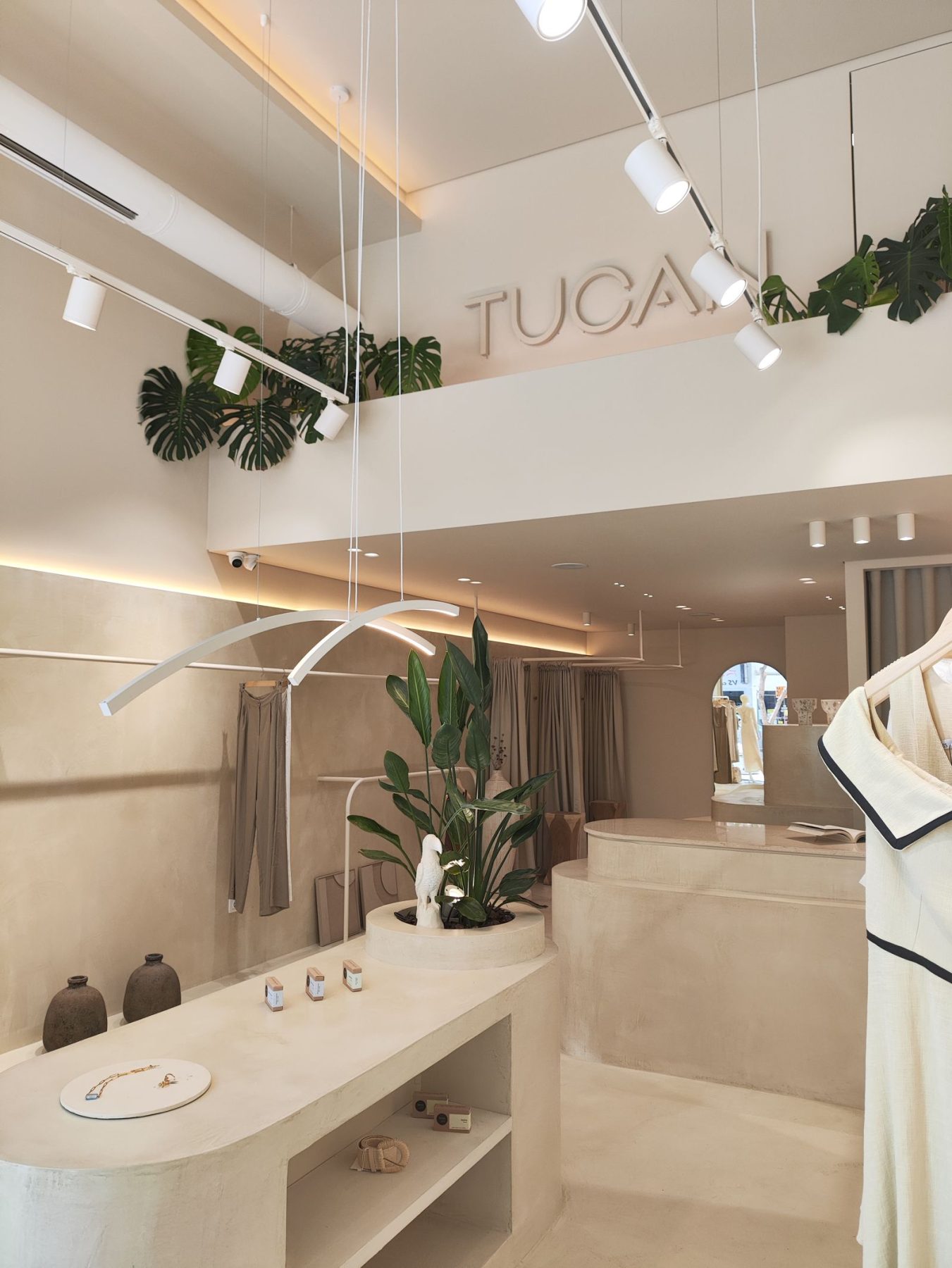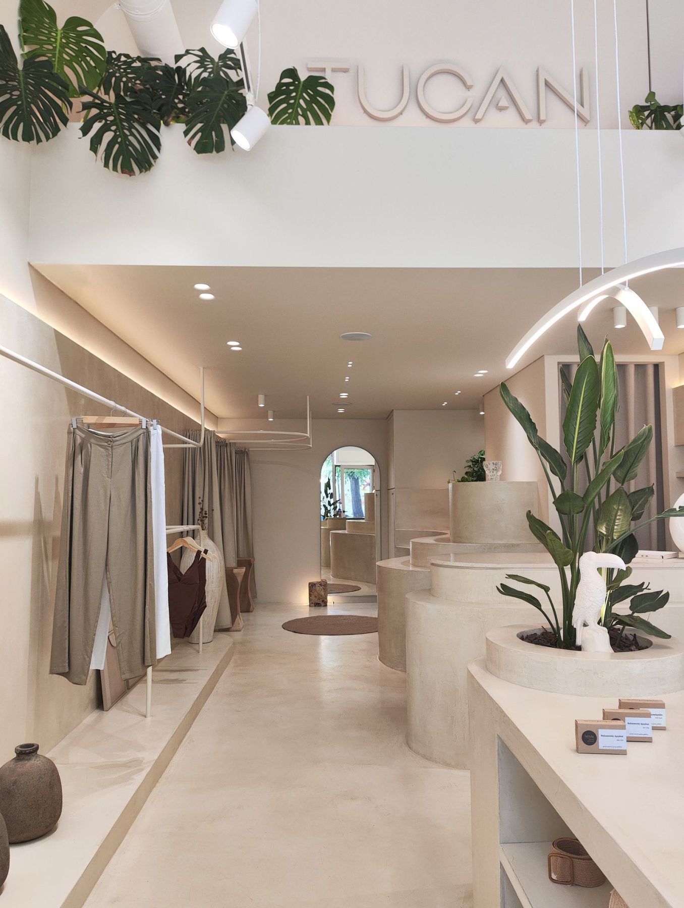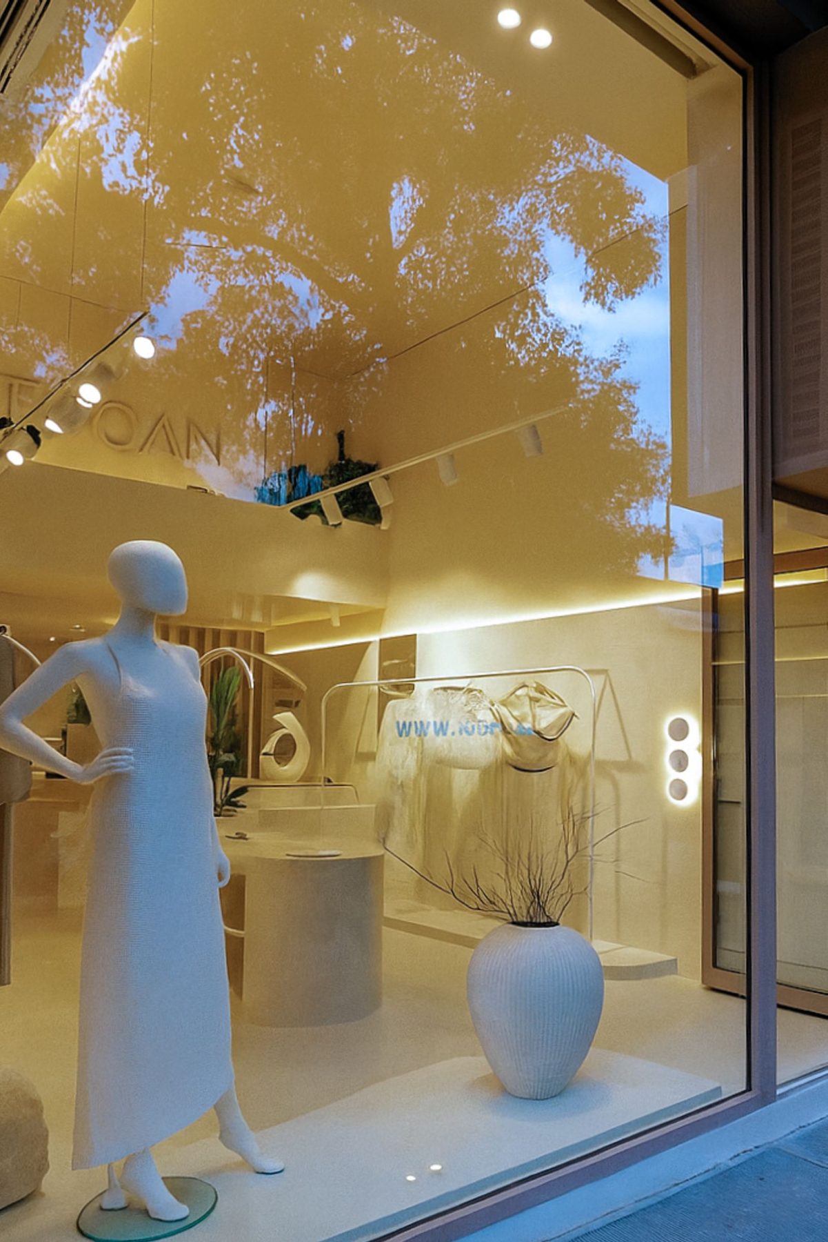 Αυτή η απλότητα των γραμμών και η επιλεγμένη υλικότητα λειτουργούν ταυτόχρονα ως φόντο, αναδεικνύουν τα ρούχα ως πρωταγωνιστές και προσφέρουν στον επισκέπτη μια εμπειρία ηρεμίας, κομψότητας και αισθητικής συνέχειας.