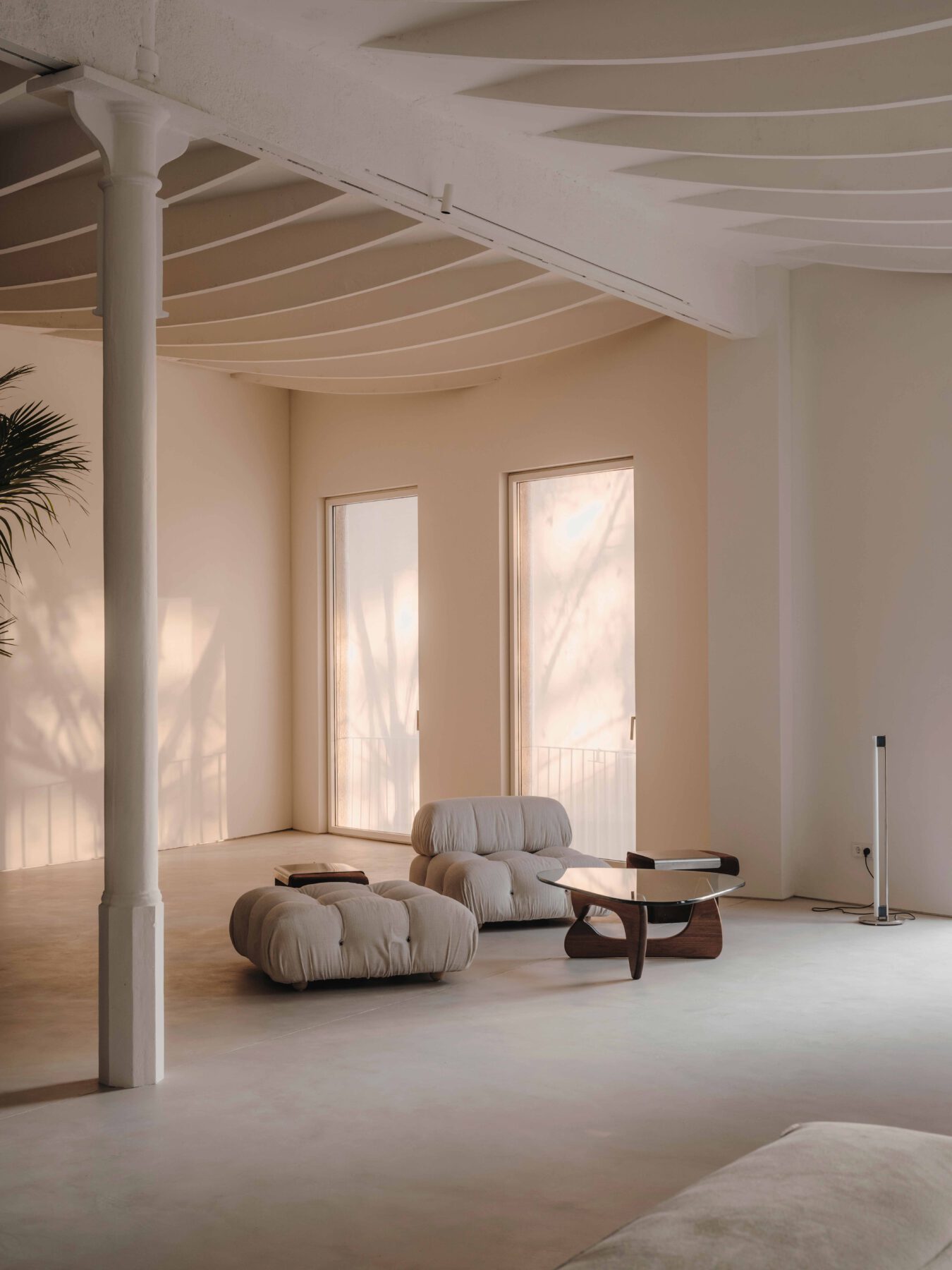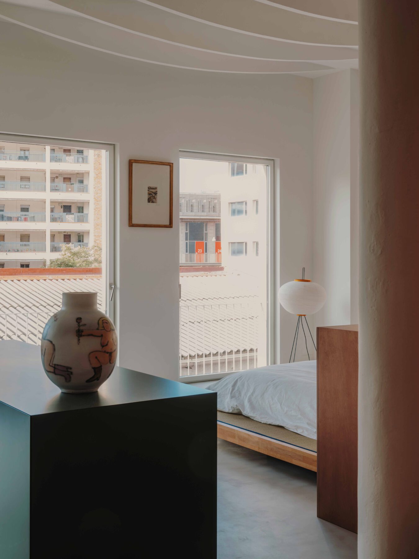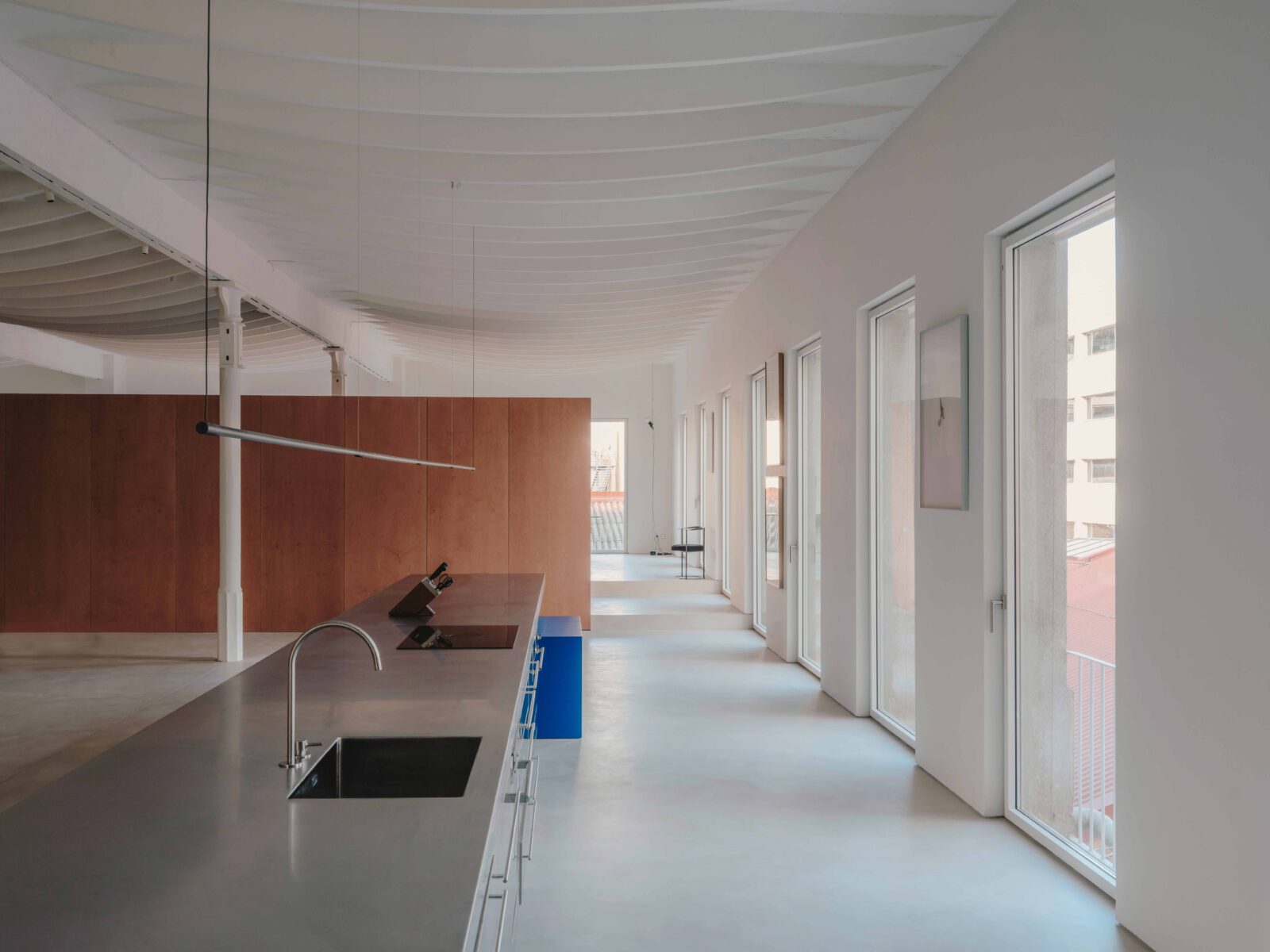 In this setting, the client found a unique industrial space to set up their home and the art gallery they run. The flat features a single generous and diaphanous space with windows on three of its walls and an open plan only interrupted by two rows of steel columns. Its peculiar ceiling reproduces the local construction techniques developed during the 19th century by Catalan architect Joan Torras, who introduced beams of equal strength reinforced by a ceramic core and a vaulted shape.