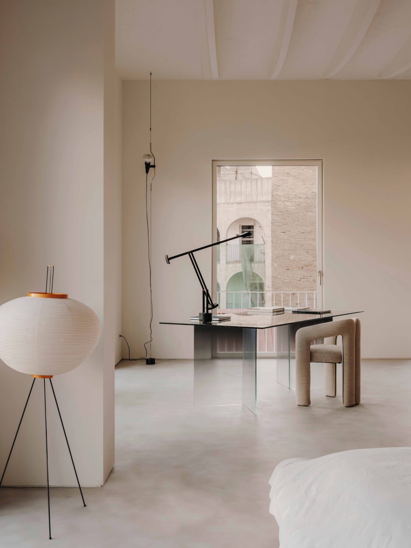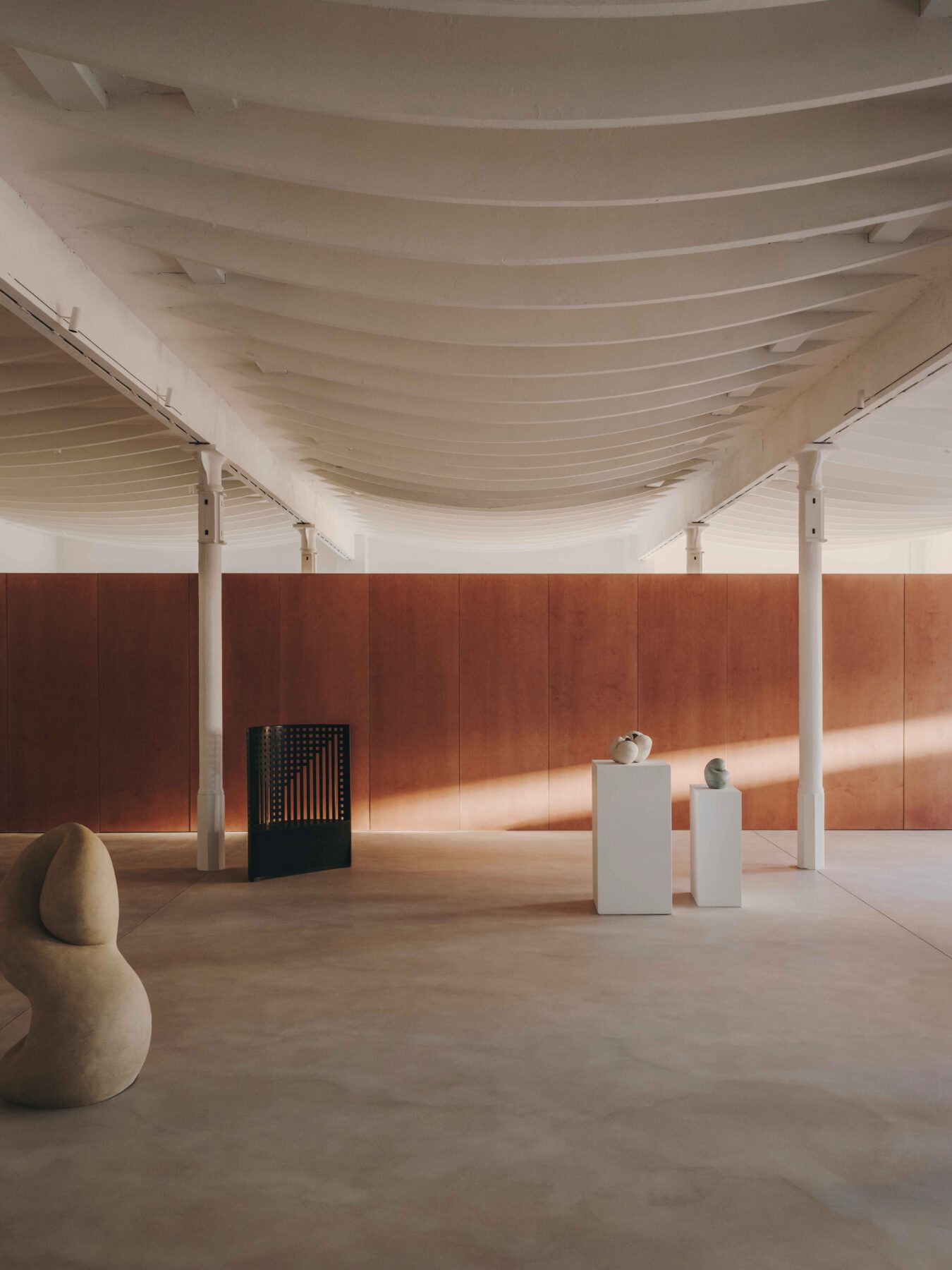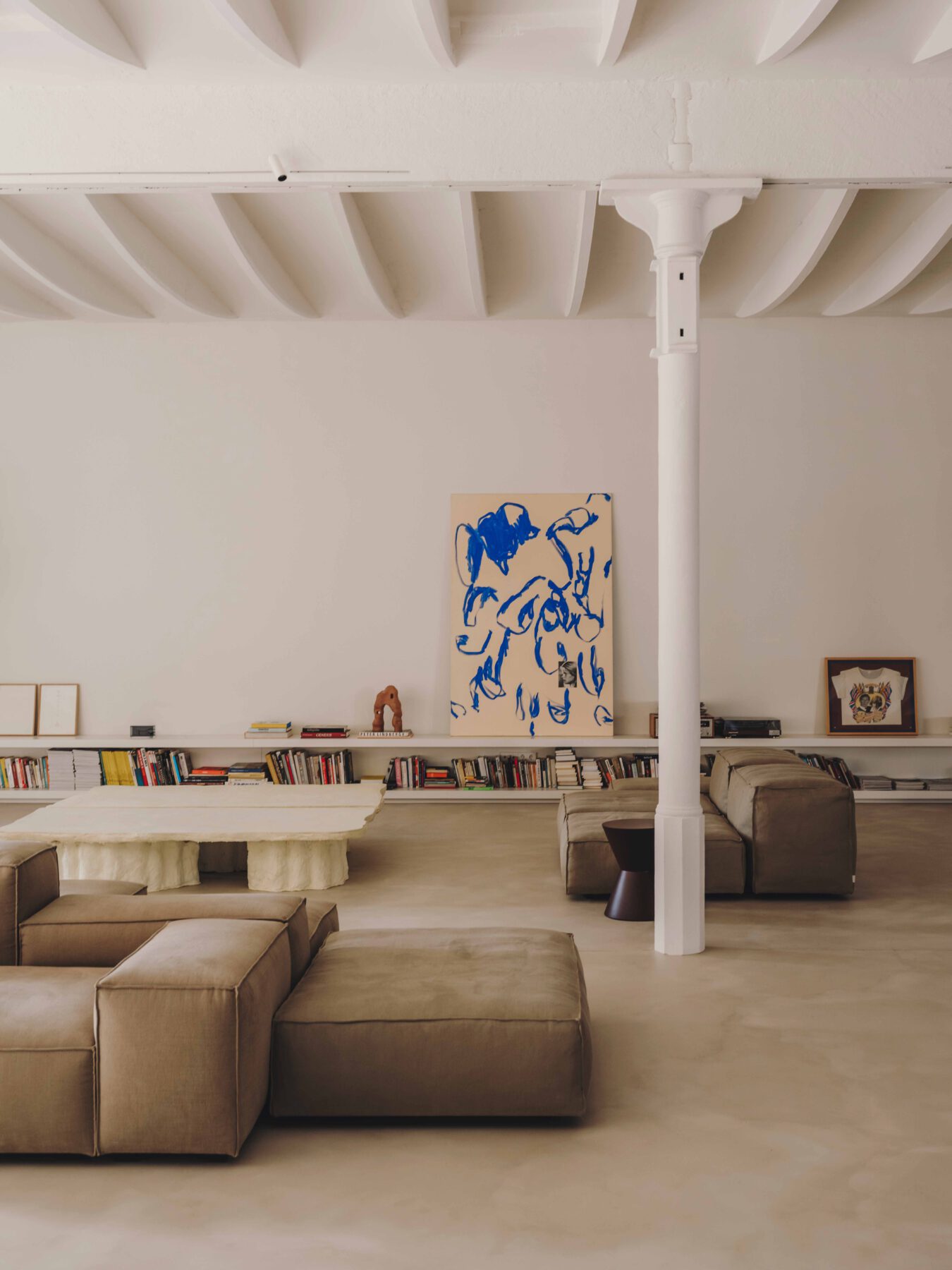 In this setting, the client found a unique industrial space to set up their home and the art gallery they run. The flat features a single generous and diaphanous space with windows on three of its walls and an open plan only interrupted by two rows of steel columns. Its peculiar ceiling reproduces the local construction techniques developed during the 19th century by Catalan architect Joan Torras, who introduced beams of equal strength reinforced by a ceramic core and a vaulted shape.