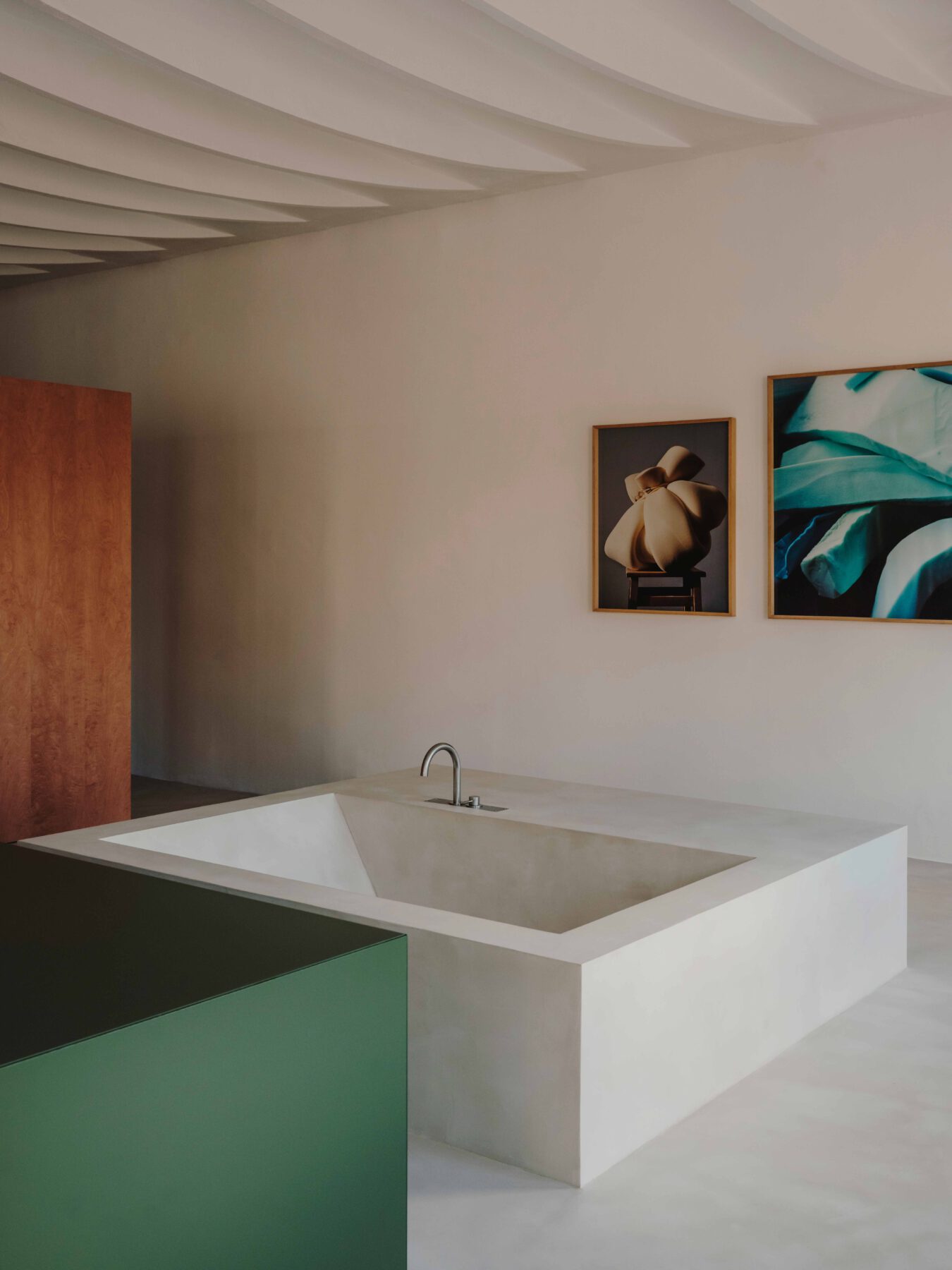 Even though smaller in size and different in its use, the private room follows the boundless premise of the project too: bedroom and bathroom are merged into a single unit, where the bed, bathtub, and sink become loose elements within the room. A shower, a walk-in closet and a toilet are accommodated at the core.