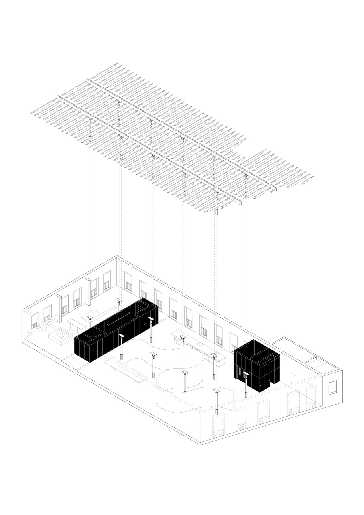 The intervention encompasses two distinct actions. One is the restoration and enhancement of the existing qualities of the space through construction work. The other involves the design of site-specific interior elements offering new capacities.